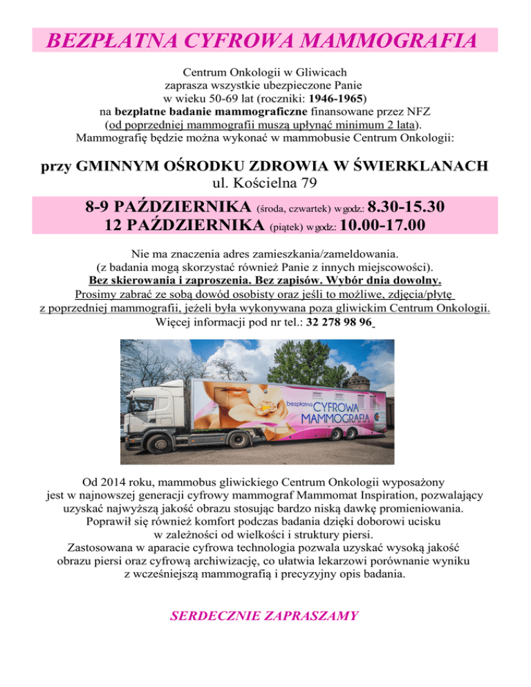 BEZPŁATNA CYFROWA MAMMOGRAFIA Centrum Onkologii w Gliwicach zaprasza wszystkie ubezpieczone Panie w wieku 50-69 lat (roczniki: 1946-1965) na bezpłatne badanie mammograficzne finansowane przez NFZ (od poprzedniej mammografii muszą upłynąć minimum 2 lata). Mammografię będzie można wykonać w mammobusie Centrum Onkologii: przy GMINNYM OŚRODKU ZDROWIA W ŚWIERKLANACH ul. Kościelna 79 8-9 PAŹDZIERNIKA (środa, czwartek) w godz.: 8.30-15.30 12 PAŹDZIERNIKA (piątek) w godz.: 10.00-17.00 Nie ma znaczenia adres zamieszkania/zameldowania. (z badania mogą skorzystać również Panie z innych miejscowości). Bez skierowania i zaproszenia. Bez zapisów. Wybór dnia dowolny. Prosimy zabrać ze sobą dowód osobisty oraz jeśli to możliwe, zdjęcia/płytę z poprzedniej mammografii, jeżeli była wykonywana poza gliwickim Centrum Onkologii. Więcej informacji pod nr tel.: 32 278 98 96 Foto: Przemysław Skóra/Oklejsie.pl. Od 2014 roku, mammobus gliwickiego Centrum Onkologii wyposażony jest w najnowszej generacji cyfrowy mammograf Mammomat Inspiration, pozwalający uzyskać najwyższą jakość obrazu stosując bardzo niską dawkę promieniowania. Poprawił się również komfort podczas badania dzięki doborowi ucisku w zależności od wielkości i struktury piersi. Zastosowana w aparacie cyfrowa technologia pozwala uzyskać wysoką jakość obrazu piersi oraz cyfrową archiwizację, co ułatwia lekarzowi porównanie wyniku z wcześniejszą mammografią i precyzyjny opis badania. SERDECZNIE ZAPRASZAMY