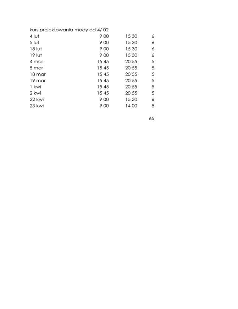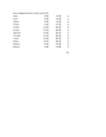 kurs projektowania mody od 4/ 02 4 lut 9 00 5 lut 9 00 18 lut 9 00 19 lut 9 00 4 mar 15 45 5 mar 15 45 18 mar 15 45 19 mar 15 45 1 kwi 15 45 2 kwi 15 45 22 kwi 9 00 23 kwi 9 00 15 30 15 30 15 30 15 30 20 55 20 55 20 55 20 55 20 55 20 55 15 30 14 00 6 6 6 6 5 5 5 5 5 5 6 5 65