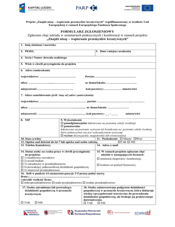 Projekt „Znajdź niszę – wspieranie przemysłów kreatywnych” współfinansowany ze środków Unii Europejskiej w ramach Europejskiego Funduszu Społecznego FORMULARZ ZGŁOSZENIOWY Zgłaszam chęć udziału w seminariach praktycznych i konferencji w ramach projektu „Znajdź niszę – wspieranie przemysłów kreatywnych” 1. Imię (imiona) i nazwisko 2. PESEL 3. Data i miejsce urodzenia 4. Seria i Numer dowodu osobistego 5. Wiek w chwili przystąpienia do projektu 6. Adres zamieszkania województwo: ………………………………. Powiat:…………………………………… ulica: ………………….......………………… nr domu/lokalu:………………………….. miejscowość:………………………………. kod pocztowy:……………… miasto/wieś 7. Adres zameldowania (jeśli inny niż adres zamieszkania) województwo: ………………………………………… powiat: ……………………………..………..… ulica: ……………………………………….................. nr domu/lokalu: ……….………… miejscowość: ………………………………................. kod pocztowy: _ _ - _ _ _ miasto/wieś 9. Wykształcenie ponadgimnazjalne (ukończone na poziomie szkoły średniej) pomaturalne (ukończone na poziomie wyższym niż kształcenie na poziomie szkoły średniej, które jednocześnie nie jest wykształceniem wyższym) wyższe (licencjackie, magisterskie lub równoważne) 11. Pochodzenie Miasto Wieś 10. Stan cywilny TAK NIE 12. Opieka nad dziećmi do lat 7 lub opieka nad osoba zależną 13. Telefon Kontaktowy 14. Adres e-mail 8. NIP 14. Status osoby na rynku pracy w chwili przystąpienia 15. W ramach projektu zgłaszam chęć do projektu: udziału w następujących formach: 1) nieaktywny zawodowo seminaria eksperckie i konferencja 2) uczeń/student 3) zatrudniony w przedsiębiorstwie konkurs na pomysł biznesowy 4) prowadzący jednoosobową działalność gospodarczą 5) właściciel przedsiębiorstwa 16. Jeśli w punkcie 14 zaznaczono pozycje 3-5 proszę podać nazwę firmy:................................................................................... i określić wielkość firmy: mikroprzedsiębiorstwo małe przedsiębiorstwo średnie przedsiębiorstwo 17. Osoba zatrudniona lub prowadząca działalność gospodarczą w przemyśle kreatywnym. TAK NIE 18. Osoba zainteresowana podjęciem działalności gospodarczej w przemyśle kreatywnym, która deklaruje wiedzę i przygotowanie teoretyczne do prowadzenia działalności gospodarczej, ale brakuje jej praktycznego doświadczenia. TAK NIE Projekt „Znajdź niszę – wspieranie przemysłów kreatywnych” współfinansowany ze środków Unii Europejskiej w ramach Europejskiego Funduszu Społecznego 19. Jeśli w punkcie 17 zaznaczono odpowiedź TAK, wymień projekty jakie zostały zrealizowane: ………………………………………………………………………………………………………………………. ………………………………………………………………………………………………………………………. ………………………………………………………………………………………………………………………. Deklaracja uczestnictwa w seminariach praktycznych i konferencji w ramach projektu „Znajdź niszę – wspieranie przemysłów kreatywnych” Deklaruję chęć udziału w seminariach praktycznych, które odbędą się w Toruniu Terminy seminariów: 13.03.2013 (środa) – „Wizerunek. Marka w kryzysie” 10.04.2013 (środa) – „Nowy produkt, nowy rynek” 22.05.2013 (środa) – „Narzędzie finansowania i prowadzenia działalności dla przedsiębiorcy” Deklaruję chęć udziału w seminariach praktycznych, które odbędą się w Gdańsku Terminy seminariów 14.03.2013 (czwartek) – „Wizerunek. Marka w kryzysie” 11.04.2013 (czwartek) – „Nowy produkt, nowy rynek” 23.05.2013 (czwartek) – „Narzędzie finansowania i prowadzenia działalności dla przedsiębiorcy” Deklaruję chęć udziału w konferencji, wieńczącej projekt. Uzasadnienie przystąpienia do projektu: ..................................................................................................................................................................................... ..................................................................................................................................................................................... Planuję startować w konkursie na najlepszy projekt biznesowy Opisz krótko (max. 2 zdania) swój pomysł biznesowy: TAK NIE .................................................................................................................................................................... .................................................................................................................................................................... .................................................................................................................................................................... Załączniki: Deklaracja uczestnictwa w projekcie Oświadczenie uczestnika projektu Zgoda na przetwarzanie danych osobowych Wypełniony test motywacyjny Oświadczenie o chęci założenia działalności gospodarczej Źródło uzyskania informacji o seminarium i konferencji: stoisko promocyjne plakat ulotka radio znajomi inne…………… Świadomy(a) odpowiedzialności karnej za fałszywe zeznania z art. 233 § 1 kodeksu karnego (Dz. U. z 1977, nr 88, poz. 533 z pózn. zm) oświadczam, że podane wyżej informacje są zgodne ze stanem faktycznym. .............................................................................................................. Data, godzina czytelny podpis uczestnika Projekt „Znajdź niszę – wspieranie przemysłów kreatywnych” współfinansowany ze środków Unii 
