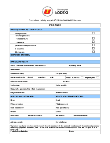 Formularz należy wypełnić DRUKOWANYMI literami PODANIE PROSZĘ O PRZYJĘCIE NA STUDIA: stacjonarne niestacjonarne: - wieczorowe - zaoczne jednolite magisterskie I stopnia II stopnia KIERUNEK STUDIÓW DANE KANDYDATA Seria i numer dokumentu tożsamości: Wydany dnia: Nazwisko: Pierwsze imię: Data urodzenia: Drugie imię: dzień: miesiąc: rok: Płeć: Miejsce urodzenia: Kobieta Mężczyzna PESEL: Imię ojca: Imię matki: Nazwisko panieńskie (dot. mężatek): Obywatelstwo: Narodowość: ADRES ZAMELDOWANIA: ADRES KORESPONDENCYJNY: Kraj: Kraj: Miejscowość: Miejscowość: Kod pocztowy: Kod pocztowy: Ulica: Ulica: Nr domu: Adres e-mail: Nr mieszkania: Nr domu: Nr mieszkania: Nr telefonu: Wyrażam zgodę na przetwarzanie moich danych osobowych dla potrzeb niezbędnych do realizacji procesu rekrutacji (zgodnie z ustawą z dn. 29.08.97 r. o Ochronie Danych Osobowych Dz. Ust. Nr 101 poz. 926 z późn. zm.) Podpis kandydata: Data: