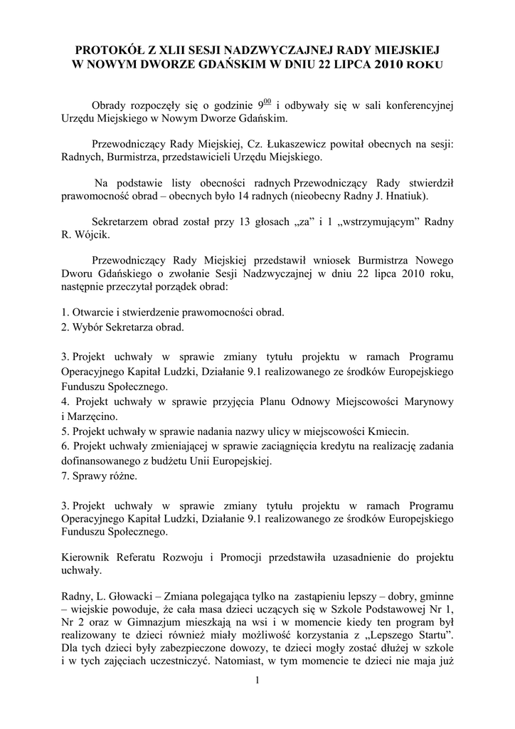 PROTOKÓŁ Z XLII SESJI NADZWYCZAJNEJ RADY MIEJSKIEJ W NOWYM DWORZE GDAŃSKIM W DNIU 22 LIPCA 2010 ROKU Obrady rozpoczęły się o godzinie 900 i odbywały się w sali konferencyjnej Urzędu Miejskiego w Nowym Dworze Gdańskim. Przewodniczący Rady Miejskiej, Cz. Łukaszewicz powitał obecnych na sesji: Radnych, Burmistrza, przedstawicieli Urzędu Miejskiego. Na podstawie listy obecności radnych Przewodniczący Rady stwierdził prawomocność obrad – obecnych było 14 radnych (nieobecny Radny J. Hnatiuk). Sekretarzem obrad został przy 13 głosach „za” i 1 „wstrzymującym” Radny R. Wójcik. Przewodniczący Rady Miejskiej przedstawił wniosek Burmistrza Nowego Dworu Gdańskiego o zwołanie Sesji Nadzwyczajnej w dniu 22 lipca 2010 roku, następnie przeczytał porządek obrad: 1. Otwarcie i stwierdzenie prawomocności obrad. 2. Wybór Sekretarza obrad. 3. Projekt uchwały w sprawie zmiany tytułu projektu w ramach Programu Operacyjnego Kapitał Ludzki, Działanie 9.1 realizowanego ze środków Europejskiego Funduszu Społecznego. 4. Projekt uchwały w sprawie przyjęcia Planu Odnowy Miejscowości Marynowy i Marzęcino. 5. Projekt uchwały w sprawie nadania nazwy ulicy w miejscowości Kmiecin. 6. Projekt uchwały zmieniającej w sprawie zaciągnięcia kredytu na realizację zadania dofinansowanego z budŜetu Unii Europejskiej. 7. Sprawy róŜne. 3. Projekt uchwały w sprawie zmiany tytułu projektu w ramach Programu Operacyjnego Kapitał Ludzki, Działanie 9.1 realizowanego ze środków Europejskiego Funduszu Społecznego. Kierownik Referatu Rozwoju i Promocji przedstawiła uzasadnienie do projektu uchwały. Radny, L. Głowacki – Zmiana polegająca tylko na zastąpieniu lepszy – dobry, gminne – wiejskie powoduje, Ŝe cała masa dzieci uczących się w Szkole Podstawowej Nr 1, Nr 2 oraz w Gimnazjum mieszkają na wsi i w momencie kiedy ten program był realizowany te dzieci równieŜ miały moŜliwość korzystania z „Lepszego Startu”. Dla tych dzieci były zabezpieczone dowozy, te dzieci mogły zostać dłuŜej w szkole i w tych zajęciach uczestniczyć. Natomiast, w tym momencie te dzieci nie maja juŜ 1 takiej szansy. Czy jest szansa, Ŝeby o tych dzieciach pamiętać? Czy te osoby, które są odpowiedzialne za przyznanie środków na realizacje tego programu biorą pod uwagę, Ŝe w gminie Nowy Dwór Gd. I mieście Nowy Dwór Gd. uczą się dzieci mieszkające na wsi? Czy te pieniądze będą równieŜ dla szkół nowodworskich? Kierownik Referatu Rozwoju i Promocji – Państwo juŜ taką uchwałę podejmowaliście. Tak? Jest „prykaz odgórny” by kolejne etapy z osi 1.1 realizować tylko na terenie wiejskim. Dzieci mieszkające w mieście nie mają moŜliwości uczestniczenia w tych zajęciach. Dzieci mieszkające na wsi biorą udział w tym projekcie. Dzieci wiejskie dojeŜdŜające do miasta nie będą brały udziału w tym projekcie, bo w mieście ten projekt nie będzie realizowany. Radny, L. Głowacki – Czy bierze się pod uwagę, Ŝe w następnych etapach jednak będziemy prosili o to, aby te dzieci (to jest prawie 600 osób) mogły wziąć udział w tym programie. Kierownik Referatu Rozwoju i Promocji – Mam nadzieje, Ŝe ten temat był na Radzie poruszany, być moŜe przez Burmistrza Juszczyka. Aby otrzymać pieniądze nie mogliśmy powtórzyć idei z poprzedniego programu. Radny, L. Głowacki – Wzmianki w lokalnych gazetach, uwypuklały iŜ dzieci, które brały udział w tych zajęciach („Lepszy start”) miały znacznie lepsze wyniki z egzaminów w szkołach podstawowych i gimnazjum, patrząc na lata poprzednie. To jest warte tego, aby jak największą ilość dzieci wciągać w ten program. Prosiłbym, aby w następnych edycjach wciągnąć nasze trzy szkoły miejskie. Projekt uchwały poddany został przez Przewodniczącego Rady pod głosowanie. Na sali obecnych było 14 radnych. Ilość głosów: 11 „za”, 1 „przeciw”, 2 „wstrzymujące”. Uchwała otrzymała Numer 348/XLII/2010 rok i stanowi załącznik do protokołu. 4. Projekt uchwały w sprawie przyjęcia Planu Odnowy Miejscowości Marynowy i Marzęcino. Kierownik Referatu Rozwoju i Promocji - Nadarzyła się okazja dofinansowania z PROW i dlatego ten projekt został wprowadzony do porządku obrad. Radny, L. Głowacki – Z Unii Europejskiej dostaniemy pieniądze, a ile wkład gminy będzie wynosił, jeśli beneficjentem są parafie? Kierownik Referatu Rozwoju i Promocji – Gmina nic. Projekt uchwały poddany został przez Przewodniczącego Rady pod głosowanie. Na sali obecnych było 14 radnych. Ilość głosów: 14 „za”. Uchwała otrzymała Numer 349/XLII/2010 rok i stanowi załącznik do protokołu. 2 5. Projekt uchwały w sprawie nadania nazwy ulicy w miejscowości Kmiecin. Przewodniczący Rady Miejskiej – Czy zgodnie z obowiązującymi przepisami jest zgoda wszystkich mieszkańców tej ulicy na nadanie nazwy? Burmistrz - Jest wniosek podpisany przez wszystkich mieszkańców, który traktujemy jako zgodę. Radny, J. Michalski – Czy podjęcie tej uchwały do czegoś później gminę obliguje? Czy dalej jest to teren prywatny? Czy właściciele tej drogi po podjęciu przez nas uchwały nie będą sobie z tego tytułu rościć prawa partycypowania w kosztach np. połoŜenia asfaltu, uzbrojenia terenu? Burmistrz – Jest to tylko uchwała nadająca nazwę ulicy. śadnych zobowiązań, konsekwencji, o których mówił Pan Radny Michalski nie ma, poniewaŜ jest to własność prywatna. Radny, S. Zakrzewski – Ci ludzie, którzy tam się wybudowali nie mogą się tam zameldować jeŜeli nie ma nazwy ulicy. Niezbędna jest nazwa ulicy albo przydział do jakiejś ulicy. Projekt uchwały poddany został przez Przewodniczącego Rady pod głosowanie. Na sali obecnych było 14 radnych. Ilość głosów: 14 „za”. Uchwała otrzymała Numer 350/XLII/2010 rok i stanowi załącznik do protokołu. 6. Projekt uchwały zmieniającej w sprawie zaciągnięcia kredytu na realizację zad