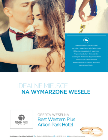 Zawarcie związku małżeńskiego jest jedną z najważniejszych chwil w życiu, która głęboko zapisuje się w pamięci. Pragniemy, aby tego dnia wszystko przebiegało doskonale, aby piękne chwile pozostały nie tylko w Państwa wspomnieniach, ale również w pamięci zaproszonych Gości. IDEALNE MIEJSCE NA WYMARZONE WESELE OFERTA WESELNA Best Western Plus Arkon Park Hotel Best Western Plus Arkon Park Hotel ul. Śląska 10, 80-384 Gdańsk +48 58 731 55 00 [email protected] Możliwość degustacji menu weselnego Zniżki na noclegi dla Gości weselnych Poprawiny od 40 pln/ os. Pełne nagłośnienie i bardzo dobra akustyka sal 81 klimatyzowanych pokoi z możliwością ugoszczenia do 163 osób • Organizacja wesel do 110 osób • Menu od 160 zł/ os. • Możliwość łączenia 2 sal, łącznie o pow. 181 m2 Możemy urozmaicić przyjęcie weselne pieczonym prosiakiem, stołem wiejskim, czekoladowymi fontannami, bufetami słodkości i czymkolwiek co Para Młoda sobie wymarzy, za dodatkową opłatą. Jesteśmy otwarci na propozycję! Pragniemy, aby tego dnia wszystko przebiegało doskonale. TYLKO U NAS! PARA MŁODA, KTÓRA ZORGANIZUJE WESELE: Otrzyma pokój ze śniadaniem w noc poślubną – gratis! Duża możliwość aranżacji sali. Proponujemy organizację przyjęcia przy stołach okrągłych, w tradycyjnym układzie w podkowę lub literę E. Na życzenie przygotujemy winietki oraz menu weselne dla Gości – gratis! Menu Weselne w cenie 180 pln/ osoba Przystawka Plastry polędwiczki wieprzowej w towarzystwie bukietu sałat i sosu tuńczykowego Zupa Rosół z gęsi z domowymi kluseczkami Dania główne serwowane na półmiskach • Filet z łososia w sosie cytrynowo-koperkowym • Roladki z indyka nadziewane szpinakiem, ricottą i suszonymi pomidorami • Zraziki wieprzowe z tradycyjnym farszem w sosie własnym • Ziemniaki gotowane • Ryż • Warzywa gotowane na parze • Zestaw sezonowych surówek, w tym mix świeżych sałat Deser Torcik wiśniowo–czekoladowy podany z sosem waniliowym Bufet szwedzki • Bukiet kolorowych sałat z warzywami sezonowymi i miodowym sosem vinegrette • Sałatka neapolitańska z tuńczykiem, kaparami i jajkiem przepiórczym • Tatar ze śledzia z cebulką i kawiorem • Rybne tymbaliki • Kolorowe roladki z pstrąga glazurowane delikatną galaretą • Deska serów • Schab faszerowany morelami w delikatnej glazurze • Pasztet zapiekany w boczku • Karkówka wędzona na gorąco podana z sosami • Pieczywo • Masło Bufet słodki • Ciasta porcjowane, 3 rodzaje (szarlotka, sernik, sacher) • Panna cotta z musem owocowym Powyżej 30 osób, otrzyma zaproszenie na kolację rocznicową Powyżej 50 osób, otrzyma voucher na weekendowy pobyt dla 2 osób ze śniadaniem w jednym z obiektów Dobry Hotel • Kokosowy pudding z tapioki • Tort – rodzaj i smak do wyboru (płatny dodatkowo w zależności od wagi) Menu Weselne O północy Szaszłyk z szynki wieprzowej i kolorowych warzyw w towarzystwie opiekanych ziemniaków i sosu BBQ Przystawka Tatar z tuńczyka z jajkiem przepiórczym i kawiorem w cenie 210 pln/ osoba Na zakończenie Barszcz z pasztecikiem Zupa Borowikowy krem z łazankami Poprawiny Dania główne serwowane na półmiskach • Duet łososia i pstrąga w sosie winno-maślanym • Polędwiczki wieprzowe gotowane w niskich temperaturach w sosie miodowo-musztardowym • Zrazy wołowe z tradycyjnym farszem w sosie własnym • Ziemniaki gotowane • Ziemniaki pieczone • Ryż • Warzywa gotowane na parze w formie bufetu • Żurek z białą kiełbasą • Pieczeń wieprzowa w ciemnym sosie • Kawałki kurczaka w pikantnym sosie paprykowym • Kasza gryczana • Ziemniaki gotowane • Warzywa grillowane w cenie 40 pln/ osoba • Kapusta zasmażana z boczkiem • Bukiet sałat z sosem vinegrette • Masło • Zimne sosy Deser Parfait z białej czekolady z sosem wiśniowym Bufet słodki • Ciasta porcjowe 3 rodzaje do wyboru przez Państwa Młodych • Mini ptysie • Kruche babeczki z musem czekoladowym • Patera filetowanych owoców sezonowych • Tort – rodzaj i smak do wyboru (płatny dodatkowo w zależności od wagi) Bufet szwedzki • Sałatka grecka • Sałatka z grilowanym kurczakiem, ananasem, kukurydzą i ziołowymi grzankami • Plastry łososia wędzonego na bukiecie sałat z kaparami i balsamicznym kremem • Śledź w trzech smakach • Rybne tymbaliki • Deska serów • Roladki z indyka nadziewane suszonymi owocami w delikatnej glazurze • Polędwiczka wieprzowa faszerowana oliwkami i serem feta • Półmisek mięs pieczonych (karkówka, schab, rostbef) • Pieczywo O północy Plastry indyka w towarzystwie gotowanych warzyw, pęczaku i sosu żurawinowego Na zakończenie Boeuf strogonow Powyższa oferta ma charakter wstępny, na życzenie dostosujemy ją do Państwa indywidualnych potrzeb i budżetu.