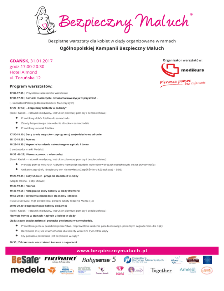 Bezpłatne warsztaty dla kobiet w ciąży organizowane w ramach Ogólnopolskiej Kampanii Bezpieczny Maluch GDAŃSK, 31.01.2017 godz.17:00-20:30 Hotel Almond ul. Toruńska 12 Organizator warsztatów: Program warsztatów: 17.00-17.05 | Przywitanie uczestników warsztatów. 17.05-17.20 |Komórki macierzyste, świadoma inwestycja w przyszłość . [– konsultant Polskiego Banku Komórek Macierzystych] 17.20 -17.50| „Bezpieczny Maluch w podróży” [Kamil Kasiak – ratownik medyczny, instruktor pierwszej pomocy i bezpieczeństwa] Prawidłowy dobór fotelika do samochodu Zasady bezpiecznego przewożenia dziecka w samochodzie Prawidłowy montaż fotelika 17.50-18.10| Geny to nie wszystko – zaprogramuj swoje dziecko na zdrowie 18.10-18.25| Przerwa 18.25-18.35| Wsparcie karmienia naturalnego w szpitalu i domu [- ambasador marki Medela] 18.35 -19.25| Pierwsza pomoc u niemowląt [Kamil Kasiak – ratownik medyczny, instruktor pierwszej pomocy i bezpieczeństwa] Pierwsza pomoc w stanach nagłych u niemowląt (bezdech, ciało obce w drogach oddechowych, utrata przytomności) Unikanie zagrożeń, Bezpieczny sen niemowlęcia (Zespół Śmierci Łóżeczkowej – SIDS) 19.25-19.35| Baby Shower - przyjęcia dla kobiet w ciąży [Magda Wrona - Baby Shower] 19.35-19.45| Przerwa 19.45-19.55| Pielęgnacja skóry kobiety w ciąży [Palmers] 19.55-20.05| Wyprawka-niezbędnik dla mamy i dziecka [Natalia Serówka- mgr położnictwa, położna szkoły rodzenia Mama i ja] 20.05-20.30|Bezpieczeństwo kobiety ciężarnej [Kamil Kasiak – ratownik medyczny, instruktor pierwszej pomocy i bezpieczeństwa] Pierwsza Pomoc w stanach nagłych u kobiet w ciąży Ciąża a pasy bezpieczeństwa i poduszka powietrzna w samochodzie. Prawidłowa jazda w pasach bezpieczeństwa, nieprawidłowe ułożenie pasa biodrowego, poważnym zagrożeniem dla ciąży Bezpieczne miejsca w samochodzie dla kobiety w trzecim trymestrze ciąży Czy poduszka powietrzna jest bezpieczna w ciąży? 20.30| Zakończenie warsztatów i konkurs z nagrodami www. be zpie c zn ym alu c h . pl