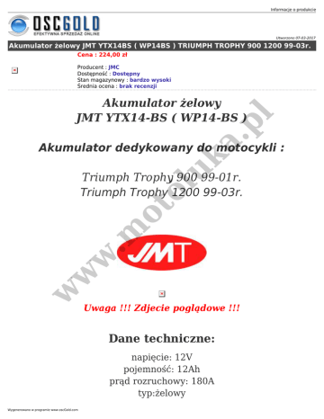Informacje o produkcie Utworzono 07-03-2017 Akumulator żelowy JMT YTX14BS ( WP14BS ) TRIUMPH TROPHY 900 1200 99-03r. Cena : 224,00 zł Producent : JMC Dostępność : Dostępny Stan magazynowy : bardzo wysoki Średnia ocena : brak recenzji a. pl Akumulator żelowy JMT YTX14-BS ( WP14-BS ) uk Akumulator dedykowany do motocykli : w w w .m ot ol Triumph Trophy 900 99-01r. Triumph Trophy 1200 99-03r. Uwaga !!! Zdjecie poglądowe !!! Dane techniczne: napięcie: 12V pojemność: 12Ah prąd rozruchowy: 180A typ:żelowy Wygenerowano w programie www.oscGold.com w w w .m ot ol uk a. pl polaryzacja: lewy plus wymiary: 151x87x145 mm (szerokość/głębokość/wysokość) waga: 4.63 kg