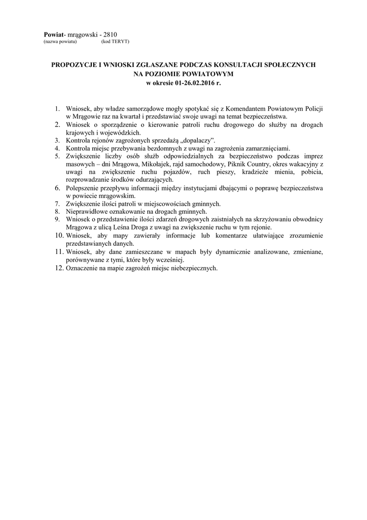 Powiat- mrągowski - 2810 (nazwa powiatu) (kod TERYT) PROPOZYCJE I WNIOSKI ZGŁASZANE PODCZAS KONSULTACJI SPOŁECZNYCH NA POZIOMIE POWIATOWYM w okresie 01-26.02.2016 r. 1. Wniosek, aby władze samorządowe mogły spotykać się z Komendantem Powiatowym Policji w Mrągowie raz na kwartał i przedstawiać swoje uwagi na temat bezpieczeństwa. 2. Wniosek o sporządzenie o kierowanie patroli ruchu drogowego do służby na drogach krajowych i wojewódzkich. 3. Kontrola rejonów zagrożonych sprzedażą „dopalaczy”. 4. Kontrola miejsc przebywania bezdomnych z uwagi na zagrożenia zamarznięciami. 5. Zwiększenie liczby osób służb odpowiedzialnych za bezpieczeństwo podczas imprez masowych – dni Mrągowa, Mikołajek, rajd samochodowy, Piknik Country, okres wakacyjny z uwagi na zwiększenie ruchu pojazdów, ruch pieszy, kradzieże mienia, pobicia, rozprowadzanie środków odurzających. 6. Polepszenie przepływu informacji między instytucjami dbającymi o poprawę bezpieczeństwa w powiecie mrągowskim. 7. Zwiększenie ilości patroli w miejscowościach gminnych. 8. Nieprawidłowe oznakowanie na drogach gminnych. 9. Wniosek o przedstawienie ilości zdarzeń drogowych zaistniałych na skrzyżowaniu obwodnicy Mrągowa z ulicą Leśna Droga z uwagi na zwiększenie ruchu w tym rejonie. 10. Wniosek, aby mapy zawierały informacje lub komentarze ułatwiające zrozumienie przedstawianych danych. 11. Wniosek, aby dane zamieszczane w mapach były dynamicznie analizowane, zmieniane, porównywane z tymi, które były wcześniej. 12. Oznaczenie na mapie zagrożeń miejsc niebezpiecznych.