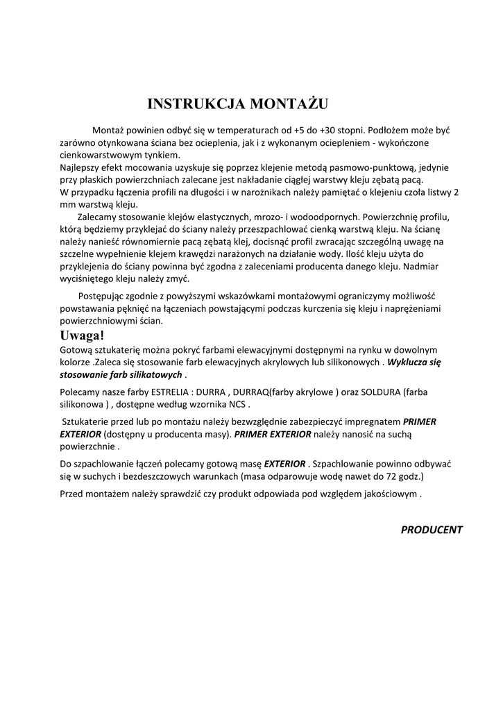 INSTRUKCJA MONTAŻU Montaż powinien odbyć się w temperaturach od +5 do +30 stopni. Podłożem może być zarówno otynkowana ściana bez ocieplenia, jak i z wykonanym ociepleniem - wykończone cienkowarstwowym tynkiem. Najlepszy efekt mocowania uzyskuje się poprzez klejenie metodą pasmowo-punktową, jedynie przy płaskich powierzchniach zalecane jest nakładanie ciągłej warstwy kleju zębatą pacą. W przypadku łączenia profili na długości i w narożnikach należy pamiętać o klejeniu czoła listwy 2 mm warstwą kleju. Zalecamy stosowanie klejów elastycznych, mrozo- i wodoodpornych. Powierzchnię profilu, którą będziemy przyklejać do ściany należy przeszpachlować cienką warstwą kleju. Na ścianę należy nanieść równomiernie pacą zębatą klej, docisnąć profil zwracając szczególną uwagę na szczelne wypełnienie klejem krawędzi narażonych na działanie wody. Ilość kleju użyta do przyklejenia do ściany powinna być zgodna z zaleceniami producenta danego kleju. Nadmiar wyciśniętego kleju należy zmyć. Postępując zgodnie z powyższymi wskazówkami montażowymi ograniczymy możliwość powstawania pęknięć na łączeniach powstającymi podczas kurczenia się kleju i naprężeniami powierzchniowymi ścian. Uwaga! Gotową sztukaterię można pokryć farbami elewacyjnymi dostępnymi na rynku w dowolnym kolorze .Zaleca się stosowanie farb elewacyjnych akrylowych lub silikonowych . Wyklucza się stosowanie farb silikatowych . Polecamy nasze farby ESTRELIA : DURRA , DURRAQ(farby akrylowe ) oraz SOLDURA (farba silikonowa ) , dostępne według wzornika NCS . Sztukaterie przed lub po montażu należy bezwzględnie zabezpieczyć impregnatem PRIMER EXTERIOR (dostępny u producenta masy). PRIMER EXTERIOR należy nanosić na suchą powierzchnie . Do szpachlowanie łączeń polecamy gotową masę EXTERIOR . Szpachlowanie powinno odbywać się w suchych i bezdeszczowych warunkach (masa odparowuje wodę nawet do 72 godz.) Przed montażem należy sprawdzić czy produkt odpowiada pod względem jakościowym . PRODUCENT