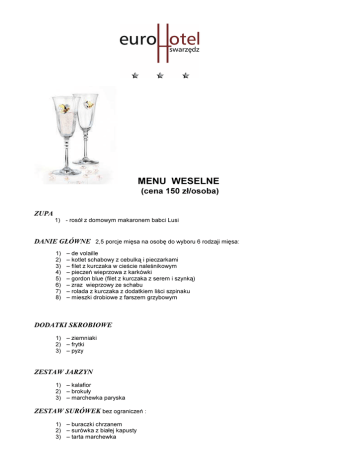 MENU WESELNE (cena 150 zł/osoba) ZUPA 1) - rosół z domowym makaronem babci Lusi DANIE GŁÓWNE 2,5 porcje mięsa na osobę do wyboru 6 rodzaji mięsa: 1) 2) 3) 4) 5) 6) 7) 8) – de volaille – kotlet schabowy z cebulką i pieczarkami – filet z kurczaka w cieście naleśnikowym – pieczeń wieprzowa z karkówki – gordon blue (filet z kurczaka z serem i szynką) – zraz wieprzowy ze schabu – rolada z kurczaka z dodatkiem liści szpinaku – mieszki drobiowe z farszem grzybowym DODATKI SKROBIOWE 1) – ziemniaki 2) – frytki 3) – pyzy ZESTAW JARZYN 1) – kalafior 2) – brokuły 3) – marchewka paryska ZESTAW SURÓWEK bez ograniczeń : 1) – buraczki chrzanem 2) – surówka z białej kapusty 3) – tarta marchewka DESER: 1) – ciasto krojone 2 porcje na osobę (7 rodzajów) ZIMNY BUFET 2,5 porcje na osobę 1) 2) 3) 4) 5) 6) –– schab ze śliwką – galantyna drobiowa – ryba po grecku – szynka ze szparagą – szynka z sałatką – rolada wieprzowa z sosem czosnkowym SAŁATKI 1) – sałatka jarzynowa 2) – grecka + żur staropolski z kiełbasą i jajkiem + ciepłe bułeczki, pieczywo , masełko TORT WESELNY we własnym zakresie ŚNIADANIE 1 porcja na osobę 1) – kiełbasa parzona 2) – bigos myśliwski DODATKI: 1) – barszcz + pieczywo, chrzan, musztarda W CENIE OFERUJEMY: 1) pokój dla Pary Młodej 2) dekoracje stołów ( świecami, tiulem, stożkami) – kwiaty we własnym zakresie 3) napoje ciepłe – kawa, herbata – bez ograniczeń 4) parking monitorowany 5) nie pobieramy opłaty za wniesienie własnego alkoholu DODATKOWE PROPOZYCJE: w cenie 400zł/ szt. (jedna sztuka – 30os) 1) 2) 3) 4) – szynka pieczona – udziec z dzika – indyk pieczony – pokrowce na krzesła - 6 zł/szt. Omówienie MENU weselnego od godz. 10:00 do 16:00 po wcześniejszym telefonicznym uzgodnieniu terminu. Tel. 604405529 / 784019250