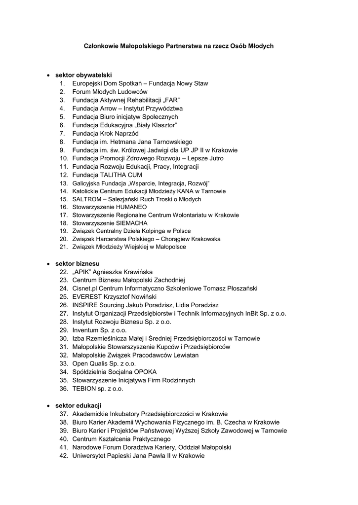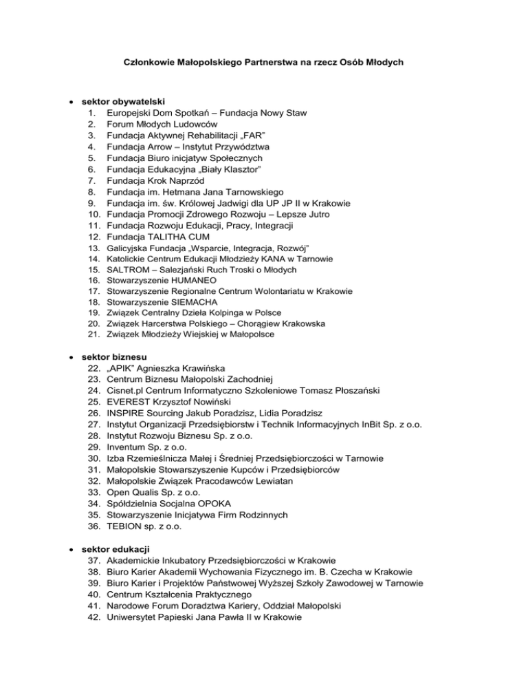 Członkowie Małopolskiego Partnerstwa na rzecz Osób Młodych sektor obywatelski 1. Europejski Dom Spotkań – Fundacja Nowy Staw 2. Forum Młodych Ludowców 3. Fundacja Aktywnej Rehabilitacji „FAR” 4. Fundacja Arrow – Instytut Przywództwa 5. Fundacja Biuro inicjatyw Społecznych 6. Fundacja Edukacyjna „Biały Klasztor” 7. Fundacja Krok Naprzód 8. Fundacja im. Hetmana Jana Tarnowskiego 9. Fundacja im. św. Królowej Jadwigi dla UP JP II w Krakowie 10. Fundacja Promocji Zdrowego Rozwoju – Lepsze Jutro 11. Fundacja Rozwoju Edukacji, Pracy, Integracji 12. Fundacja TALITHA CUM 13. 14. 15. 16. 17. 18. 19. 20. 21. Galicyjska Fundacja „Wsparcie, Integracja, Rozwój” Katolickie Centrum Edukacji Młodzieży KANA w Tarnowie SALTROM – Salezjański Ruch Troski o Młodych Stowarzyszenie HUMANEO Stowarzyszenie Regionalne Centrum Wolontariatu w Krakowie Stowarzyszenie SIEMACHA Związek Centralny Dzieła Kolpinga w Polsce Związek Harcerstwa Polskiego – Chorągiew Krakowska Związek Młodzieży Wiejskiej w Małopolsce sektor biznesu 22. „APIK” Agnieszka Krawińska 23. Centrum Biznesu Małopolski Zachodniej 24. Cisnet.pl Centrum Informatyczno Szkoleniowe Tomasz Płoszański 25. EVEREST Krzysztof Nowiński 26. INSPIRE Sourcing Jakub Poradzisz, Lidia Poradzisz 27. Instytut Organizacji Przedsiębiorstw i Technik Informacyjnych InBit Sp. z o.o. 28. Instytut Rozwoju Biznesu Sp. z o.o. 29. Inventum Sp. z o.o. 30. Izba Rzemieślnicza Małej i Średniej Przedsiębiorczości w Tarnowie 31. Małopolskie Stowarszyszenie Kupców i Przedsiębiorców 32. Małopolskie Związek Pracodawców Lewiatan 33. Open Qualis Sp. z o.o. 34. Spółdzielnia Socjalna OPOKA 35. Stowarzyszenie Inicjatywa Firm Rodzinnych 36. TEBION sp. z o.o. sektor edukacji 37. Akademickie Inkubatory Przedsiębiorczości w Krakowie 38. Biuro Karier Akademii Wychowania Fizycznego im. B. Czecha w Krakowie 39. Biuro Karier i Projektów Państwowej Wyższej Szkoły Zawodowej w Tarnowie 40. Centrum Kształcenia Praktycznego 41. Narodowe Forum Doradztwa Kariery, Oddział Małopolski 42. Uniwersytet Papieski Jana Pawła II w Krakowie 43. 44. 45. 46. 47. 48. Podhalańska Państwowa Wyższa Szkoła Zawodowa w Nowym Targu Politechnika Krakowska Centrum Pedagogiki i Psychologii Powiatowe Centrum Kształcenia Ustawicznego w Chrzanowie Wszechnica UJ Wyższa Szkoła Ubezpieczeń w Krakowie Zespół Szkół Budowlanych nr 1 w Krakowie sektor samorządowy 49. Miejski Ośrodek Pomocy Społecznej w Krakowie 50. Urząd Miasta Krakowa – Wydział Spraw Społecznych 51. Powiatowy Urząd Pracy w Bochni 52. Powiatowy Urząd Pracy w Brzesku 53. Powiatowy Urząd Pracy w Chrzanowie 54. Powiatowy Urząd Pracy w Dąbrowie Tarnowskiej 55. Powiatowy Urząd Pracy w Gorlicach 56. Powiatowy Urząd Pracy w Limanowej 57. Powiatowy Urząd Pracy w Miechowie 58. Powiatowy Urząd Pracy w Myślenicach 59. Powiatowy Urząd Pracy w Nowym Targu 60. Powiatowy Urząd Pracy w Olkuszu 61. Powiatowy Urząd Pracy w Oświęcimiu 62. Urząd Pracy dla Powiatu Nowosądeckiego 63. Sądecki Urząd Pracy 64. Powiatowy Urząd Pracy w Proszowicach 65. Powiatowy Urząd Pracy w Suchej Beskidzkiej 66. Urząd Pracy Powiatu Krakowskiego 67. Grodzki Urząd Pracy w Krakowie 68. Powiatowy Urząd Pracy w Tarnowie 69. Powiatowy Urząd Pracy w Wadowicach 70. Powiatowy Urząd Pracy w Wieliczce 71. Powiatowy Urząd Pracy w Zakopanem 72. Wojewódzki Urząd Pracy w Krakowie 73. Małopolska Wojewódzka Komenda Ochotniczych Hufców Pracy 74. Oddział Małopolski Państwowego Fundusz Rehabilitacji Osób Niepełnosprawnych 75. Okręgowy Inspektorat Służby Więziennej w Krakowie