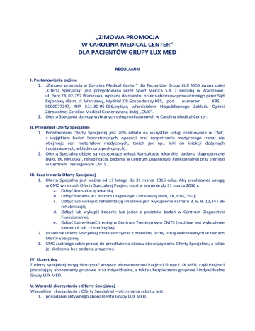 „ZIMOWA PROMOCJA W CAROLINA MEDICAL CENTER” DLA PACJENTÓW GRUPY LUX MED REGULAMIN I. Postanowienia ogólne 1. „Zimowa promocja w Carolina Medical Center” dla Pacjentów Grupy LUX MED zwana dalej „Ofertą Specjalną” jest przygotowana przez Sport Medica S.A. z siedzibą w Warszawie, ul. Pory 78, 02-757 Warszawa, wpisaną do rejestru przedsiębiorców prowadzonego przez Sąd Rejonowy dla m. st. Warszawy, Wydział XIII Gospodarczy KRS, pod numerem KRS 0000077247, NIP 521-30-95-056,będącą właścicielem Niepublicznego Zakładu Opieki Zdrowotnej Carolina Medical Center zwaną dalej „CMC”. 2. Oferta Specjalna dotyczy wybranych usług realizowanych w Carolina Medical Center. II. Przedmiot Oferty Specjalnej 1. Przedmiotem Oferty Specjalnej jest 20% rabatu na wszystkie usługi realizowane w CMC, z wyjątkiem badań laboratoryjnych, operacji oraz zaopatrzenia medycznego (rabat nie obejmuje cen materiałów medycznych, takich jak np.: leki do iniekcji dożylnych i dostawowych, wkładek ortopedycznych). 2. Ofertą Specjalną objęte są następujące usługi: konsultacje lekarskie, badania diagnostyczne (MRI, TK, RM,USG), rehabilitacja, badania w Centrum Diagnostyki Funkcjonalnej oraz treningi w Centrum Treningowym CMTS. III. Czas trwania Oferty Specjalnej 1. Oferta Specjalna jest ważna od 17 lutego do 31 marca 2016 roku. Aby zrealizować usługę w CMC w ramach Oferty Specjalnej Pacjent musi w terminie do 31 marca 2016 r.: a. Odbyć konsultację lekarską b. Odbyć badania w Centrum Diagnostyki Obrazowej (MRI, TK, RTG,USG); c. Odbyć lub wykupić rehabilitację (możliwe jest wykupienie karnetu 3, 6, 9, 12,24 i 36 rehabilitacji); d. Odbyć lub wykupić badanie lub jeden z pakietów badań w Centrum Diagnostyki Funkcjonalnej; e. Odbyć lub wykupić trening w Centrum Treningowym CMTS (możliwe jest wykupienie karnetu 6 lub 12 treningów). 2. Uczestnik Oferty Specjalnej może skorzystać z dowolnej liczby usług realizowanych w ramach Oferty Specjalnej. 3. CMC zastrzega sobie prawo do przedłużenia okresu obowiązywania Oferty Specjalnej, a także jej skrócenia bez podania przyczyny. IV. Uczestnicy Z oferty specjalnej mogą skorzystać wszyscy abonamentowi Pacjenci Grupy LUX MED, czyli Pacjenci posiadający abonamenty grupowe oraz indywidualne, a także ubezpieczenia grupowe i indywidualne Grupy LUX MED. V. Warunki skorzystania z Oferty Specjalnej Warunkiem skorzystania z Oferty Specjalnej – otrzymania rabatu, jest: 1. posiadanie aktywnego abonamentu Grupy LUX MED, 2. zgłoszenie podczas zakupu usługi hasła „zimowa promocja”. VI. Postanowienia końcowe 1. Rabat Oferty Specjalnej nie łączy się z innymi rabatami i zniżkami, w tym rabatami przysługującymi abonamentowym Pacjentom Grupy LUX MED. 2. Wszelkie reklamacje związane z Ofertą Specjalną należy zgłaszać wyłącznie do CMC. 3. W przypadku nie zgłoszenia hasła „zimowa oferta” podczas zakupu usługi w CMC nie przysługuje zwrot rabatu należnego przy skorzystaniu z Oferty Specjalnej. 4. Korzystając z Oferty Specjalnej Uczestnik akceptuje treść niniejszego regulaminu i zobowiązuje się przestrzegać jego postanowień. 5. Niniejszy regulamin jest dostępny do wglądu na stronie www.carolina.pl Warszawa, 17 lutego 2016 r.