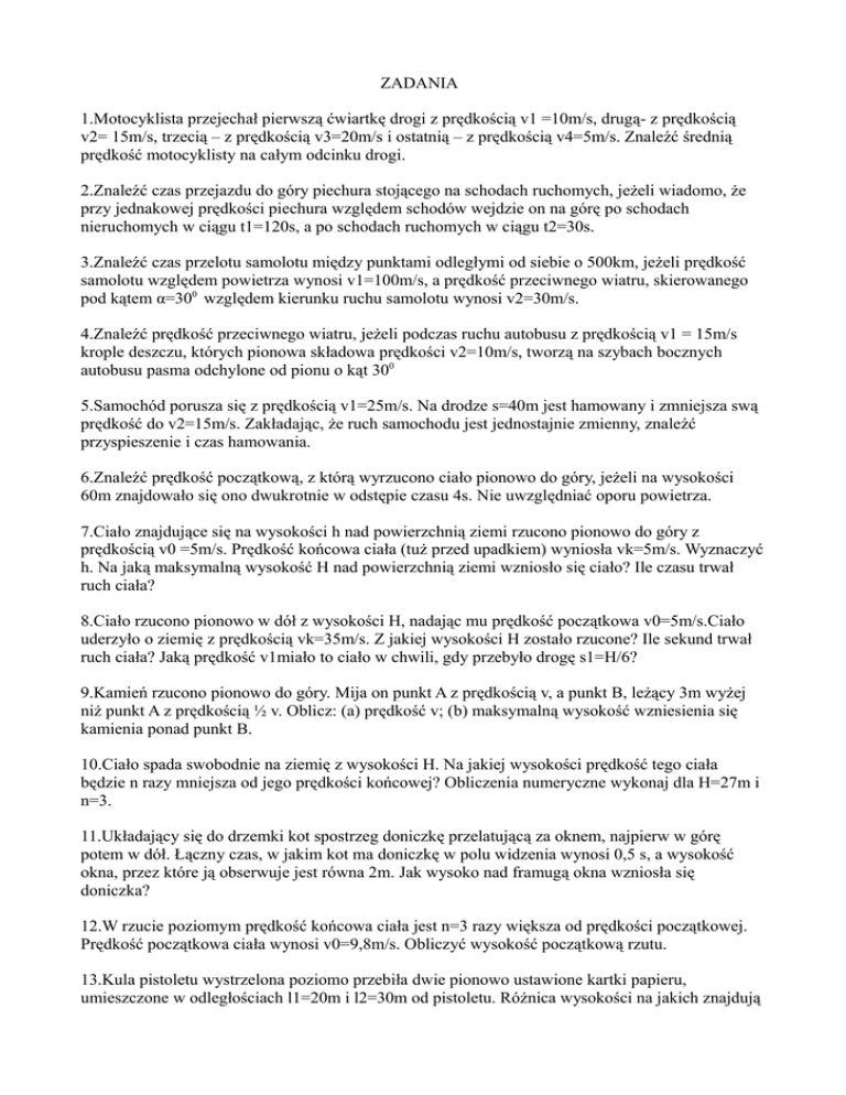 ZADANIA 1.Motocyklista przejechał pierwszą ćwiartkę drogi z prędkością v1 =10m/s, drugą- z prędkością v2= 15m/s, trzecią – z prędkością v3=20m/s i ostatnią – z prędkością v4=5m/s. Znaleźć średnią prędkość motocyklisty na całym odcinku drogi. 2.Znaleźć czas przejazdu do góry piechura stojącego na schodach ruchomych, jeżeli wiadomo, że przy jednakowej prędkości piechura względem schodów wejdzie on na górę po schodach nieruchomych w ciągu t1=120s, a po schodach ruchomych w ciągu t2=30s. 3.Znaleźć czas przelotu samolotu między punktami odległymi od siebie o 500km, jeżeli prędkość samolotu względem powietrza wynosi v1=100m/s, a prędkość przeciwnego wiatru, skierowanego pod kątem α=300 względem kierunku ruchu samolotu wynosi v2=30m/s. 4.Znaleźć prędkość przeciwnego wiatru, jeżeli podczas ruchu autobusu z prędkością v1 = 15m/s krople deszczu, których pionowa składowa prędkości v2=10m/s, tworzą na szybach bocznych autobusu pasma odchylone od pionu o kąt 300 5.Samochód porusza się z prędkością v1=25m/s. Na drodze s=40m jest hamowany i zmniejsza swą prędkość do v2=15m/s. Zakładając, że ruch samochodu jest jednostajnie zmienny, znaleźć przyspieszenie i czas hamowania. 6.Znaleźć prędkość początkową, z którą wyrzucono ciało pionowo do góry, jeżeli na wysokości 60m znajdowało się ono dwukrotnie w odstępie czasu 4s. Nie uwzględniać oporu powietrza. 7.Ciało znajdujące się na wysokości h nad powierzchnią ziemi rzucono pionowo do góry z prędkością v0 =5m/s. Prędkość końcowa ciała (tuż przed upadkiem) wyniosła vk=5m/s. Wyznaczyć h. Na jaką maksymalną wysokość H nad powierzchnią ziemi wzniosło się ciało? Ile czasu trwał ruch ciała? 8.Ciało rzucono pionowo w dół z wysokości H, nadając mu prędkość początkowa v0=5m/s.Ciało uderzyło o ziemię z prędkością vk=35m/s. Z jakiej wysokości H zostało rzucone? Ile sekund trwał ruch ciała? Jaką prędkość v1miało to ciało w chwili, gdy przebyło drogę s1=H/6? 9.Kamień rzucono pionowo do góry. Mija on punkt A z prędkością v, a punkt B, leżący 3m wyżej niż punkt A z prędkością ½ v. Oblicz: (a) prędkość v; (b) maksymalną wysokość wzniesienia się kamienia ponad punkt B. 10.Ciało spada swobodnie na ziemię z wysokości H. Na jakiej wysokości prędkość tego ciała będzie n razy mniejsza od jego prędkości końcowej? Obliczenia numeryczne wykonaj dla H=27m i n=3. 11.Układający się do drzemki kot spostrzeg doniczkę przelatującą za oknem, najpierw w górę potem w dół. Łączny czas, w jakim kot ma doniczkę w polu widzenia wynosi 0,5 s, a wysokość okna, przez które ją obserwuje jest równa 2m. Jak wysoko nad framugą okna wzniosła się doniczka? 12.W rzucie poziomym prędkość końcowa ciała jest n=3 razy większa od prędkości początkowej. Prędkość początkowa ciała wynosi v0=9,8m/s. Obliczyć wysokość początkową rzutu. 13.Kula pistoletu wystrzelona poziomo przebiła dwie pionowo ustawione kartki papieru, umieszczone w odległościach l1=20m i l2=30m od pistoletu. Różnica wysokości na jakich znajdują się otwory w kartkach wynosi h=5cm. Oblicz prędkość początkową kuli. 14.Z wieży o wysokości H=10m wystrzelono z prędkością v=100m/s pocisk, pod kątem α=300 do poziomu. Z jaką prędkością pocisk uderzył o ziemię? Jaki kąt tworzył tor pocisku z płaszczyzną ziemi? Napisz równanie toru pocisku. Oblicz zasięg rzutu. 15.Lotnik, który leci na wysokości h w kierunku poziomym z prędkością vx, upuszcza ładunek, który ma upaść na ziemię w punkcie A. Pod jakim kątem lotnik powinien widzieć cel w chwili upuszczania ładunku, aby ten spadł w punkcie A? Za kąt widzenia celu przyjmij kąt pomiędzy kierunkiem poziomym a linią łączącą samolot z celem. 16.Karabin jest wycelowany w tarczę, odległą od niego o s [m]. Kula trafiła w tarczę d [m] poniżej punktu, w który celowano. Wyznaczyć czas lotu kuli i jej prędkość początkową. 17.Ile obrotów wykonały koła samochodu od początku hamowania do zatrzymania się, jeśli początkowo samochód miał prędkość v0=60 km/h, a czas hamowania t=3s. Jakie było średnie przyspieszenie kątowe kół podczas hamowania? Średnica kół D=0,7m. 18.Podczas ruchu w lufie pocisk wykonuje n pełnych obrotów. Jaka jest prędkość kątowa pocisku, jeśli opuszcza on lufę z prędkością v=860m/s, a długość lufy l=1m? Jakie jest przyspieszenie kątowe pocisku? Znaleźć dla punktów na powierzchni pocisku składowe styczną i normalną przyspieszenia związanego z ruchem obrotowym w chwili wylotu z lufy, jeśli średnica pocisku D=6,5 mm? 19.Samolot poruszający się z prędkością 500m/s, leci po okręgu o promieniu 3km. Oblicz przyspieszenie samolotu. 20.Cząstka obraca się po okręgu o promieniu 3,6m. W pewnej chwili czasu jej przyspieszenie równe 0,21g jest skierowane pod kątem 300 do kierunku ruchu. Znaleźć prędkość cząstki a)w tym momencie ; b) po upływie czasu 2s. Zakładamy, że składowa styczna przyspieszenia jest stała. 21.Wagon o masie 10 ton odczepił się od poruszającego się składu pociągu i przebywając jeszcze drogę 20m ruchem jednostajnie opóźnionym zatrzymał się po upływie 20s. Znaleźć siłę tarcia i efektywny współczynnik tarcia oraz początkową szybkość wagonu. 22.Znaleźć współczynnik tarcia między równią pochyłą i poruszającym się po niej ciałem, jeżeli wiadomo, że ciało to wznosząc się wzdłuż równi pochyłej z szybkością początkową 5m/s przebywa drogę 2m. Kąt nachylenia równi α=300. 23.Na wózku o masie m1=20 kg znajduje się ciężar o masie m2=5 kg. Do ciężaru tego przyłożona jest siła F, nadająca całemu układowi pewne przyspieszenie. Kierunek siły tworzy z poziomem kąt 30 . Jaką maksymalną wartość może mieć przyłożona siła, aby ciężar nie ślizgał się wzdłuż wózka? Współczynnik tarcia cię