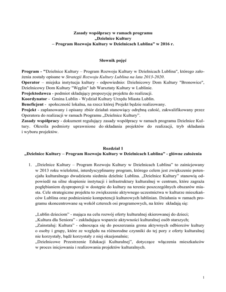 Zasady współpracy w ramach programu „Dzielnice Kultury – Program Rozwoju Kultury w Dzielnicach Lublina” w 2016 r. Słownik pojęć Program - "Dzielnice Kultury – Program Rozwoju Kultury w Dzielnicach Lublina", którego założenia zostały opisane w Strategii Rozwoju Kultury Lublina na lata 2013-2020. Operator – miejska instytucja kultury - odpowiednio: Dzielnicowy Dom Kultury "Bronowice", Dzielnicowy Dom Kultury "Węglin" lub Warsztaty Kultury w Lublinie. Projektodawca - podmiot składający propozycję projektu do realizacji. Koordynator - Gmina Lublin - Wydział Kultury Urzędu Miasta Lublin. Beneficjent - społeczność lokalna, na rzecz której Projekt będzie realizowany. Projekt - zaplanowany i opisany zbiór działań stanowiący odrębną całość, zakwalifikowany przez Operatora do realizacji w ramach Programu „Dzielnice Kultury”. Zasady współpracy - dokument regulujący zasady współpracy w ramach programu Dzielnice Kultury. Określa podmioty uprawnione do składania projektów do realizacji, tryb składania i wyboru projektów. Rozdział 1 „Dzielnice Kultury – Program Rozwoju Kultury w Dzielnicach Lublina” - główne założenia 1. „Dzielnice Kultury – Program Rozwoju Kultury w Dzielnicach Lublina” to zainicjowany w 2013 roku wieloletni, interdyscyplinarny program, którego celem jest zwiększenie potencjału kulturalnego dwudziestu siedmiu dzielnic Lublina. „Dzielnice Kultury” stanowią odpowiedź na silne skupienie instytucji i infrastruktury kulturalnej w centrum, które zagraża pogłębianiem dysproporcji w dostępie do kultury na terenie poszczególnych obszarów miasta. Cele strategiczne projektu to zwiększenie aktywnego uczestnictwa w kulturze mieszkańców Lublina oraz podniesienie kompetencji kulturowych lublinian. Działania w ramach programu skoncentrowane są wokół czterech osi programowych, na które składają się: „Lublin dzieciom” - mająca na celu rozwój oferty kulturalnej skierowanej do dzieci; „Kultura dla Seniora” - zakładająca wsparcie aktywności kulturalnej osób starszych; „Zainstaluj: Kultura” - odnosząca się do poszerzania grona aktywnych odbiorców kultury o osoby i grupy, które ze względu na różnorodne czynniki do tej pory z oferty kulturalnej nie korzystały, bądź korzystały z niej okazjonalnie; „Dzielnicowe Przestrzenie Edukacji Kulturalnej”, dotyczące włączenia mieszkańców w proces inicjowania i realizowania projektów kulturalnych. 1 2. Program jest realizowany przez trzy miejskie instytucje kultury (operatorów programu), którymi są Dzielnicowy Dom Kultury „Bronowice”, Dzielnicowy Dom Kultury „Węglin” oraz Warsztaty Kultury. Każdy z operatorów koordynuje pracę w dziewięciu dzielnicach miasta, w zależności od potrzeb i specyfiki danego obszaru tworząc od podstaw lub doskonaląc i intensyfikując prowadzone w nich działania kulturalne, dążąc do stworzenia kompletnej i spójnej oferty kulturalno-edukacyjnej. Dzielnicowy Dom Kultury "Bronowice" odpowiada za realizację Programu w dzielnicach: Abramowice, Bronowice, Dziesiąta, Felin, Głusk, Hajdów-Zadębie, Kalinowszczyzna, Kośminek, Tatary. Dzielnicowy Dom Kultury "Węglin" - w dzielnicach Czuby Południowe, Czuby Północne, Konstantynów, Sławinek, Sławin, Szerokie, Węglin Południowy, Węglin Północny, Zemborzyce. Warsztaty Kultury realizują program "Dzielnice Kultury" dla następujących obszarów miasta - dzielnice: Czechów Południowy, Czechów Północny, Ponikwoda, Rury, Stare Miasto, Śródmieście, Wieniawa, Wrotków, Za Cukrownią. Rozdział 2 Zasady i tryb składania propozycji projektów do realizacji 3. W 2016 r. odbędzie się jeden nabór Ofert współpracy w dniach od 1 do 20 czerwca 2016 r. Operator zastrzega sobie prawo do ogłoszenia drugiego naboru Ofert współpracy w zależności od aktualnych możliwości finansowych Operatora. 4. Projekty mogą być realizowane od dnia 1 lipca 2016 r. do dnia 30 listopada 2016 r. 5. Propozycje realizacji projektów w ramach Programu mogą składać: a. pełnoletnie osoby fizyczne, b. osoby prawne, c. jednostki organizacyjne nieposiadające osobowości prawnej, d. grupy nieformalne, w skład których wchodzi przynajmniej jedna osoba pełnoletnia. 6. W ramach Programu Projektodawcy mogą składać do realizacji propozycje projektów z zakresu animacji i edukacji kulturalnej, w tym: edukacji artystycznej i medialnej, aktywizacji i integracji społecznej oraz propozycje zakładające zwiększenie kompetencji kulturowych Beneficjentów. Przedkładane propozycje powinny koncentrować się wokół czterech osi Programu i swoim zakresem obejmować obszar działań Operatora. 7. Rodzaje kwalifikujących się działań: zajęcia z zakresu edukacji kulturalnej, artystycznej i medialnej, spotkania, kursy, szkolenia, wystawy, przeglądy, gry miejskie, działania animacyjne wspomagające lokalne społeczności w aktywnościach twórczych, zajęcia i inne formy służące zwiększeniu kompetencji kulturowych. 8. Każdy z Operatorów odpowiedzialny jest za realizację Programu w dziewięciu dzielnicach Lublina. Zgłoszenia projektów do realizacji przyjmują Operatorzy dla właściwych im dziel- nic. 9. Wypełnione i podpisane przez Projektodawcę dokumenty aplikacyjne, zawierające propozycję realizacji projektu, których wzór stanowi Załącznik nr 1 – Oferta współpracy. należy dostarczyć w zaklejonej kopercie z dopiskiem „Dzielnice Kultury 2016” i nazwą podmiotu składającego do siedziby Operatora – Dzielnicowego Domu Kultury „Węglin”, ul. Judyma 2a, 20-716 Lublin , do dnia 20 czerwca 2016 r., do godz. 15:30. (jednocześnie prosimy o wysłanie edytowalnej wersji Oferty na adres mailowy operatora). Dopuszcza się przesłanie skanu podpisanych odręcznie dokumentów na adres poczty elektronicznej: [email protected] 10. Za datę i godzinę złożenia projektu uważa się datę i godzinę jej złożenia w siedzibie Operatora lub d