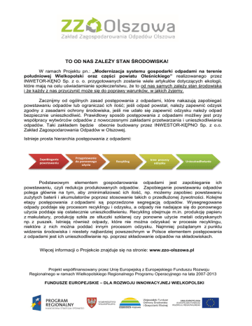 TO OD NAS ZALEŻY STAN ŚRODOWISKA! W ramach Projektu pn.: „Modernizacja systemu gospodarki odpadami na terenie południowej Wielkopolski oraz części powiatu Oleśnickiego” realizowanego przez INWETOR-KĘNO Sp. z o. o. przygotowanych zostanie wiele artykułów dotyczących ekologii, które mają na celu uświadamianie społeczeństwu, że to od nas samych zależy stan środowiska i że każdy z nas przyczynić może się do poprawy warunków, w jakich żyjemy. Zacznijmy od ogólnych zasad postępowania z odpadami, które nakazują zapobiegać powstawaniu odpadów lub ograniczać ich ilość; jeśli odpad powstał, należy zapewnić odzysk zgodny z zasadami ochrony środowiska, jeśli nie udało się zapewnić odzysku należy odpad bezpiecznie unieszkodliwić. Prawidłowy sposób postępowania z odpadami możliwy jest przy współpracy wytwórców odpadów z nowoczesnymi zakładami przetwarzania i unieszkodliwiania odpadów. Taki zakładem będzie obecnie budowany przez INWESTOR-KĘPNO Sp. z o.o. Zakład Zagospodarowania Odpadów w Olszowej. Istnieje prosta hierarchia postępowania z odpadami: Zapobieganie powstawaniu Przygotowanie do ponownego użycia Recykling Inne procesy odzysku Unieszkodliwianie Podstawowym elementem gospodarowania odpadami jest zapobieganie ich powstawaniu, czyli redukcja produkowanych odpadów. Zapobieganie powstawaniu odpadów polega głównie na tym, aby zminimalizować ich ilość, np. możemy zapobiec powstawaniu zużytych baterii i akumulatorów poprzez stosowanie takich o przedłużonej żywotności. Kolejne etapy postępowania z odpadami są poprzedzone segregacją odpadów. Wysegregowane odpady poddaje się procesom recyklingu i odzysku, a odpady nie nadające się do ponownego użycia poddaje się ostatecznie unieszkodliwieniu. Recykling obejmuje m.in. produkcję papieru z makulatury, produkcję szkła ze stłuczki szklanej czy ponowne użycie metali odzyskanych np. z puszek. Istnieją również odpady, które nie można odzyskać w procesie recyklingu, niektóre z nich można poddać innym procesom odzysku. Najmniej pożądanym z punktu widzenia środowiska i niestety najbardziej powszechnym w Polsce elementem postępowania z odpadami jest ich unieszkodliwianie np. poprzez składowanie odpadów na składowiskach. Więcej informacji o Projekcie znajduje się na stronie: www.zzo-olszowa.pl Projekt współfinansowany przez Unię Europejską z Europejskiego Funduszu Rozwoju Regionalnego w ramach Wielkopolskiego Regionalnego Programu Operacyjnego na lata 2007-2013 FUNDUSZE EUROPEJSKIE – DLA ROZWOJU INNOWACYJNEJ WIELKOPOLSKI