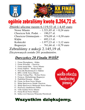 Zbiórki uliczne razem 6.119,53 zł. i 4,45 euro Nowe Miasto – 1.521,05 zł. + 0,24 euro Chocicza Szk. Podst. – 190,57 zł. Chocicza Gimnazjum – 976,89 zł. + 0,30 euro Klęka – 692,13 zł. Kolniczki – 1.977,23 zł. + 3,12 euro Boguszyn – 761,66 zł. + 0,79 euro Zebraliśmy z aukcji 2.145,19 zł. Zlicytowanych zostało 201 przedmiotów. Darczyńcy 20 Finału WOŚP 1. 2. 3. 4. 5. 6. 7. 8. 9. 10. 11. 12. 13. 14. 15. 16. Firma Phytopharm – Klęka Firma Wesołek – Chocicza Firma Instal-Met – Nowe Miasto Firma NakPol – Wolica Pusta Dom dla Bezdomnych w Dębnie BPG i GOK Nowe Miasto Firma Verkap Plus - Wolica Nowa Ferma p. Michalskiego Buguszyn ParkHotel Rosana – Klęka Firma An Rom Nowe Miasto Sklep Spożywczy Siejak Chocicza Sklep Spożywczy Banaszak Nowe Miasto Przewozy autobusowe Stiller Villa Garden Nowe Miasto Firma Rival Nowe Miasto Sołtys wsi Chocicza Wincenty Pawelczyk