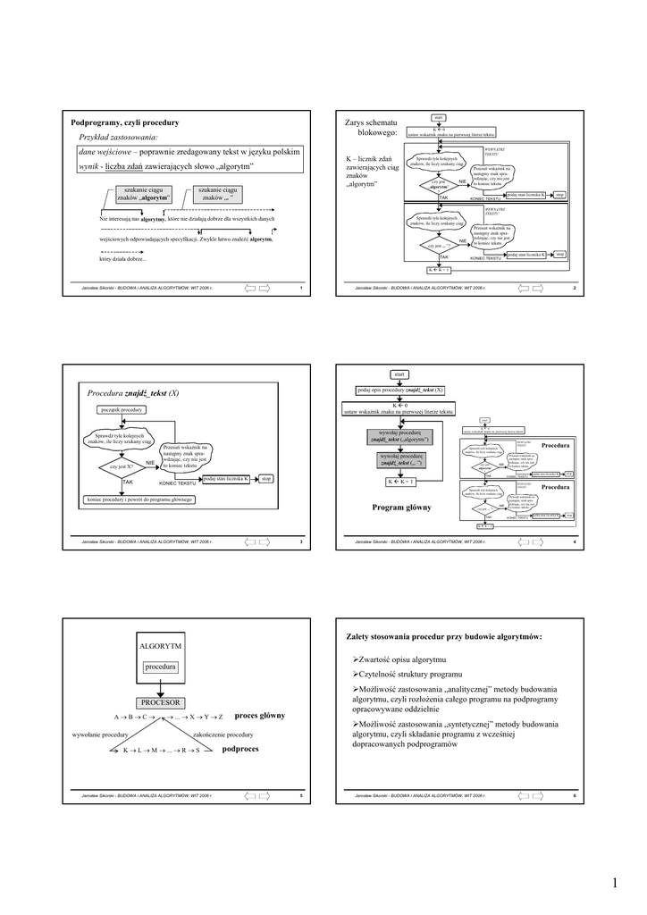 Podprogramy, czyli procedury Zarys schematu blokowego: Przykład zastosowania: start K0 ustaw wskaźnik znaku na pierwszej literze tekstu WEWNĄTRZ TEKSTU dane wejściowe – poprawnie zredagowany tekst w języku polskim K – licznik zdań zawierających ciąg znaków „algorytm” wynik - liczba zdań zawierających słowo „algorytm” szukanie ciągu znaków „algorytm” szukanie ciągu znaków „. ” Sprawdź tyle kolejnych znaków, ile liczy szukany ciąg czy jest „algorytm” ? TAK NIE Przesuń wskaźnik na następny znak sprawdzając, czy nie jest to koniec tekstu podaj stan licznika K stop KONIEC TEKSTU WEWNĄTRZ TEKSTU Sprawdź tyle kolejnych znaków, ile liczy szukany ciąg Nie interesują nas algorytmy, które nie działają dobrze dla wszystkich danych wejściowych odpowiadających specyfikacji. Zwykle łatwo znaleźć algorytm, NIE czy jest „. ”? TAK który działa dobrze... Przesuń wskaźnik na następny znak sprawdzając, czy nie jest to koniec tekstu podaj stan licznika K stop KONIEC TEKSTU KK+1 Jarosław Sikorski - BUDOWA i ANALIZA ALGORYTMÓW, WIT 2006 r. 1 Jarosław Sikorski - BUDOWA i ANALIZA ALGORYTMÓW, WIT 2006 r. 2 start podaj opis procedury znajdź_tekst (X) Procedura znajdź_tekst (X) K0 ustaw wskaźnik znaku na pierwszej literze tekstu początek procedury start wywołaj procedurę znajdź_tekst („algorytm”) Sprawdź tyle kolejnych znaków, ile liczy szukany ciąg czy jest X? NIE Przesuń wskaźnik na następny znak sprawdzając, czy nie jest to koniec tekstu WEWNĄTRZ TEKSTU Procedura Sprawdź tyle kolejnych znaków, ile liczy szukany ciąg wywołaj procedurę znajdź_tekst („. ”) podaj stan licznika K TAK K0 ustaw wskaźnik znaku na pierwszej literze tekstu stop czy jest „algorytm” ? TAK NIE podaj stan licznika K WEWNĄTRZ TEKSTU Procedura Sprawdź tyle kolejnych znaków, ile liczy szukany ciąg koniec procedury i powrót do programu głównego Program główny NIE czy jest „. ”? TAK stop KONIEC TEKSTU KK+1 KONIEC TEKSTU Przesuń wskaźnik na następny znak sprawdzając, czy nie jest to koniec tekstu Przesuń wskaźnik na następny znak sprawdzając, czy nie jest to koniec tekstu podaj stan licznika K stop KONIEC TEKSTU KK+1 Jarosław Sikorski - BUDOWA i ANALIZA ALGORYTMÓW, WIT 2006 r. 3 Jarosław Sikorski - BUDOWA i ANALIZA ALGORYTMÓW, WIT 2006 r. 4 Zalety stosowania procedur przy budowie algorytmów: ALGORYTM Zwartość opisu algorytmu procedura Czytelność struktury programu Możliwość zastosowania „analitycznej” metody budowania algorytmu, czyli rozłożenia całego programu na podprogramy opracowywane oddzielnie PROCESOR A→B→C→ wywołanie procedury → ... → X → Y → Z proces główny Możliwość zastosowania „syntetycznej” metody budowania algorytmu, czyli składanie programu z wcześniej dopracowanych podprogramów zakończenie procedury K → L → M → ... → R → S Jarosław Sikorski - BUDOWA i ANALIZA ALGORYTMÓW, WIT 2006 r. podproces 5 Jarosław Sikorski - BUDOWA i ANALIZA ALGORYTMÓW, WIT 2006 r. 6 1 REKURENCJA Idea rozwiązania rekurencyjnego: Wywołanie procedury wewnątrz niej samej 1. Problem „wież Hanoi” dla N krążków: 2. T(N−1) 1 3. 4. T(N−1) dane wejściowe - trzy kołki i N krążków o różnych średnicach wynik - sekwencja ruchów przenosząca krążki z pierwszego kołka na kołek trzeci zgodnie z zadanymi regułami Jarosław Sikorski - BUDOWA i ANALIZA ALGORYTMÓW, WIT 2006 r. 7 Jarosław Sikorski - BUDOWA i ANALIZA ALGORYTMÓW, WIT 2006 r. 8 Rozwiązanie algorytmiczne: A B Procedura przenieś (N) krążków z (X) na (Y) używając (Z) 1. jeśli N = 1, to wypisz ruch „X → Y”, 2. w przeciwnym razie (tj. jeśli N > 1) wykonaj co następuje: 2.1. Wywołaj procedurę przenieś (N – 1) krążków z (X) na (Z) używając (Y), 2.2. Wypisz ruch „X → Y”, 2.1. Wywołaj procedurę przenieś (N – 1) krążków z (Z) na (Y) używając (X), 3. wróć do poziomu wywołania procedury. C Oznaczmy przez X → Y przeniesienie szczytowego krążka z kołka X na Y Wynik dla N = 3: A → B, A → C, B → C, A → B, C → A, C → B, A → B Jarosław Sikorski - BUDOWA i ANALIZA ALGORYTMÓW, WIT 2006 r. 9 Jarosław Sikorski - BUDOWA i ANALIZA ALGORYTMÓW, WIT 2006 r. Poziomy: 10 Stop Start Rozwiązanie dla trzech krążków: Przenieś 3 z A na B używając C 1. dla N = 3 Przenieś 2 z A na C używając B 2. dla N = 2 A B C 3. Przenieś 1 z A na B używając C A→C Przenieś 2 z C na B używając A A→B Przenieś 1 z B na C używając A Przenieś 1 z C na A używając B B→C C→A C→B Przenieś 1 z A na B używając C dla N = 1 Wywołaj procedurę A→B A→B przenieś (3) krążki z (A) na (B) używając (C) A→B A→C B→C A→B C→A C→B A→B 1 2 3 4 5 6 7 wywołanie Jarosław Sikorski - BUDOWA i ANALIZA ALGORYTMÓW, WIT 2006 r. 11 powrót na poziom wywołania Jarosław Sikorski - BUDOWA i ANALIZA ALGORYTMÓW, WIT 2006 r. proste następstwo 12 2 STRUKTURY DANYCH Przykładowe typy zmiennych (i danych): Elementy zbioru danych wejściowych, które opisują konkretny przypadek problemu algorytmicznego (zadanie) muszą zostać zapisane w pamięci (operacyjnej) przed rozpoczęciem działania algorytmu liczbowy (całkowity, rzeczywisty), znakowy (pojedynczy symbol z przyjętego alfabetu, ciąg symboli), Podstawową formą zapisania pojedynczego elementu zbioru danych, np. a, w pamięci jest utworzenie w niej zmiennej (pamięciowej), np. X, i przypisanie tego elementu jako jej wartości: X ← a wskaźnikowy (adres, pod którym można znaleźć w pamięci inną zmienną określonego typu) Odczytanie elementu z pamięci symbolizowane jest przez odwołanie się do wartości zmiennej: Zmienna ma nadaną nazwę, np. X i określony typ. np. X ← Y oznacza odczytanie z pamięci elementu będącego aktualną wartością zmiennej Y i przypisanie go zmiennej X; Zmienna symbolizuje pewien obszar pamięci, w którym można wielokrotnie zapamiętywać i z którego można odczy