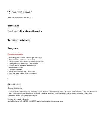 www.szkolenia.wolterskluwer.pl Szkolenie: Język rosyjski w sferze finansów Terminy i miejsce: Program Program szkolenia ● ● ● ● ● ● ● ● ● Język rosyjski w sferze biznesu. Jak się uczyć? Dokumentacja bankowa i finansowa Ubezpieczenia, dokumentacja ubezpieczeniowa Korespondencja finansowa i podatkowa O słownikach i źródłach terminologii Błędne tłumaczenia Żargon finansowy Wskaźniki ekonomiczne i finansowe Wybrane zagadnienia z rachunkowości ● Prelegenci Oksana Kosachenko Absolwentka filologii rosyjskiej oraz angielskiej, Wyższa Szkoła Pedagogiczna, Poltawa (Ukraina) oraz MBA (AE Wrocław). Lektor Wyższej Szkoły Bankowej w Poznaniu (oddział Chorzów), tłumacz z wieloletnim doświadczeniem, autor oraz konsultant słowników specjalistycznych. Kontakt w sprawie szkolenia: Agata Fiodorow, tel. +48 22 535 80 99, [email protected]