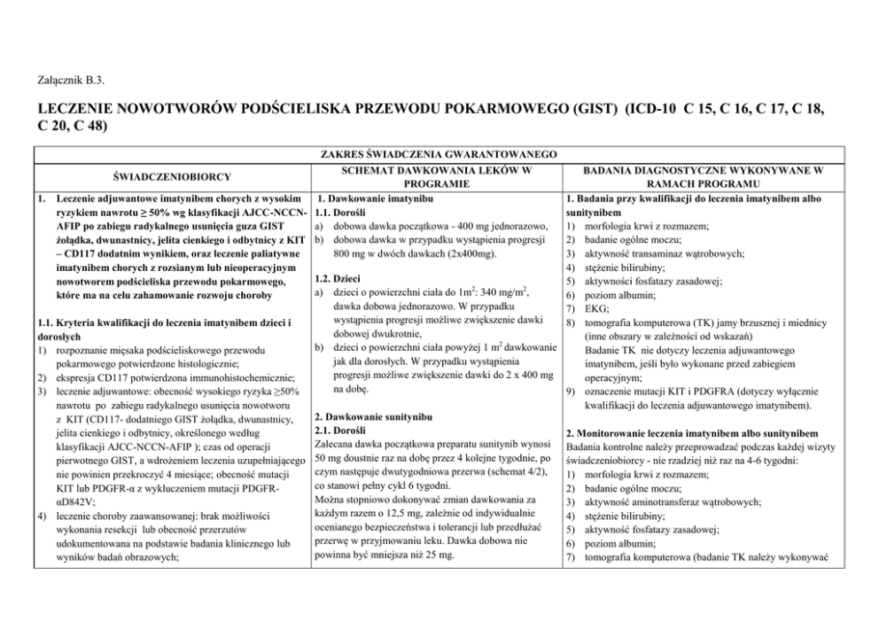 Załącznik B.3. LECZENIE NOWOTWORÓW PODŚCIELISKA PRZEWODU POKARMOWEGO (GIST) (ICD-10 C 15, C 16, C 17, C 18, C 20, C 48) ZAKRES ŚWIADCZENIA GWARANTOWANEGO SCHEMAT DAWKOWANIA LEKÓW W PROGRAMIE 1. Leczenie adjuwantowe imatynibem chorych z wysokim 1. Dawkowanie imatynibu ryzykiem nawrotu ≥ 50% wg klasyfikacji AJCC-NCCN- 1.1. Dorośli a) dobowa dawka początkowa - 400 mg jednorazowo, AFIP po zabiegu radykalnego usunięcia guza GIST żołądka, dwunastnicy, jelita cienkiego i odbytnicy z KIT b) dobowa dawka w przypadku wystąpienia progresji 800 mg w dwóch dawkach (2x400mg). – CD117 dodatnim wynikiem, oraz leczenie paliatywne imatynibem chorych z rozsianym lub nieoperacyjnym 1.2. Dzieci nowotworem podścieliska przewodu pokarmowego, a) dzieci o powierzchni ciała do 1m2: 340 mg/m2, które ma na celu zahamowanie rozwoju choroby dawka dobowa jednorazowo. W przypadku wystąpienia progresji możliwe zwiększenie dawki 1.1. Kryteria kwalifikacji do leczenia imatynibem dzieci i dobowej dwukrotnie, dorosłych b) dzieci o powierzchni ciała powyżej 1 m2 dawkowanie 1) rozpoznanie mięsaka podścieliskowego przewodu jak dla dorosłych. W przypadku wystąpienia pokarmowego potwierdzone histologicznie; progresji możliwe zwiększenie dawki do 2 x 400 mg 2) ekspresja CD117 potwierdzona immunohistochemicznie; na dobę. 3) leczenie adjuwantowe: obecność wysokiego ryzyka ≥50% ŚWIADCZENIOBIORCY nawrotu po zabiegu radykalnego usunięcia nowotworu z KIT (CD117- dodatniego GIST żołądka, dwunastnicy, jelita cienkiego i odbytnicy, określonego według klasyfikacji AJCC-NCCN-AFIP ); czas od operacji pierwotnego GIST, a wdrożeniem leczenia uzupełniającego nie powinien przekroczyć 4 miesiące; obecność mutacji KIT lub PDGFR-α z wykluczeniem mutacji PDGFRαD842V; 4) leczenie choroby zaawansowanej: brak możliwości wykonania resekcji lub obecność przerzutów udokumentowana na podstawie badania klinicznego lub wyników badań obrazowych; 2. Dawkowanie sunitynibu 2.1. Dorośli Zalecana dawka początkowa preparatu sunitynib wynosi 50 mg doustnie raz na dobę przez 4 kolejne tygodnie, po czym następuje dwutygodniowa przerwa (schemat 4/2), co stanowi pełny cykl 6 tygodni. Można stopniowo dokonywać zmian dawkowania za każdym razem o 12,5 mg, zależnie od indywidualnie ocenianego bezpieczeństwa i tolerancji lub przedłużać przerwę w przyjmowaniu leku. Dawka dobowa nie powinna być mniejsza niż 25 mg. BADANIA DIAGNOSTYCZNE WYKONYWANE W RAMACH PROGRAMU 1. Badania przy kwalifikacji do leczenia imatynibem albo sunitynibem 1) morfologia krwi z rozmazem; 2) badanie ogólne moczu; 3) aktywność transaminaz wątrobowych; 4) stężenie bilirubiny; 5) aktywności fosfatazy zasadowej; 6) poziom albumin; 7) EKG; 8) tomografia komputerowa (TK) jamy brzusznej i miednicy (inne obszary w zależności od wskazań) Badanie TK nie dotyczy leczenia adjuwantowego imatynibem, jeśli było wykonane przed zabiegiem operacyjnym; 9) oznaczenie mutacji KIT i PDGFRA (dotyczy wyłącznie kwalifikacji do leczenia adjuwantowego imatynibem). 2. Monitorowanie leczenia imatynibem albo sunitynibem Badania kontrolne należy przeprowadzać podczas każdej wizyty świadczeniobiorcy - nie rzadziej niż raz na 4-6 tygodni: 1) morfologia krwi z rozmazem; 2) badanie ogólne moczu; 3) aktywność aminotransferaz wątrobowych; 4) stężenie bilirubiny; 5) aktywność fosfatazy zasadowej; 6) poziom albumin; 7) tomografia komputerowa (badanie TK należy wykonywać 5) obecność zmian możliwych do zmierzenia w badaniu 2.2. Dzieci tomografii komputerowej; a) dzieci powyżej 6 r. ż. dawkowanie jak u dorosłych, 6) stan sprawności (według klasyfikacji WHO 0-2 ); b) dzieci poniżej 6.r.ż. - dawka powinna być 7) prawidłowe wyniki badań czynności szpiku (liczba płytek indywidualnie ustalana poczynając od 25 mg na krwi ≥75000/mm3, liczba bezwzględna neutrofili dobę. Można stopniowo dokonywać zmian ≥1000/mm3, stężenie hemoglobiny ≥ 8.0 g/dl); dawkowania za każdym razem o 12,5 mg, zależnie 8) prawidłowe wartości wskaźników czynności wątroby i od indywidualnie ocenianego bezpieczeństwa i nerek (nieprzekraczające 2,5 raza górnej granicy normy lub tolerancji lub przedłużać przerwę w przyjmowaniu 5 razy dla prób wątrobowych w przypadku przerzutów leku. do wątroby). 1.2. Określenie czasu leczenia imatynibem w programie Leczenie trwa do czasu podjęcia przez lekarza prowadzącego decyzji o wyłączeniu świadczeniobiorcy z programu, zgodnie z kryteriami wyłączenia. 1.3. Kryteria wyłączenia z leczenia imatynibem 1) wystąpienie objawów nadwrażliwości na imatynib; 2) nawrót GIST podczas leczenia adjuwantowego, które może trwać maksymalnie do 36 miesięcy; 3) progresja choroby w trakcie stosowania leku po zwiększeniu dawki imatynibu do 800 mg/dobę; zwłaszcza pierwotna oporność na imatynib; u dzieci o pow. ciała do 1m2 progresja choroby w trakcie stosowania leku po zwiększeniu dawki imatynibu dwukrotnie; 4) brak skuteczności po 4 miesiącach stosowania leku (zwiększenie sumy wielkości zmian w TK spiralnej, powyżej 20% z wyjątkiem sytuacji, gdy gęstość tych zmian jest mniejsza niż 15% w stosunku do gęstości wyjściowej, lub pojawienie się nowej/nowych zmian o wielkości co najmniej 10 mm); 5) utrzymywanie się toksyczności według skali WHO większej bądź równej 3 (zwłaszcza 3-krotny wzrost stężenia bilirubiny powyżej górnej granicy normy, 5-krotny wzrost aktywności aminotransferaz wątrobowych powyżej co 3 miesiące u chorych leczonych adjuwantowo imatynibem oraz co 2 miesiące u chorych z nieoperacyjnym lub rozsianym GIST w okresie pierwszych 6 miesięcy leczenia i następnie co 3 miesiące). Należy oceniać zmiany pod względem różnic ich wielkości (skala RECIST) i gęstości. 3. Świadczeniodawca jest zobowiązany do przekazywania do NFZ zakresu informacji sprawozdawczo rozliczeniowych ujętych w załączniku nr 4 do umowy. 4. Świadczeniodawca jest zobowiązany