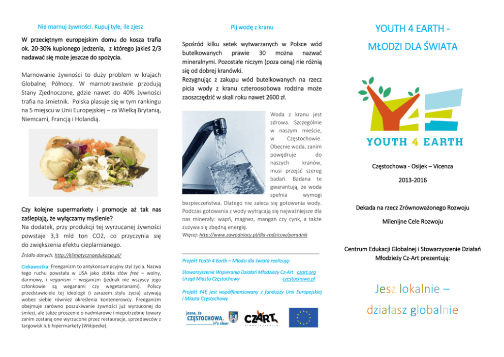 Nie marnuj żywności. Kupuj tyle, ile zjesz. W przeciętnym europejskim domu do kosza trafia ok. 20-30% kupionego jedzenia, z którego jakieś 2/3 nadawać się może jeszcze do spożycia. Marnowanie żywności to duży problem w krajach Globalnej Północy. W marnotrawstwie przodują Stany Zjednoczone, gdzie nawet do 40% żywności trafia na śmietnik. Polska plasuje się w tym rankingu na 5 miejscu w Unii Europejskiej – za Wielką Brytanią, Niemcami, Francją i Holandią. Czy kolejne supermarkety i promocje aż tak nas zaślepiają, że wyłączamy myślenie? Na dodatek, przy produkcji tej wyrzucanej żywności powstaje 3,3 mld ton CO2, co przyczynia się do zwiększenia efektu cieplarnianego. Źródło danych: http://klimatycznaedukacja.pl/ Pij wodę z kranu YOUTH 4 EARTH - Spośród kilku setek wytwarzanych w Polsce wód butelkowanych prawie 30 można nazwać mineralnymi. Pozostałe niczym (poza ceną) nie różnią się od dobrej kranówki. Rezygnując z zakupu wód butelkowanych na rzecz picia wody z kranu czteroosobowa rodzina może zaoszczędzić w skali roku nawet 2600 zł. MŁODZI DLA ŚWIATA Woda z kranu jest zdrowa. Szczególnie w naszym mieście, w Częstochowie. Obecnie woda, zanim powędruje do naszych kranów, musi przejść szereg badań. Badana te gwarantują, że woda spełnia wymogi bezpieczeństwa. Dlatego nie zaleca się gotowania wody. Podczas gotowania z wody wytrącają się najważniejsze dla nas minerały: wapń, magnez, mangan czy cynk, a także zużywa się zbędną energię. 2013-2016 Dekada na rzecz Zrównoważonego Rozwoju Milenijne Cele Rozwoju Więcej: http://www.zawodniacy.pl/dla-rodzicow/poradnik __________________________________________ Projekt Youth 4 Earth – Młodzi dla świata realizują: Ciekawostka: Freeganizm to antykonsumpcyjny styl życia. Nazwa tego ruchu powstała w USA jako zbitka słów free – wolny, darmowy, i veganism – weganizm (jednak nie wszyscy jego członkowie są weganami czy wegetarianami). Polscy przedstawiciele tej ideologii (i zarazem stylu życia) używają wobec siebie również określenia kontenerowcy. Freeganizm obejmuje zarówno poszukiwanie żywności już wyrzuconej do śmieci, ale także proszenie o nadmiarowe i niepotrzebne towary zanim zostaną one wyrzucone przez restauracje, sprzedawców z targowisk lub hipermarkety (Wikipedia). Częstochowa - Osijek – Vicenza Centrum Edukacji Globalnej i Stowarzyszenie Działań Młodzieży Cz-Art prezentują: Stowarzyszenie Wspierania Działań Młodzieży Cz-Art czart.org Urząd Miasta Częstochowy czestochowa.pl Projekt Y4E jest współfinansowany z funduszy Unii Europejskiej i Miasta Częstochowy Jesz lokalnie – działasz globalnie Kupuj lokalne produkty. Jedz sezonowe owoce i warzywa. Żyjemy w czasach zdominowanych przez supermarkety. Szkoda, że przez to nie mają szans na przetrwanie drobni lokalni sklepikarze, a nasza szansa dotarcia do lokalnych polskich produktów maleje. Z pewnością kiedyś ta tendencja się zmieni. W wielu krajach lokalne produkty i firmy zyskują coraz większe znaczenie i udział w rynku. Lokalna żywność wiąże się z transportem na małe odległości, dzięki temu kupujemy świeże, produkty od polskiego wytwórcy! Taka żywność ma mniejszy ślad węglowy, bo nie transportujemy jej np. z innego kontynentu. Będziemy Was też przekonywać do rezygnacji z kupowania owoców egzotycznych. Najlepsze są polskie sezonowe owoce. W piekarniku można zrobić np. pyszne jabłkowe chipsy. Coraz więcej osób decyduje się na sięganie do produktów lokalnych i sezonowych. Targi śniadaniowe i food trucki - czy bardziej swojsko brzmiące spożywcze kooperatywy cieszą się coraz większym powodzeniem. Oszczędzaj wodę podczas zakupów Przeciętny mieszkaniec Europy Zachodniej zużywa ok. 130 litrów wody dziennie: do gotowania, mycia, picia i innych codziennych czynności. O wiele wyższe jest pośrednie zużycie wody poprzez spożywane artykuły żywnościowe. Jak szacuje Organizacja Narodów Zjednoczonych do spraw Wyżywienia i Rolnictwa (FAO), do produkcji codziennej żywności zużywanych jest ok. 2.000 do 5.000 litrów wody. Wodę zużywa się także przy produkcji ubrań i wielu innych artykułów. Więcej: http://www.generationawake.eu/ Ciekawostka: Ilość wody zużywanej do produkcji kilograma wołowiny wystarczyłaby na długi prysznic. Ziemia, błękitna planeta, jest pokryta przez morza i oceany na ¾ swojej powierzchni. Ale tylko 3% zasobów wodnych stanowi woda słodka, z czego 1% jest dostępny do picia. Zdrowy styl życia Nastała moda na zdrowe żywienie i zdrowy styl życia. Zrównoważona konsumpcja, zrównoważona turystyka, zrównoważony transport? To proste: Źródło: http://www.kali-gmbh.com/ Zużycie wody do produkcji jednego kilograma żywności określane jest wodnym śladem żywności. Produkcja wołowiny czy wieprzowiny pochłania znacznie więcej wody, niż produkcja ryżu czy ziemniaków. Więcej wody zużywanej jest tylko do produkcji kawy, czekolady czy herbaty. - chodź pieszo lub używaj roweru do przemieszczania się, możesz też skorzystać z transportu publicznego, twój ślad ekologiczny i ślad węglowy będą mniejsze - zrób sobie przydomowy ogródek i uprawiaj warzywa - planuj wakacje w Polsce, nie musisz wyjeżdżać daleko, żeby dobrze się bawić, dużo ważniejsi niż miejsce, są przyjaciele - ubrania kupuj z rozwagą a te, które ci się znudziły oddaj innym - nie wymieniaj telefonu tylko dlatego, że pojawił się jego nowszy model - kupuj większe opakowania, aby zredukować ich ilość, używaj wielorazowych toreb na zakupy - segreguj śmieci, baterie i inne odpady niebezpieczne oddaj do odpowiedniego punktu - oszczędzaj energię i wodę w domu, szkole i pracy - czytaj etykiety produktów, zwracaj uwagę na ich skład. Przemyśl swoje konsumenckie zachowania. To jak wartościowym jesteś człowiekiem, nie zależy od zasobności twojego portfela i ilości zakupionych produktów, a 