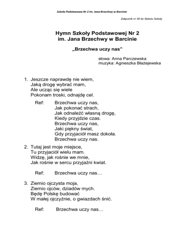 Szkoła Podstawowa Nr 2 im. Jana Brzechwy w Barcinie Załącznik nr 39 do Statutu Szkoły Hymn Szkoły Podstawowej Nr 2 im. Jana Brzechwy w Barcinie „Brzechwa uczy nas” słowa: Anna Parczewska muzyka: Agnieszka Błażejewska 1. Jeszcze naprawdę nie wiem, Jaką drogę wybrać mam, Ale ucząc się wiele Pokonam troski, odnajdę cel. Ref: Brzechwa uczy nas, Jak pokonać strach, Jak odnaleźć własną drogę, Kiedy przyjdzie czas. Brzechwa uczy nas, Jaki piękny świat, Gdy przyjaciół masz dokoła. Brzechwa uczy nas. 2. Tutaj jest moje miejsce, Tu przyjaciół wielu mam. Widzę, jak rośnie we mnie, Jak rośnie w sercu przyjaźni kwiat. Ref: Brzechwa uczy nas… 3. Ziemio ojczysta moja, Ziemio ojców, dziadów mych. Będę Polskę budować W małej ojczyźnie, o gwiazdach śnić. Ref: Brzechwa uczy nas… Szkoła Podstawowa Nr 2 im. Jana Brzechwy w Barcinie Załącznik nr 39 do Statutu Szkoły