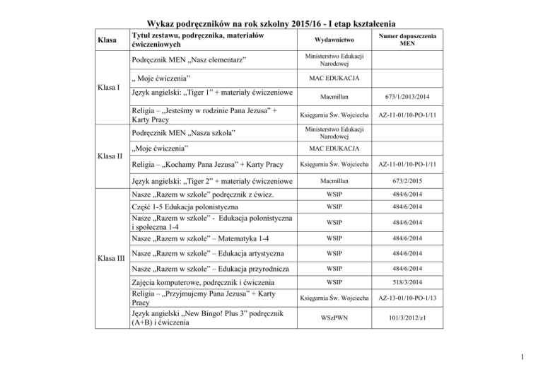 Wykaz podręczników na rok szkolny 2015/16 - I etap kształcenia Klasa Tytuł zestawu, podręcznika, materiałów ćwiczeniowych Podręcznik MEN „Nasz elementarz” „ Moje ćwiczenia” Klasa I Język angielski: „Tiger 1” + materiały ćwiczeniowe Religia – „Jesteśmy w rodzinie Pana Jezusa” + Karty Pracy Podręcznik MEN „Nasza szkoła” „Moje ćwiczenia” Wydawnictwo Numer dopuszczenia MEN Ministerstwo Edukacji Narodowej MAC EDUKACJA Macmillan 673/1/2013/2014 Księgarnia Św. Wojciecha AZ-11-01/10-PO-1/11 Ministerstwo Edukacji Narodowej MAC EDUKACJA Klasa II Religia – „Kochamy Pana Jezusa” + Karty Pracy Księgarnia Św. Wojciecha AZ-11-01/10-PO-1/11 Macmillan 673/2/2015 Nasze „Razem w szkole” podręcznik z ćwicz. WSIP 484/6/2014 Część 1-5 Edukacja polonistyczna Nasze „Razem w szkole” - Edukacja polonistyczna i społeczna 1-4 Nasze „Razem w szkole” – Matematyka 1-4 WSIP 484/6/2014 WSIP 484/6/2014 WSIP 484/6/2014 Nasze „Razem w szkole” – Edukacja artystyczna WSIP 484/6/2014 Nasze „Razem w szkole” – Edukacja przyrodnicza WSIP 484/6/2014 Zajęcia komputerowe, podręcznik i ćwiczenia Religia – „Przyjmujemy Pana Jezusa” + Karty Pracy Język angielski „New Bingo! Plus 3” podręcznik (A+B) i ćwiczenia WSIP 518/3/2014 Księgarnia Św. Wojciecha AZ-13-01/10-PO-1/13 WSzPWN 101/3/2012/z1 Język angielski: „Tiger 2” + materiały ćwiczeniowe Klasa III 1 II etap kształcenia Klasa IV Przedmiot Tytuł podręcznika, zeszytu ćwiczeń i książek pomocniczych Język polski „Jutro pójdę w świat” - podręcznik U. Dobrowolska Język angielski „New Hot Spot 1” + materiały ćwiczeniowe C. Granger C. Hannet Matematyka Matematyka 2001-podręcznik Praca zbiorowa Historia „Wczoraj i dziś”- podręcznik G. Wojciechowski Przyroda „Ciekawi świata” - podręcznik M. Gajewska M. Augustowska E. Bytniewska M. Karwowska Muzyka „I gra muzyka” Plastyka „Do dzieła!” Zajęcia techniczne „Karta rowerowa. Bądź bezpieczny na drodze” podręcznik Autor H. Dobrowolska Wydawnictwo Numer aprobaty MEN WSiP 417/1/2012/2014 Macmillan WSiP 303/1/2010/2015 Nowa Era 443/1/2012/2015 Operon 454/1/2012/2015 M. Gromek G. Kilbach Nowa Era 569/2012/2015 J. Lukas K. Onak Nowa Era 326/1/2011/2015 WSiP 496/1/2012/2015 WSiP 453/1/2012/2014 Księgarnia Św. Wojciecha AZ-21-01/10PO-1/11 B. BogackaOsińska D. Łazuchiewicz Zajęcia komputerowe „Lekcje z komputerem” podręcznik W. Jochemczyk I. Krajewska-Kranas W. Kranas A. Samulska M. Wyczółkowski Religia „Wierzę w Boga” + Karty Pracy Praca zbiorowa 2 Klasa V Przedmiot Tytuł podręcznika, zeszytu ćwiczeń i książek pomocniczych Autor Język polski „Jutro pójdę w świat” podręcznik H.Dobrowolska U.Dobrowolska „Hot Spot 2” - podręcznik i zeszyt Język angielski ćwiczeń C. Granger K. Hannet B. Mackay Matematyka Matematyka 2001-podręcznik Praca zbiorowa Historia „Wczoraj i dziś” G. Wojciechowski Przyroda „Ciekawi świata” M. Augustowska E. Bytniewska M. Gajewska M. Karwowska Plastyka Bez podręcznika Muzyka „I gra muzyka” Zajęcia techniczne Bez podręcznika Zajęcia komputerowe Zajęcia komputerowe -„ Odkrywamy na G. Hermanowska W. Hermanowski nowo” Religia „Wierzę w Boga” + Karty Pracy M. Gromek G. Kilbach Ks. Jan Szpet i in Wydawnictwo Numer w wykazie MEN WSiP 417/2/2013 Macmillan 218/2/2009 WSiP 303/2/2013 Nowa Era 443/2/2013 Operon 454/2/2013 Nowa Era 569/2012 Operon 356/2011 Księgarnia św. Wojciecha AZ-21-01/10-PO1/11 3 Klasa VI Przedmiot Tytuł podręcznika, zeszytu ćwiczeń i książek pomocniczych Autor Język polski „Jutro pójdę w świat” podręcznik H.Dobrowolska U.Dobrowolska Język angielski „Hot Spot 3” - podręcznik i zeszyt C. Granger C. Stannett ćwiczeń Matematyka Matematyka 2001-podręcznik Praca zbiorowa Historia „Wczoraj i dziś” G. Wojciechowski Przyroda „Ciekawi świata” Muzyka „I gra muzyka” Plastyka Bez podręcznika Zajęcia techniczne Bez podręcznika Zajęcia komputerowe Zajęcia komputerowe „Odkrywamy na nowo” Religia „Wierzę w Kościół” + Karty Pracy D. Jackowiak M. Gromek G. Kilbach G. Hermanowska W. Hermanowski Ks. Jan Szpet Wydawnictwo Numer w wykazie MEN WSiP 417/3/2014 Macmillan 218/3/2010 WSiP 303/3/2014/z1 Nowa Era 443/3/2014 Operon w trakcie zatwierdzania Nowa Era 569/2012 Operon 356/2011 Księgarnia św. Wojciecha AZ-23-01/10PO-2/13 4