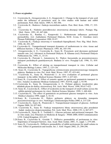 3. Prace oryginalne: 3.1. Czyżewska K., Grzegorzewska A. E., Knapowski J.: Change in the transport of uric acid under the influence of pyrazinoic acid. In vitro studies with human and rabbit peritoneum. Perit. Dial. Intern. 1989, 9, 303-306. 3.2. Czyżewska K.: Budowa i funkcja mezotelium ssaków. Post. Biol. Kom. 1990, 17, 335351. 3.3. Czyżewska K.: Niektóre prawidłowości otrzewnowej absorpcji leków. Postępy Hig. Med. Dośw. 1991, 45, 447-466. 3.4. Czyżewska K., Ramlau C., Knapowski J.: Methotrexate influences peritoneal permeability. [w]: Ambulatory Peritoneal Dialysis, M.M. Avran, C. Giordano (red.) Plenum Publishing Corporation 1990, 93-97. 3.5. Czyżewska K.: Funkcje otrzewnej w warunkach hiperglikemii. Post. Hig. Med. Dośw. 1994, 48, 291-307. 3.6. Czyżewska K.: Transperitoneal transport dynamics of methotrexate in vitro. tissue and diffusion barriers. J. Physiol. Pharmacol. 1995, 46, 185-194. 3.7. Grzegorzewska A. E., Czyżewska K., Szary B.: Pyrazinoic acid decreases peritoneal transfer rate. [w]: Advances in Peritoneal Dialysis. R. Khanna (red.) Peritoneal Dialysis Publications Inc. 1995, 11, 33-35. 3.8. Czyżewska K., Pietrzak I., Antoniewicz K.: Wpływ furosemidu na przezotrzewnowy transport pochodnych guanidynowych. Badania in vitro. Przegląd Lek. 1996, 53, 854857. 3.9. Czyżewska K.: Effect of stirring on transperitoneal transport in vitro. Cellular and Molecular Biology Letters. 1997, 2, 125-136. 3.10. Szary B., Czyżewska K.: Topograficzne zróżnicowanie przezotrzewnowego transportu glukozy. Badania in vitro. Pol. Arch. Med. Wewn. 1997, 97, 433-441. 3.11. Czyżewska K., Szary B., Waniewski J.: In vitro evaluation of peritoneal glucose transport in the rabbit. Medical Science Monitor 1997, 3, 637-641. 3.12.Szary B., Czyżewska K. Effect of osmotic agents on peritoneal gentamicin transport in vitro. Annales Academiae Medicae Gedanensis 1997, XXVII, suppl. 2, 93-99. 3.13.Czyżewska K., Szary B., Grzegorzewska A. E.: Polimer glukozy (icodextrin) jako składnik płynu do dializy otrzewnowej. Pol. Arch. Med. Wewn. 1998, 99,417-422. 3.14. Szary B., Czyżewska K.: Effect of icodextrin on the transport of small solutes across the rabbits parietal peritoneum (in vitro). Medical Science Monitor. 1999, 3, 440-444. 3.15. Czyżewska K.: The effect of gentamicin on peritoneal glucose transport in vitro. Acta Medica Lituanica 1999, suppl. 4, 16-18. 3.16.Szary B., Czyżewska K.: Wpływ polimeru glukozy na dynamikę transportu przezotrzewnowego in vitro. Nefrologia i Dializoterapia Polska 2000, 4, 215-220. 3.17. Czyżewska K., Szary B., Waniewski J.: Transperitoneal transport of glucose. Artificial Organs 2000, 24, 857-863. 3.18. Czyżewska K., Szary B.: Funkcje transportowe błony otrzewnowej jako przedmiot badań medycyny eksperymentalnej. Pol. Arch. Med. Wew. 2000, CIV, 6, 867-877. 3.19.Czyżewska K., Szary B., L. Torliński L.: Glucose polymer and peritoneal transport. The in vitro study. [w]: Polymers in Medicine & Surgery - PIMS 2000, IOM Communication LTD. United Kingdom. 433-437. 3.20.Szary B., Czyżewska K., Grzelak T.: Diffusive permeability of peritoneum in vitro: Importance of transport barriers. Ann. Acad. Med. Gedan. 2001, 31, suppl. 1, 279-288. 3.21 Szary B., Czyżewska K.: Diffusive permeability of rabbit peritoneum for small solutes in vitro: Effect of gentamicin and insulin. Int. J. Artif. Organs 2002, 25, 290-296. 3.22. Szary B., Grzelak T., Czyżewska K.: Wpływ gentamycyny i insuliny na otrzewnową dyfuzję cząsteczek: badania in vitro. Nefrol. Dial. Pol. 2002, 6, 225-229. 3.23.Czyżewska K., Grzelak T., Szary B.: Uwarunkowania transportu makromolekuł przez błonę otrzewnową. Pol. Arch. Med. Wewn. 2002, 6, 1205-1216. 3.24.Czyżewska K., Szary B., Grzelak T.: Możliwości oceny działania leku na otrzewną w warunkach doświadczalnych. Nefrol. Dial. Pol. 2003, 7, 4, 140-144. 3.25.Czyżewska K., Szary B., Grzelak T.: Peritoneal transport of icodextrin in vitro. Ann. Acad. Med. Gedan. 2003, 33 (Suppl. 1), 51-57. 3.26. Grzelak T., Szary B., Czyżewska K.: Effect of icodextrin on transperitoneal uric acid and albumin transport in vitro. Adv. Perit. Dial. 2004, 20, 47-50. 3.27.Szary B., Grzelak T., Czyżewska K.: Metyloglioksal zmienia przepuszczalność dyfuzyjną otrzewnej in vitro. Nefrol. Dial. Pol. 2004, 8, 4, 160-164. 3.28.Grzelak T., Szary B., Czyżewska K., Torliński L.: Influence of icodextrin on creatinine and albumin transport across intact and chemically modified peritoneal membrane in vitro. Prog. Med. Res. 2004, 2, 1-11 (http://www.progmedres.com, 11ss). 3.29. Czyżewska K., Szary B., Grzelak T.: Peritoneal transport dynamics of glucose and icodextrin: the in vitro comparative studies. Adv. Perit. Dial. 2005, 21, 53-58. 3.30.Szary B., Czyżewska K., Grzelak T., Kędzierski S.: Przezotrzewnowy transport ikodekstryny in vitro: badania czynnościowe i morfometryczne. Nefrol. Dial. Pol. 2005, 9, 2, 74-80. 3.31.Grzelak T., Szary B., Czyżewska K.: Wpływ hialuronianu na przepuszczalność błony otrzewnowej dla makrocząsteczek in vitro. Pol. Arch. Med. Wewn. 2005, 114, 6, 11631171. 3.32.Grzelak T., Szary B., Czyżewska K.: Effect of hyaluronan and deoxycholate on transperitoneal insulin and albumin transport in vitro. Adv. Perit. Dial. 2006, 22, 29-32. 3.33. Grzelak T., Szary B., Czyżewska K.: Icodextrin peritoneal transport in vitro: Effect of sodium deoxycholate, glucose, and methylglyoxal. Artif. Organs 2007, 31, 140-147. 3.34. Czyżewska K., Szary B., Grzelak T.: Otrzewna jako błona specyficzna. Przegląd Lek. 2007, 64, 489-94. 3.35. Szary B., Czyżewska K., Grzelak T.: Factors affecting on icodextrin peritoneal transport in vitro. Adv. Perit. Dial. 2007, 23, 17-22. 3.36.Grzelak T., Szary B., Czyżewska K.: Wpływ hialuronianu na funkcje transportowe otrzewnej in vitro: analizy porównawcze. Nefrol. Dial. Pol. 2007, 11, 112-117. 3.37.Grzelak T., Szary B., Krzyżanowska P., Czyżewska K.: Wpływ hialuronianu na transfer glukozy i jej polimeru pr