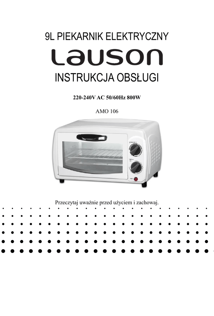 9L PIEKARNIK ELEKTRYCZNY INSTRUKCJA OBSŁUGI 220-240V AC 50/60Hz 800W AMO 106 Przeczytaj uważnie przed użyciem i zachowaj. ŚRODKI OSTROŻNOŚCI ABY ZMNIEJSZYĆ RYZYKO POŻARU LUB PORAŻENIA PRĄDEM, NIE WYSTAWIAĆ URZĄDZENIA NA DESZCZ LUB WILGOĆ. UWAGA RYZYKO PORAŻENIA PRĄDEM UWAGA: ABY ZAPOBIEC RYZYKU PORAŻENIA PRĄDEM NIE ZDEJMUJ OBUDOWY URZĄDZENIA. NIE PODEJMUJ SIĘ SAMODZIELNEJ NAPRAWY, POZOSTAW TO WYKFALIFIKOWANYM OSOBOM. Symbol błyskawicy wewnątrz trójkąta równobocznego ma na celu zwrócenie uwagi użytkownika na obecność "niebezpiecznego napięcia" we wnętrzu produktu, które może stanowić istotne zagrożenie porażenia prądem elektrycznym. Symbol wykrzyknika wewnątrz trójkąta równobocznego ma na celu zwrócenie uwagi użytkownika na obecność ważnych instrukcji użytkowania oraz konserwacji (serwisowania) w dokumentacji dołączonej do urządzenia. Wskazówki ostrożności Podczas użytkowania sprzętu eletrycznego podstawowe środki ostrożności powinny być stosowane: 1. Przeczytaj całą instrukcję przed użyciem lub czyszczeniem. 2. Urządzenie może być używane w pobliżu dzieci tylko pod nadzorem. 3. Nie zanużaj przewodu, wtyczki ani rzadnej innej części urządzenia w wodzie lub innych płynach. 4. Przewód nie może wisieć ani dotykać gorącej powierzchni. 5. Nie używaj urządzenia z uszkodzonym przewodem lub wtyczką lub po awarii/uszkodzeniu. Jeśli urządzenie jest uszkodzone lub zepsute nie 1 6. 7. 8. 9. 10. 11. 12. 13. 14. 15. 16. 17. 18. 19. 20. 21. 22. 23. 24. 25. 26. naprawiaj go sam. Jeśli przewód lub wtyczka są uszkodzone lub zepsute nie wymieniaj ani nie naprawiaj ich sam . Wyślij urządzenie do wykwalifikowanego serwisu w celu naprawy lub serwisu. Podczas używania piekarnika pozostaw przynajmniej 4 cale (10 centymetrów) przestrzeni z każdej strony piekarnika aby umożliwić odpowiednią cyrkulację powietrza. Aby wyłączyć piekarnik przekręć pokrętło na pozycję OFF. Wyciągnij wtyczkę z prądu. Kiedy nie używasz piekarnika lub chcesz go wyczyścić odłącz wtyczkę z gniazda zasilania. Nigdy nie ciągnij za przewód, odłączaj trzymając za wtyczkę. Przed wymianą części lub czyszczeniem pozwól by urządzenie wystygło. Zachowaj szczególną ostrożność podczas przenoszenia urządzeń zawierających gorący olej lub jedzenie. Nie przykrywaj żadnej części piekarnika metalowymi przedmiotami ani materiałem. Może to spowodować przegrzanie się piekarnika. Nie umieszczaj żadnych przedmiotów na piekarniku i nie przykrywaj go. Zachowaj szczególną ostrożność podczas wyciągania tacy lub podczas usuwania gorącego oleju lub innych gorących płynów. Nie pozostawiaj włączonego urządzenia bez nadzoru. Zbyt duże porcje jedzenia lub metalowe przyrządy kuchenne nie mogą być umieszczane w piekarniku. Mogłoby to spowodować pożar lub ryzyko porażenia prądem. Zachowaj szczególną ostrożność jeśli używasz pojemników zrobionych z materiałów innych niż specjalny metal lub specjalna ceramika. Nie umieszczaj żadnego z wymienionych materiałów w piekarniku: plastik, papier ani nic podobnego. Nie umieszczaj żadnych innych akcesoriów z wyjątkiem polecanych przez producenta. Podczas wkładania lub wyciagania produktów z goracego piekarnika zawsze noś rękawice ochronne. Nie używaj piekarnika do innych celów niż jego przeznaczenie. Urządzenie to jest przeznaczone tylko do użytku domowego. Szklane drzwiczki są ciężkie, dlatego trzymaj uchwyt drzwiczek dopóki nie będą całkiem opuszczone. Nie pozwól by drzwiczki same opadły. Urządzenie nie jest przeznaczone do użytkowania przez dzieci. Urządzenie nie jest przeznaczone do użytkowania przez osoby z ograniczonymi zdolościami fizycznymi, czuciowymi lub umysłowymi lub osoby bez wiedzy lub doświadczenia chyba, że pod nadzorem lub po pouczeniu przez osoby odpowiadające za ich bezpieczeństwo. Temperatura na powierzchni urządzenia jest wysoka w trakcie jego pracy i po jej zakończeniu. Nie dotykać. Urządzenie nie może działać na podstawie czasomierza zewnętrznego ani na pilota. AKCESORIA: *TACKA DO PIECZENIA *KRATKA 2 *RĄCZKA DO TACKI LISTA ELEMENTÓW: 1. Wyświetlacz tempertury 4 5 2. Czasomierz 3. Światełko zasilania 4. Szklane drzwi 5. Taca do pieczenia 6. Krata do pieczenia 6 1 2 3 PRZED UŻYCIEM - Upewnij się, że piekarnik jest dobrze wentylowany. - Przed użyciem upewnij się, że piekarnik jest całkowicie suchy. - Umieść piekarnik na powierzchni odporniej na ciepło. Piekarnik nie powinien być umieszczany na powierzchni z nieimpregnowanego drewna. - Nóżki piekarnika mogą pozostawić ślady. Usuń je za pomocą wilgotnej szmatki. UŻYTKOWANIE PIEKARNKA - Przekręć pokrętło temperatury zgodnie z ruchem wskazówek zegara na temperaturę, którą chcesz ustawić. - Przekręć pokrętło ustawiające czas zgodnie z ruchem wskazówek zegara. Ustaw czas pieczenia. - Światelko zasilania zaświeci się po ustawieniu czasu pieczenia i zgaśnie kiedy czasomierz znajdzie się na pozycji OFF. - Kiedy czas pieczenia sie skończy piekarnik wyda dźwięk. Jeśli pieczenie zakończy się przed ustawionym wcześniej czasem, przekręć czasomierz na pozycję OFF aby wyłączyć piekarnik. - Podczas pierwszego użycia piekarnika może wydzielać się dym. To normalne, po 5-15 minutach dym zniknie - W celu usyskania lepszych rezultatów pieczenia zaleca się nagrzanie piekarnika przez 10-15 minut. PIECZENIA NA GRILLU Pozostaw drzwi otwarte. - Ustaw temperaturę na 250 stopni Ustaw czas grillowania. Kiedy grillowanie się zakończy, ustaw pokrętło czasomierza na pozycję OFF w celu wyłączenia piekarnika. PO UZYCIU - Ustaw czasomierz na pozycję OFF. Odłącz wtyczkę z gniazda. Przed czyszczeniem lub naprawą pozostaw piekarnik do ochłodzenia. KONSERWACJA I CZYSZCZENIE - Przed czyszczeniem wyciągnij wtyczkę z prądu i pozostaw urządzenie do ochłodzenia. - Nie zanurzaj urządzenia w wodzie. Wszystkie powierzch