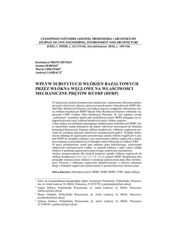 CZASOPISMO INŻYNIERII LĄDOWEJ, ŚRODOWISKA I ARCHITEKTURY JOURNAL OF CIVIL ENGINEERING, ENVIRONMENT AND ARCHITECTURE JCEEA, t. XXXIII, z. 63 (1/I/16), styczeń-marzec 2016, s. 149-156 Kostiantyn PROTCHENKO1 Joanna DOBOSZ2 Marek URBAŃSKI3 Andrzej GARBACZ4 WPŁYW SUBSTYTUCJI WŁÓKIEN BAZALTOWYCH PRZEZ WŁÓKNA WĘGLOWE NA WŁAŚCIWOŚCI MECHANICZNE PRĘTÓW B/CFRP (HFRP) W niniejszym artykule przedstawiono analityczne i numeryczne obliczenia mechanicznych właściwości obecnie opracowywanych prętów hybrydowych HFRP (Hybrid Fibre Reinforced Polymer) powstałych poprzez zastąpienie (substytucję) części włókien bazaltowych BFRP (Basalt Fibre Reinforced Polymer) włóknami węglowymi CFRP (Carbon Fibre Reinforced Polymer). W tym aspekcie termin ,,substytucja” rozumiany będzie jako modyfikacja prętów BFRP polegająca na zastąpieniu pewnej części włókien bazaltowych przez włókna węglowe. Celem analizy jest określenie optymalnego modelu prętów hybrydowych HFRP, które stanowiłyby realną alternatywę dla prętów stalowych stosowanych do zbrojenia konstrukcji betonowych. Zamiana włókien bazaltowych, włóknami węglowymi prowadzi do uzyskania lepszych właściwości mechanicznych prętów. Względy ekonomiczne skłaniają do ograniczenia procentowego udziału włókien węglowych w prętach HFRP do rozsądnej wielkości, oraz zastosowaniu włókien węglowych o stosunkowo niedużej wytrzymałości (Low Strength Carbon Fibres) jak na włókna CFRP. W pracy przedstawiony został opis struktury pręta hybrydowego, oszacowanie właściwości mechanicznych wzdłuż i w poprzek włókien, a także wpływ układu włókien w przekroju poprzecznym pręta na jego zachowanie mechaniczne. Analizę przeprowadzono dla różnych proporcji udziału włókien węglowych do włókien bazaltowych (1:9; 1:4; 1:3; 1:2; 1:1) w prętach HFRP. Rozpatrzono dwa przypadki rozmieszczenia włókien w przekroju poprzecznym pręta (Bar Architecture). Pierwszy z włóknami węglowymi zlokalizowanymi w rdzeniu, natomiast drugi z włóknami węglowymi usytuowanymi w powierzchniowej warstwie pręta. Słowa kluczowe: Hybrydowy pręt C/BFRP, HFRP, BFRP, CFRP, układ włókien ________________________________________ 1 2 3 4 Autor do korespondencji/corresponding author: Kostiantyn Protchenko, Politechnika Warszawska, ul. Armii Ludowej 16, 00636, Warszawa, 22 8255758, [email protected] Joanna Dobosz, Politechnika Warszawska, ul. Armii Ludowej 16, 00636, Warszawa, [email protected] Marek Urbański, Politechnika Warszawska, ul. Armii Ludowej 16, 00636, Warszawa, [email protected] Andrzej Garbacz, Politechnika Warszawska, ul. Armii Ludowej 16, 00636, Warszawa, 22 2346556, [email protected] 150 K. Protchenko, J. Dobosz, M. Urbański, A. Garbacz 1. Wstęp Jednym z mechanizmów niszczenia żelbetu jest korozja stalowych prętów, między innymi z powodu karbonatyzacji otuliny betonowej. Aby uniknąć niekorzystnych skutków spowodowanych tym zjawiskiem, zamiast typowych rozwiązań w postaci zabezpieczeń antykorozyjnych, można zastosować materiały o zwiększonej odporności na korozję. W pewnych okolicznościach, użycie prętów kompozytowych FRP (Fibre Reinforced Polymer) może być traktowane jako alternatywne rozwiązanie w stosunku do konwencjonalnego zbrojenia stalowego. W porównaniu do zbrojenia stalowego, zastosowanie wewnętrznego zbrojenia FRP w konstrukcjach betonowych, może przyczynić się do zwiększenia ich nośności i trwałości [7]. Materiały kompozytowe stworzone na bazie FRP, ze względu na znacznie dłuższą żywotność, stanowią obiecujący zamiennik stali zbrojeniowej [10]. Koszt produkcji prętów CFRP (Carbon Fibre Reinforced Polymer) jest stosunkowo wysoki. Optymalnym rozwiązaniem uwzględniającym relację kosztów do właściwości mechanicznych jest zastosowanie prętów HFRP (Hybrid Fibre Reinforced Polymer) na bazie włókien bazaltowych, z substytucją włóknami węglowymi. Pręty HC/BFRP (Hybrid Carbon/Basalt Fibre Reinforced Polymer) charakteryzują się lepszymi właściwościami mechanicznymi niż pręty BFRP (Basalt Fibre Reinforced Polymer) przy relatywnie niskim koszcie, w porównaniu z prętami CFRP [5]. Ponadto koszt prętów HC/BFRP może być konkurencyjny w stosunku do kosztu prętów stalowych o porównywalnych właściwościach. Niektóre sugestie odnoszące się do hybrydyzacji materiałów na bazie FRP można znaleźć w pracach naukowych w [2], [11], [12]. 2. Charakterystyka pręta 2.1. Opis struktury pręta Pręt hybrydowy stworzony na bazie FRP składa się z więcej niż jednego rodzaju włókien połączonych jednym lub kilkoma rodzajami matrycy. Strukturę pręta może stanowić jedna, dwie lub więcej żyłek skręconych spiralnie wokół podłużnej osi pręta. Pojedyncza żyłka składa się z dużej ilości włókien zatopionych w matrycy. Włókna na całej swojej długości są ciągłe, ukierunkowane i nie przecinają się pomiędzy sobą. Strefa kontaktu pomiędzy żyłkami składa się z matrycy i z mniejszej niż w żyłce ilości włókien. W niniejszej pracy analizowano pręty o matrycy z żywicy epoksydowej wzmocnionej włóknami bazaltowymi i węglowymi, które stanowią 80-procent całkowitej objętości pręta. Na Rys. 1 przedstawiono dwa rodzaje układu włókien w przekroju poprzecznym pręta, tj. włókna węglowe zlokalizowane w rdzeniu i w powierzchniowej warstwie pręta. Wpływ substytucji włókien bazaltowych przez włókna węglowe… 151 Rys. 1. Zaproponowane modele układu włókien w pręcie na bazie HFRP (a) położenie włókien węglowych na powierzchni (b) położenie włókien węglowych w rdzeniu (1) włókna węglowe (2) włókna bazaltowe (3) żywica epoksydowa Fig. 1. Proposed model of the bar made on the basis of HFRP (a) location of carbon fibres in the region near the edge (b) location of carbon fibres in core region (1) carbon fibres (2) basalt fibres (3) epoxy resin 3. Mechanika pręta 3.1. Właściw
