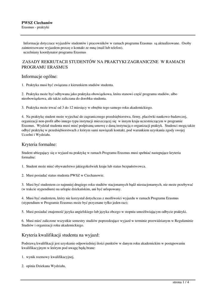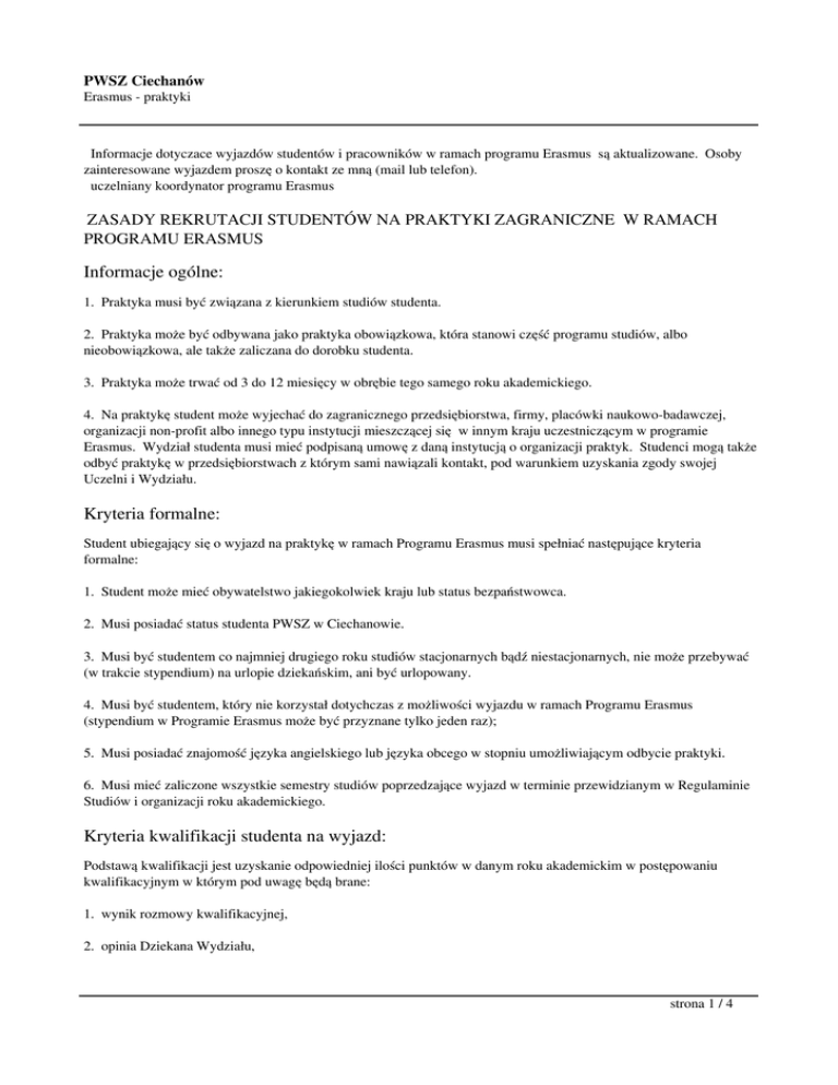 PWSZ Ciechanów Erasmus - praktyki Informacje dotyczace wyjazdów studentów i pracowników w ramach programu Erasmus są aktualizowane. Osoby zainteresowane wyjazdem proszę o kontakt ze mną (mail lub telefon). uczelniany koordynator programu Erasmus ZASADY REKRUTACJI STUDENTÓW NA PRAKTYKI ZAGRANICZNE W RAMACH PROGRAMU ERASMUS Informacje ogólne: 1. Praktyka musi być związana z kierunkiem studiów studenta. 2. Praktyka może być odbywana jako praktyka obowiązkowa, która stanowi część programu studiów, albo nieobowiązkowa, ale także zaliczana do dorobku studenta. 3. Praktyka może trwać od 3 do 12 miesięcy w obrębie tego samego roku akademickiego. 4. Na praktykę student może wyjechać do zagranicznego przedsiębiorstwa, firmy, placówki naukowo-badawczej, organizacji non-profit albo innego typu instytucji mieszczącej się w innym kraju uczestniczącym w programie Erasmus. Wydział studenta musi mieć podpisaną umowę z daną instytucją o organizacji praktyk. Studenci mogą także odbyć praktykę w przedsiębiorstwach z którym sami nawiązali kontakt, pod warunkiem uzyskania zgody swojej Uczelni i Wydziału. Kryteria formalne: Student ubiegający się o wyjazd na praktykę w ramach Programu Erasmus musi spełniać następujące kryteria formalne: 1. Student może mieć obywatelstwo jakiegokolwiek kraju lub status bezpaństwowca. 2. Musi posiadać status studenta PWSZ w Ciechanowie. 3. Musi być studentem co najmniej drugiego roku studiów stacjonarnych bądź niestacjonarnych, nie może przebywać (w trakcie stypendium) na urlopie dziekańskim, ani być urlopowany. 4. Musi być studentem, który nie korzystał dotychczas z możliwości wyjazdu w ramach Programu Erasmus (stypendium w Programie Erasmus może być przyznane tylko jeden raz); 5. Musi posiadać znajomość języka angielskiego lub języka obcego w stopniu umożliwiającym odbycie praktyki. 6. Musi mieć zaliczone wszystkie semestry studiów poprzedzające wyjazd w terminie przewidzianym w Regulaminie Studiów i organizacji roku akademickiego. Kryteria kwalifikacji studenta na wyjazd: Podstawą kwalifikacji jest uzyskanie odpowiedniej ilości punktów w danym roku akademickim w postępowaniu kwalifikacyjnym w którym pod uwagę będą brane: 1. wynik rozmowy kwalifikacyjnej, 2. opinia Dziekana Wydziału, strona 1 / 4 PWSZ Ciechanów Erasmus - praktyki 3. znajomość języka angielskiego, lub języka obcego kraju odbywania praktyki (potwierdzona certyfikatami, dyplomami, lub oceną znajomości języka na rozmowie kwalifikacyjnej), 4. działalność na rzecz uczelni i programu Erasmus na uczelni, 5. rok studiów (oznacza to preferencję studentów wyższych lat studiów, dając tym samym studentom niższych lat możliwość ubiegania się o wyjazd w następnej kwalifikacji), 6. wyniki w nauce (średnia ocen z dotychczasowego toku studiów). Rozmowa kwalifikacyjna jest obowiązkowa dla wszystkich studentów. Termin rozmowy kwalifikacyjnej będzie corocznie podawany na stronie www Uczelni. W trakcie rozmowy kwalifikacyjnej przeprowadzanej w języku obcym kandydat na wyjazd przedstawia swoją motywację wyjazdu, planowany przebieg praktyki, przedstawia swoje dotychczasowe kontakty ze studentami Erasmusa itp. Komisja dokonuje oceny stopnia motywacji studenta, oraz znajomości języka obcego Wymagane dokumenty: Pakiet plików do pobrania (w przygotowaniu) Dokumenty należy składać w Dziekanacie Wydziału w terminie corocznie podawanym na stronie www Uczelni. I Dokumenty przedstawiane Komisji Kwalifikacyjnej: 1. Formularz zgłoszeniowy (obowiązkowo). 2. Application Form (obowiązkowo). 3. Wstępnie wypełnione "Porozumienie o programie praktyki" (Training Agreement) (obowiązkowo). 4. Opis działalności na rzecz Uczelni i Programu Erasmus na Uczelni (nieobowiązkowo). 5. Certyfikaty, dyplomy itp. potwierdzające znajomość języków obcych (nieobowiązkowo). 6. Opinia Dziekana Wydziału o studencie (nieobowiązkowo). II Dokumenty konieczne przed wyjazdem na praktykę: 1. Podanie do J.M.Rektora. strona 2 / 4 PWSZ Ciechanów Erasmus - praktyki 2. Umowa. 3. Wypełnione "Porozumienie o programie praktyki" (Training Agreement). 4. Oświadczenie dotyczące wypłaty I i II raty stypendium. 5. Europejska karta ubezpieczenia zdrowotnego wystawiona przez NFZ. III Dokumenty konieczne po przyjeździe z praktyki: 1. Zaświadczenie o czasie pobytu i dokument stwierdzający zrealizowanie zakładanego programu praktyki wraz z oceną wystawioną przez przyjmującą instytucję zagraniczną. Dokumenty te powinny być wystawione na papierze firmowym z pieczątką i podpisem koordynatora praktyki z instytucji przyjmującej. 2. Wypełnienie online ankiety o pobycie na stypendium programu Erasmus. strona ankiety: http://ankiety.frse.org.pl Komisja Kwalifikacyjna: W skład Komisji Kwalifikacyjnej wchodzą następujące osoby: 1. Prorektor PWSZ w Ciechanowie, lub upoważniona przez niego osoba (Przewodniczący Komisji). 2. Dziekan lub Prodziekan Wydziału dla którego są podpisane umowy Erasmusa o organizacji praktyk w dyscyplinie studenta (ilość stypendiów dla każdego Wydziału wynika z ilości podpisanych umów dla danego Wydziału i przyznanych uczelni na dany rok środków w programie Erasmus na organizację praktyk). 3. Przedstawiciel Samorządu Studenckiego. 4. Koordynator Uczelniany Programu LLP- Erasmus lub lektor języka obcego na uczelni. O wyniku kwalifikacji decyduje liczba uzyskanych punktów. Decydujący głos w przypadku jednakowej liczby punktów przysługuje Przewodniczącemu Komisji. Komisja sporządza listę rankingową. Osoby z najwyższą liczbą punktów zostają strona 3 / 4 PWSZ Ciechanów Erasmus - praktyki zakwalifikowane na wyjazd w pierwszej kolejności, aż do wykorzystania stypendiów przypadających na dany Wydział. Osoby, które nie zmieszczą się na liście podstawowej przechodzą automatycznie na listę rezerwową. Sposób przechodzenia z listy rezerwowej na listę podstawową jest ściśle 