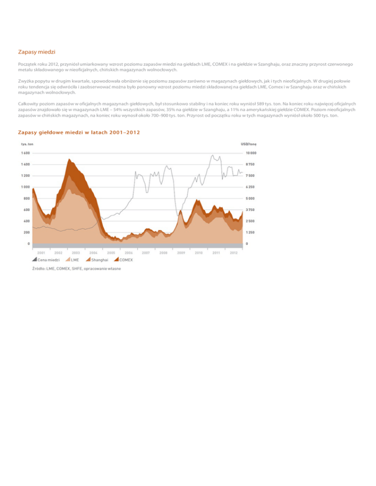 Zapasy miedzi Początek roku 2012, przyniósł umiarkowany wzrost poziomu zapasów miedzi na giełdach LME, COMEX i na giełdzie w Szanghaju, oraz znaczny przyrost czerwonego metalu składowanego w nieoficjalnych, chińskich magazynach wolnocłowych. Zwyżka popytu w drugim kwartale, spowodowała obniżenie się poziomu zapasów zarówno w magazynach giełdowych, jak i tych nieoficjalnych. W drugiej połowie roku tendencja się odwróciła i zaobserwować można było ponowny wzrost poziomu miedzi składowanej na giełdach LME, Comex i w Szanghaju oraz w chińskich magazynach wolnocłowych. Całkowity poziom zapasów w oficjalnych magazynach giełdowych, był stosunkowo stabilny i na koniec roku wyniósł 589 tys. ton. Na koniec roku najwięcej oficjalnych zapasów znajdowało się w magazynach LME – 54% wszystkich zapasów, 35% na giełdzie w Szanghaju, a 11% na amerykańskiej giełdzie COMEX. Poziom nieoficjalnych zapasów w chińskich magazynach, na koniec roku wynosił około 700–900 tys. ton. Przyrost od początku roku w tych magazynach wyniósł około 500 tys. ton. Zapas y giełdowe m iedzi w lat ach 2 0 0 1 –2 0 1 2