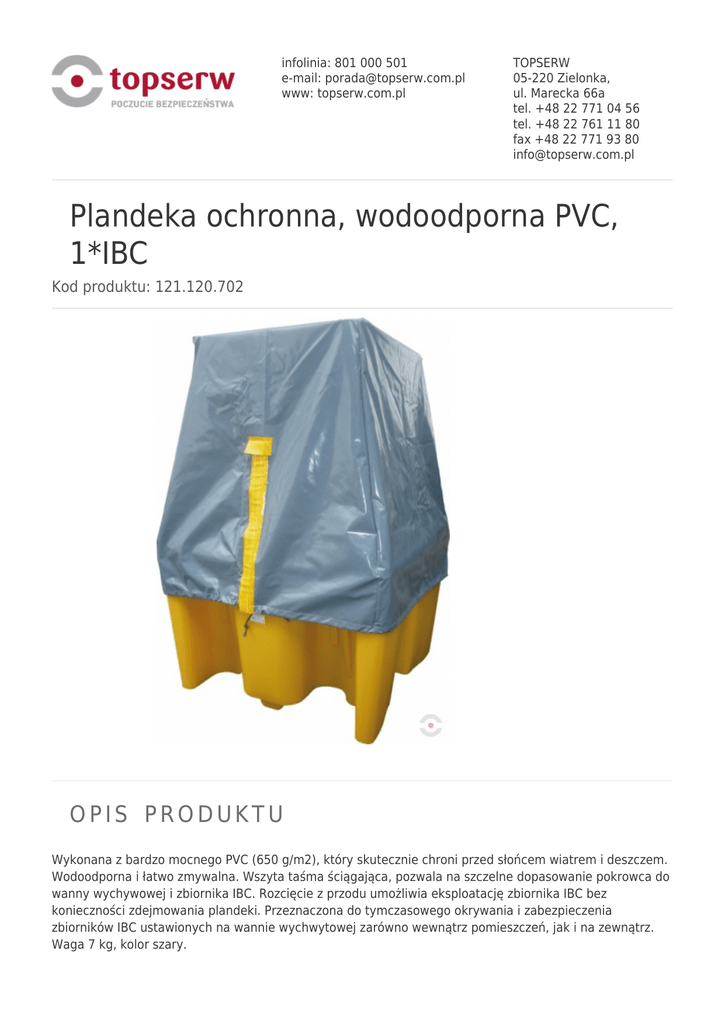 infolinia: 801 000 501 e-mail: [email protected] www: topserw.com.pl TOPSERW 05-220 Zielonka, ul. Marecka 66a tel. +48 22 771 04 56 tel. +48 22 761 11 80 fax +48 22 771 93 80 [email protected] Plandeka ochronna, wodoodporna PVC, 1*IBC Kod produktu: 121.120.702 OPIS PRODUKTU Wykonana z bardzo mocnego PVC (650 g/m2), który skutecznie chroni przed słońcem wiatrem i deszczem. Wodoodporna i łatwo zmywalna. Wszyta taśma ściągająca, pozwala na szczelne dopasowanie pokrowca do wanny wychywowej i zbiornika IBC. Rozcięcie z przodu umożliwia eksploatację zbiornika IBC bez konieczności zdejmowania plandeki. Przeznaczona do tymczasowego okrywania i zabezpieczenia zbiorników IBC ustawionych na wannie wychwytowej zarówno wewnątrz pomieszczeń, jak i na zewnątrz. Waga 7 kg, kolor szary. DANE TECHNICZNE Waga 7 kg Materiał PVC Kolor Szary