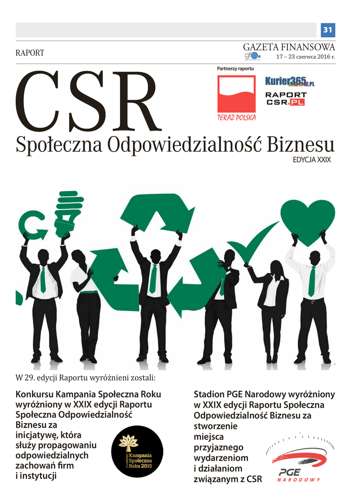 31 gazeta finansowa 17 – 23 czerwca 2016 r. Partnerzy raportu EDYCJA XXIX W 29. edycji Raportu wyróżnieni zostali: Konkursu Kampania Społeczna Roku wyróżniony w XXIX edycji Raportu Społeczna Odpowiedzialność Biznesu za inicjatywę, która służy propagowaniu odpowiedzialnych zachowań firm i instytucji Stadion PGE Narodowy wyróżniony w XXIX edycji Raportu Społeczna Odpowiedzialność Biznesu za stworzenie miejsca przyjaznego wydarzeniom i działaniom związanym z CSR 32 csr gazeta finansowa 17 – 23 czerwca 2016 r. BIZNES RAPORT Drodzy Czytelnicy Oddajemy w Wasze ręce 29. numer Raportu CSR, specjalnego dodatku Gazety Finansowej, stanowiący kompendium wiedzy na temat społecznej odpowiedzialności biznesu. W tej edycji poruszyliśmy ważny temat, jakim jest efekt działań CSR, na przykładzie kampanii społecznych. W obecnej edycji Raportu postanowiliśmy wyróżnić jedną z ciekawszych inicjatyw na polskim rynku CSR, jaką jest „Konkurs Kampania Społeczna Roku”, organizowany przez Fundację Komunika- cji Społecznej. Ideą konkursu jest zwrócenie uwagi na najlepsze przykłady kampanii realizowanych w Polsce. W rozmowie z przewodniczącym jury konkursu przypominamy pierwsze kampanie przygotowane przez polskich specjalistów, a także to, jak na przestrzeni ostatnich lat zmieniała się ich warsztat. Drugim z laureatów jest stadion PGE Narodowy zarządzany przez spółkę PL.2012+. Szczególną uwagę zwróciliśmy na wydarzenia, które mają miejsce na stadionie, a w których tle rysują się idee społecznej odpowiedzialności biznesu. Jedną z ciekawych inicjatyw była niedawna „Gala Białych Kołnierzyków”, podczas której rękawice krzyżowali politycy, aktorzy i celebryci, a cały dochód został przekazany na cele charytatywne. Na kolejnych stronach Raportu przeczytamy też o działaniach Polsko-Portugalskiej Izby Gospodarczej, które w szczególny sposób zachęcaj przedsiębiorców z tych dwóch krajów do współpracy. Warto też zwrócić uwagę na działania firmy Kapsch, która dzięki wykorzystaniu nowych technologii przyczynia się do ochrony środowiska naturalnego. Ponieważ to ostatni, przed wakacjami, numer naszego Raportu, postanowiliśmy przyjrzeć się aktywności firm właśnie w okresie wakacyjnym. Na uwagę zasługują takie inicjatywy jak m.in. kolejna już odsłona Kina Orange, w Sopocie i w Zakopanem, czy podobna akcja prowadzona przez sieć sklepów Biedronka. W imieniu całej redakcji chcieliśmy też podziękować naszym partnerom, którzy wspólnie z nami realizują idee społecznej odpowiedzialności biznesu: Fundacji Polskiego Godła Promocyjnego „Teraz Polska” oraz portalowi Kurier365.pl. Szczególne podziękowania należą się jednak Wam drodzy czytelnicy, za to, że jesteście z nami i po raz kolejny mamy przyjemność spotkać się na łamach naszego Raportu CSR. Redakcja Kampanię społeczną definiuje jej cel - dobro wspólne Rozmawiamy z Pawłem Prochenko, przewodniczącym jury i prezesem Fundacji Komunikacji Społecznej, która organizuje konkurs „Konkursu Kampania Społeczna Roku. nych), a procedurom konkursowym towarzyszy audyt. To już 8. edycja kampania, jakie było źródło pomysłu, aby stworzyć taki konkurs? Fundacja Komunikacji Społecznej działa od 1998 r., zajmuje się promocją marketingu społecznego i komunikacji społecznej. Od 14 lat osoby związane z Fundacją prowadzą także firmę Fabryka Komunikacji Społecznej, zajmująca się realizowaniem kampanii społecznych i komunikacją CSR. Fabryka Komunikacji Społecznej jest także wydawcą prowadzonego przez Fundację portalu kampaniespoleczne.pl. Stworzenie Konkursu wpisuje się w działania obu podmiotów, jest kolejnym krokiem na rzecz dobrych praktyk w marketingu społecznym. Jury Konkursu jest niezależne od jego organizatorów, zasiadają w nim eksperci z zakresu kampanii społecznych. W celu zachowania bezstronności w regulaminie ustanowiono zapisy uniemożliwiające ocenianie danych kampanii przez jurorów, którzy mieli wpływ na ich kształt (wielu jurorów czynnie działa w zakresie realizacji kampanii społecz- Jak według Pana kształtuje się obecnie rynek kampanii społecznych w Polsce, czy śledząc poprzednie edycje możemy mówić o tym, że ten obszar rozwija się, a produkcje coraz bardziej zaskakują? Jedną z pierwszych polskich reklam społecznych była akcja billboardowa „Papierosy są do dupy”, przygotowana przez agencję Andrzeja Pągowskiego (Studio P) dla Ministerstwa Zdrowia i Opieki Społecznej oraz Towarzystwa Antynikotynowego. Natomiast jedną z ikon polskich kampanii społecznych, bardzo wyraźnie obecną do tej pory w świadomości społeczeństwa jest kampania „Powstrzymać przemoc domową” ze słynnym hasłem „Bo zupa była za słona”, stworzona dla Ogólnopolskiego Pogotowia dla Ofiar Przemocy w Rodzinie „Niebieska linia”. Przemiany można zaobserwować, śledząc wyniki organizowanego przez portal kampaniespoleczne.pl i Fundację Komunikacji Społecznej corocznie Konkursu Kampania Społeczna Roku, który poprzez wyłanianie i wskazywanie najlepszych rozwiązań w reklamie społecznej ma przyczyniać się do postępu i kształtowania standardów w dziedzinie marketingu społecznego. Większość zgłaszanych kampanii traktuje podejmowane tematy rzetelnie, ale standardowo. Można zauważyć, że naprawdę kreatywne i pomysłowe kampanie często są jednocześnie niskobudżetowe – ograniczone środki niejako zmuszają do poszukiwa- nia ciekawych rozwiązań; kampanie kompleksowe, wykorzystujące różne narzędzia komunikacji, często z kolei stosują klasyczne (co nie znaczy, że nieskuteczne) podejście do poruszanych problemów; brak jest kreatywnych, szeroko zakrojonych kampanii, większość jest na dobrym poziomie, brakuje jednak kampanii wybitnych. Polska reklama społeczna staje się coraz odważniejsza, inicjatorzy chętnie współpracują z agencjami i są bardziej otwarci na nieb