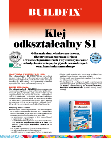 Klej odkształcalny S1 Odkształcalna, cienkowarstwowa, tiksotropowa zaprawa klejąca o wysokich parametrach i wydłużonym czasie schnięcia otwartego, do płytek ceramicznych oraz kamienia naturalnego KLASYFIKACJA WG NORMY PN-EN 12004 Klej odkształcalny S1 BUILDFIX jest cementową zaprawą klejącą (C) o podwyższonych parametrach (2), zmniejszonym spływie (T), wydłużonym czasie schnięcia otwartego (E), typu i klasy C2TE spełniającą dodatkowo wymagania dla klejów odkształcalnych klasy S1. ZAKRES STOSOWANIA Klej odkształcalny S1 BUILDFIX jest przeznaczony do mocowania wszystkich rodzajów i formatów płytek ceramicznych (glazura, terakota, gres), oraz niewrażliwego na wilgoć kamienia naturalnego na zewnątrz i wewnątrz budynku, na pionowych i poziomych podłożach mogących podlegać odkształceniom. Może być stosowany do klejenia punktowego materiałów izolacyjnych, takich jak płyty styropianowe, płyty z wełny mineralnej i szklanej, Eraclit® (płyty włókno-cementowe), panele dźwiękochłonne itp. Przykłady zastosowania • Montaż płytek ceramicznych (jedno- i dwukrotnie wypalanych, gresu porcelanowego, klinkieru itp.) i niewrażliwego na wilgoć kamienia naturalnego na podłożach tradycyjnych mogących podlegać odkształceniom, takich jak: – na podkładach cementowych, w tym na podkładach z ogrzewaniem podłogowym; – na podkładach anhydrytowych zagruntowanych wcześniej Gruntem Szybkoschnącym BUILDFIX, preparatami gruntującymi Mapegrunt, Primer G lub Eco Prim T. – na tynkach cementowych i cementowo-wapiennych; – na jednowarstwowych tynkach gipsowych – na stabilnie zamontowanych płytach kartonowo-gipsowych. • Montaż płytek ceramicznych i kamienia na istniejących posadzkach (ceramicznych, marmurowych itp.). • Montaż płytek w pomieszczeniach narażonych na obciążenie intensywnym ruchem. • Montaż ściennych i podłogowych płytek ceramicznych na podłożach pokrytych powłokami hydroizolacyjnymi takimi jak Zestaw uszczelniający do łazienki BUILDFIX, Mapegum WPS i Mapelastic (łazienki, balkony, tarasy, baseny). WŁAŚCIWOŚCI TECHNICZNE Klej odkształcalny S1 BUILDFIX jest proszkową zaprawą klejącą w kolorze szarym, składającą się z cementu, wyselekcjonowanych kruszyw, żywic syntetycznych i specjalnych dodatków zgodnie z recepturą opracowaną w laboratoriach badawczych MAPEI. Po wymieszaniu Kleju odkształcalnego S1 BUILDFIX z wodą, powstaje zaprawa o następujących właściwościach: – łatwo przerabialna; – wysoka tiksotropowość: Klej odkształcalny S1 BUILDFIX może być stosowany do montażu okładzin na powierzchniach pionowych, bez efektu ich osuwania się i bez konieczności stosowania krzyżyków dystansowych; – wysoka przyczepność; – wysoka zdolność do kompensacji naprężeń (odkształceń podłoża i okładziny). – bezskurczowe schnięcie – odpowiednio dobrany czas schnięcia otwartego i czas korygowania ułatwiające instalację. ZALECENIA Kleju odkształcalnego S1 BUILDFIX nie należy stosować w następujących przypadkach: • na drewnie i płytach drewnopochodnych; • na powierzchniach metalowych, gumowych, PVC i linoleum; • do klejenia kamienia naturalnego wrażliwego na wilgoć; • na betonie narażonym na znaczne odkształcenia. WYTYCZNE STOSOWANIA Przygotowanie podłoża Wszystkie podłoża, na których będzie stosowany Klej odkształcalny S1 BUILDFIX powinny być odpowiednio wysezonowane, nośne, suche, wolne od wszelkich zanieczyszczeń mogących zmniejszyć przyczepność, oraz zagruntowane w zależności od rodzaju podłoża odpowiednim preparatem gruntującym np.: Grunt Szybkoschnący BUILDFIX, Mapegrunt, Primer G, Eco Prim T lub Eco Prim Grip. Podłoża cementowe (wilgotność poniżej 4%) nie powinny podlegać skurczowi po instalacji płytek, dlatego tynki powinny być sezonowane przez przynajmniej jeden tydzień na każdy centymetr grubości, a całkowity czas sezonowania podkładów cementowych powinien wynosić co najmniej 28 dni chyba, że zostały wykonane z użyciem specjalnych szybkoschnących i szybkowiążących spoiw i zapraw MAPEI takich jak: Topcem, Topcem Pronto, Mapecem Pronto lub Szybka posadzka BUILDFIX. Powierzchnie zewnętrzne narażone na silne działanie promieni słonecznych należy przed aplikacją zaprawy zwilżyć wodą i odczekać do wchłonięcia i powstania matowo-wilgotnej powierzchni. Podłoża anhydrytowe (wilgotność poniżej 0,5%) i gipsowe (wilgotność poniżej 1%) powinny posiadać odpowiednią wytrzymałość, a po przeszlifowaniu powinny zostać zagruntowane odpowiednim preparatem gruntującym np.: Grunt Szybkoschnący BUILDFIX, Mapegrunt, Primer G lub Eco Prim T, a w miejscach narażonych na ciągłe działanie wilgoci zabezpieczone preparatem Mapegum WPS lub przy użyciu Zestawu uszczelniającego do łazienki BUILDFIX. Przygotowanie zaprawy klejącej Do czystego pojemnika należy wlać 6,75-7,25 litra czystej, zimnej wody. Wsypać zawartość całego opakowania Kleju odkształcalnego S1 BUILDFIX, a następnie wymieszać mechanicznym mieszadłem wolnoobrotowym, aż do DANE TECHNICZNE I WŁAŚCIWOŚCI PRODUKTU Właściwości zgodne z normą: PN-EN 12004 jako C2TE S1 WŁAŚCIWOŚCI SUCHEJ MIESZANKI Postać: proszek Kolor: szary Gęstość objętościowa: 1,4 g/cm3 Zawartość ciał stałych: 100% EC1PLUSR – bardzo niska EMICODE: emisja lotnych związków organicznych WŁAŚCIWOŚCI ZAPRAWY na 100 części Kleju odkształcalnego S1 Proporcje mieszania: BUILDFIX 27-29 części wody. Konsystencja zaprawy: pasta Gęstość objętościowa zaprawy: 1,40÷1,55 g/cm3 pH zaprawy: powyżej 12 Maksymalny czas użytkowania: powyżej 8 godzin Temperatura stosowania: od +5°C do +35°C Czas schnięcia otwartego: około 30 minut Korygowalność: około 60 minut Spoinowanie na ścianach: po 4-8 godzinach Spoinowanie na podłogach: po 24 godzinach Obciążenie ruchem pieszym: po 24 godzinach Pełne obciążenie: po 14 dniach Oznaczanie przyczepn