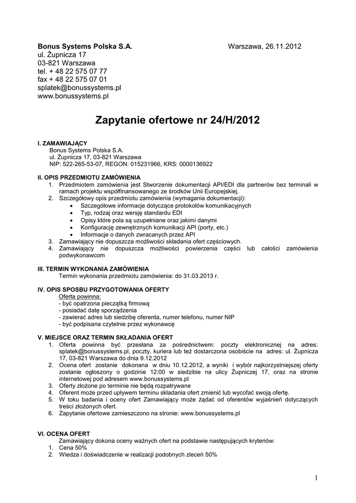 Bonus Systems Polska S.A. ul. Żupnicza 17 03-821 Warszawa tel. + 48 22 575 07 77 fax + 48 22 575 07 01 [email protected] www.bonussystems.pl Warszawa, 26.11.2012 Zapytanie ofertowe nr 24/H/2012 I. ZAMAWIAJĄCY Bonus Systems Polska S.A. ul. Żupnicza 17, 03-821 Warszawa NIP: 522-265-53-07, REGON: 015231966, KRS: 0000136922 II. OPIS PRZEDMIOTU ZAMÓWIENIA 1. Przedmiotem zamówienia jest Stworzenie dokumentacji API/EDI dla partnerów bez terminali w ramach projektu współfinansowanego ze środków Unii Europejskiej. 2. Szczegółowy opis przedmiotu zamówienia (wymagania dokumentacji): Szczegółowe informacje dotyczące protokołów komunikacyjnych Typ, rodzaj oraz wersję standardu EDI Opisy które pola są uzupełniane oraz jakimi danymi Konfigurację zewnętrznych komunikacji API (porty, etc.) Informacje o danych zwracanych przez API 3. Zamawiający nie dopuszcza możliwości składania ofert częściowych. 4. Zamawiający nie dopuszcza możliwości powierzenia części lub całości zamówienia podwykonawcom III. TERMIN WYKONANIA ZAMÓWIENIA Termin wykonania przedmiotu zamówienia: do 31.03.2013 r. IV. OPIS SPOSBU PRZYGOTOWANIA OFERTY Oferta powinna: - być opatrzona pieczątką firmową - posiadać datę sporządzenia - zawierać adres lub siedzibę oferenta, numer telefonu, numer NIP - być podpisana czytelnie przez wykonawcę V. MIEJSCE ORAZ TERMIN SKŁADANIA OFERT 1. Oferta powinna być przesłana za pośrednictwem: poczty elektronicznej na adres: [email protected], poczty, kuriera lub też dostarczona osobiście na adres: ul. Żupnicza 17, 03-821 Warszawa do dnia 9.12.2012 2. Ocena ofert zostanie dokonana w dniu 10.12.2012, a wyniki i wybór najkorzystniejszej oferty zostanie ogłoszony o godzinie 12:00 w siedzibie na ulicy Żupniczej 17, oraz na stronie internetowej pod adresem www.bonussystems.pl 3. Oferty złożone po terminie nie będą rozpatrywane 4. Oferent może przed upływem terminu składania ofert zmienić lub wycofać swoją ofertę. 5. W toku badania i oceny ofert Zamawiający może żądać od oferentów wyjaśnień dotyczących treści złożonych ofert. 6. Zapytanie ofertowe zamieszczono na stronie: www.bonussystems.pl VI. OCENA OFERT Zamawiający dokona oceny ważnych ofert na podstawie następujących kryteriów: 1. Cena 50% 2. Wiedza i doświadczenie w realizacji podobnych zleceń 50% 1 VII. INFORMACJE DOTYCZĄCE WYBORU NAJKORZYSTNIEJSZEJ OFERTY O wyborze najkorzystniejszej oferty Zamawiający zawiadomi oferentów za pośrednictwem strony internetowej znajdującej się pod adresem www.bonussystems.pl VIII. DODATKOWE INFORMACJE Dodatkowych informacji udziela Stanisław Płatek pod numerem telefonu 501 533 981 oraz adresem email: [email protected] 2