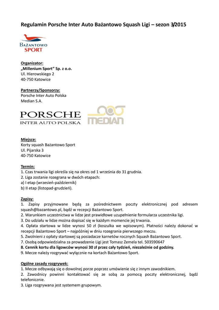 Regulamin Porsche Inter Auto Bażantowo Squash Ligi – sezon 3/2015