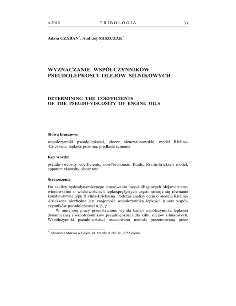4-2012 TRIBOLOGIA 33 Adam CZABAN *, Andrzej MISZCZAK* WYZNACZANIE WSPÓŁCZYNNIKÓW PSEUDOLEPKOŚCI OLEJÓW SILNIKOWYCH DETERMINING THE COEFFICIENTS OF THE PSEUDO-VISCOSITY OF ENGINE OILS Słowa kluczowe: współczynniki pseudolepkości, ciecze nienewtonowskie, model Rivlina-Ericksena, lepkość pozorna, prędkość ścinania Key words: pseudo-viscosity coefficients, non-Newtonian fluids, Rivlin-Ericksen model, apparent viscosity, shear rate Streszczenie Do analizy hydrodynamicznego smarowania łożysk ślizgowych olejami nienewtonowskimi o właściwościach lepkosprężystych często stosuje się równanie konstytutywne typu Rivlina-Ericksena. Podczas analizy oleju o modelu Rivlina-Ericksena niezbędna jest znajomość współczynnika lepkości η oraz współczynników pseudolepkości α, β, γ. W niniejszej pracy przedstawiono wyniki badań współczynnika lepkości dynamicznej i współczynników pseudolepkości dla kilku olejów silnikowych. Współczynniki pseudolepkości oszacowano metodą prezentowaną przez * Akademia Morska w Gdyni, ul. Morska 81/87, 81-225 Gdynia. 34 TRIBOLOGIA 4-2012 prof. K. Wierzcholskiego w publikacjach naukowych. Metoda ta polega na wyznaczeniu eksperymentalnym krzywych lepkości w szerokim zakresie prędkości ścinania. Kolejnym etapem jest opisanie tych krzywych formułą matematyczną i obliczenie pomocniczych współczynników. Ostatnim etapem jest wyznaczenie współczynników pseudolepkości z wykorzystaniem formuł podanych w literaturze przy znajomości wcześniej wyznaczonych współczynników i lepkości dynamicznej dla bardzo małych i bardzo dużych prędkości deformacji. WPROWADZENIE W ostatnich latach można zaobserwować coraz większy udział stosowania olejów półsyntetycznych i syntetycznych w procesie smarowania węzłów tarcia ślizgowego. Oleje te charakteryzują się nienewtonowskimi lepkosprężystymi właściwościami [L. 1]. Nienewtonowskimi olejami nazywa się takie ciecze, w których oprócz klasycznych zależności lepkości oleju od ciśnienia i temperatury występuje dodatkowo zależność lepkości od prędkości deformacji. Większość czynników smarujących jest modyfikowana czy też ulepszana chemicznie, co często powoduje, że mają one właściwości nienewtonowskie. Podobnie ciecze zanieczyszczone np. paliwem, wilgocią, kurzem, sadzą lub też produktami spalania w silniku spalinowym wykazują właściwości nienewtonowskie. Wymienione zanieczyszczenia i dodatki mogą powodować wzrost lub spadek lepkości czynnika smarującego w stosunku do bazowej cieczy smarującej. Znane są już od dawna różne modele opisujące właściwości cieczy smarujących łożyska ślizgowe. Oprócz klasycznego newtonowskiego modelu stosuje się najczęściej model potęgowy Reinera-Rivlina [L. 2–4] model cieczy o właściwościach plastycznych Binghama [L. 5], model płynu o naprężeniach momentowych [L. 6], model Maxwella dla oleju lepkosprężystego [L. 7] lub model Rivlina-Ericksena [L. 8–10], a także model opisujący właściwości mikropolarne [L. 11]. W Polsce teorie niekonwencjonalnego smarowania w krzywoliniowych ortogonalnych układach współrzędnych rozwiązali K. Wierzcholski [L. 4] oraz A. Walicka [L. 12]. Natomiast problem smarowania poprzecznych łożysk ślizgowych ferrocieczami o modelu Rivlina-Ericksena dokonał A. Miszczak [L. 8]. W dostępnej autorom literaturze nie znaleziono wartości współczynników pseudolepkości dla olejów silnikowych czy też ferrocieczy. Celem niniejszej pracy jest wyznaczenie współczynników pseudolepkości w równaniu konstytutywnym Rivlina-Ericksena dla wybranych nowych i eksploatowanych olejów silnikowych. 4-2012 TRIBOLOGIA 35 MODEL LEPKOŚCI POZORNEJ Związki fizyczne opisujące właściwości lepkosprężyste w olejach silnikowych można opisać zależnością pomiędzy naprężeniami a współrzędnymi prędkości deformacji, w których występują poszukiwane współczynniki pseudolepkości α, β, γ, a mianowicie [L. 8], [L. 13]: S = − pI + ηA1 + α(A1)2 + βA2 + γ(A1)2 A2 T T T A1 ≡ L + L , A2 ≡ grad a + (grad a) + 2L L a≡Lv+ ∂v , L ≡ grad v ∂t (1) (2) (3) gdzie: A1 – pierwszy tensor prędkości deformacji w [s−1], A2 – drugi tensor prędkości deformacji w [s−2], I – tensor jednostkowy, L − tensor gradientu z wektora prędkości [s−1], a − wektor przyspieszenia [m·s−2], η − współczynnik lepkości dynamicznej [Pa·s], p – ciśnienie hydrodynamiczne [Pa]. Zastąpienie tensorów przez ich ślady tr w członach opisujących lepkosprężyste właściwości cieczy smarującej ma pomijalny wpływ na zmianę naprężeń w przypadku cienkich warstw granicznych. Dlatego też zależność konstytutywną (1) można zapisać w przybliżonej postaci [L. 13]: trA 2 + γ trA1 trA 2 S ≅ − pI + A1 η + α trA1 + β trA1 (4) gdzie lepkość pozorna ma następującą postać [L. 13, 14]: ηp ≡ η + α trA1 + β trA 2 + γ trA1 trA 2 trA1 (5) We wzorze (5) zamiast śladu tensora trA1 można przyjąć wartości prędkości ścinania Θ natomiast za ślad tensora trA2 wartość prędkości ścinania w potędze drugiej Θ2. W opisie wyników badań doświadczalnych zmian lepkości dynamicznej od prędkości ścinania Θ można przyjąć dwie klasy funkcji opisujące te zmiany [L. 13]: Model I ηp (A, B b ) = η∞ + Model II ηp (A, Ba ) = η∞ + ηo − η∞ 1 + A ⋅ Θ + Bb ⋅ Θ 2 + Bb ⋅ Θ 2 ηo − η∞ 1 + A ⋅ Θ + Ba ⋅ Θ3 + Ba ⋅ Θ ⋅ Θ 2 (6) (7) TRIBOLOGIA 36 4-2012 gdzie: ηo – lepkość dynamiczna dla bardzo małych prędkości ścinania, η∞ – lepkość dynamiczna dla bardzo dużych prędkości ścinania, A, Ba, Bb – współczynniki. Dokonując pomiaru lepkości dynamicznej badanego czynnika smarującego dla różnych prędkości ścinania występujących w przewidywanym procesie smarowania, a następnie dokonując aproksymacji uzyskanych wyników doświadczalnych krzywymi (6) lub (7), znajdujemy wsp