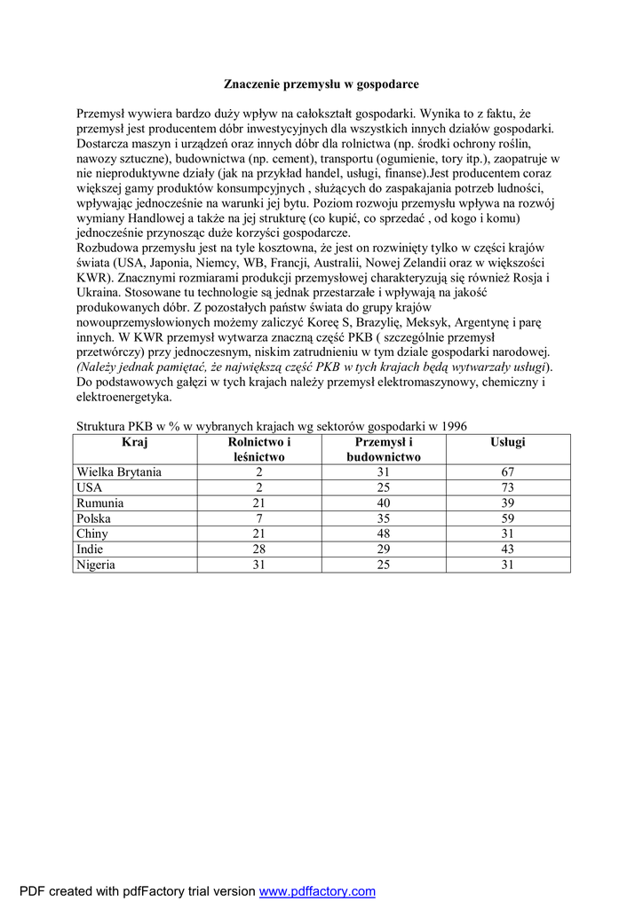 Znaczenie przemysłu w gospodarce Przemysł wywiera bardzo duży wpływ na całokształt gospodarki. Wynika to z faktu, że przemysł jest producentem dóbr inwestycyjnych dla wszystkich innych działów gospodarki. Dostarcza maszyn i urządzeń oraz innych dóbr dla rolnictwa (np. środki ochrony roślin, nawozy sztuczne), budownictwa (np. cement), transportu (ogumienie, tory itp.), zaopatruje w nie nieproduktywne działy (jak na przykład handel, usługi, finanse).Jest producentem coraz większej gamy produktów konsumpcyjnych , służących do zaspakajania potrzeb ludności, wpływając jednocześnie na warunki jej bytu. Poziom rozwoju przemysłu wpływa na rozwój wymiany Handlowej a także na jej strukturę (co kupić, co sprzedać , od kogo i komu) jednocześnie przynosząc duże korzyści gospodarcze. Rozbudowa przemysłu jest na tyle kosztowna, że jest on rozwinięty tylko w części krajów świata (USA, Japonia, Niemcy, WB, Francji, Australii, Nowej Zelandii oraz w większości KWR). Znacznymi rozmiarami produkcji przemysłowej charakteryzują się również Rosja i Ukraina. Stosowane tu technologie są jednak przestarzałe i wpływają na jakość produkowanych dóbr. Z pozostałych państw świata do grupy krajów nowouprzemysłowionych możemy zaliczyć Koreę S, Brazylię, Meksyk, Argentynę i parę innych. W KWR przemysł wytwarza znaczną część PKB ( szczególnie przemysł przetwórczy) przy jednoczesnym, niskim zatrudnieniu w tym dziale gospodarki narodowej. (Należy jednak pamiętać, że największą część PKB w tych krajach będą wytwarzały usługi). Do podstawowych gałęzi w tych krajach należy przemysł elektromaszynowy, chemiczny i elektroenergetyka. Struktura PKB w % w wybranych krajach wg sektorów gospodarki w 1996 Kraj Rolnictwo i Przemysł i leśnictwo budownictwo Wielka Brytania 2 31 USA 2 25 Rumunia 21 40 Polska 7 35 Chiny 21 48 Indie 28 29 Nigeria 31 25 PDF created with pdfFactory trial version www.pdffactory.com Usługi 67 73 39 59 31 43 31