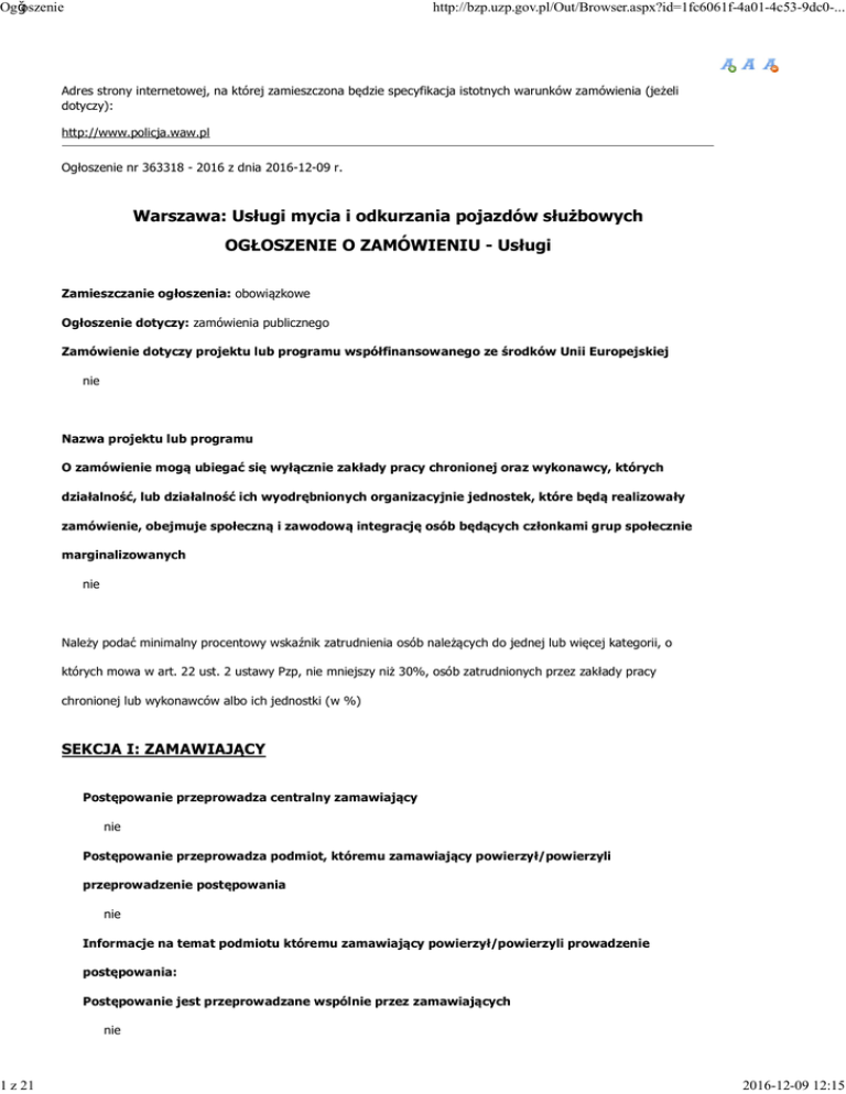 Ogłoszenie 1 z 21 http://bzp.uzp.gov.pl/Out/Browser.aspx?id=1fc6061f-4a01-4c53-9dc0-... Adres strony internetowej, na której zamieszczona będzie specyfikacja istotnych warunków zamówienia (jeżeli dotyczy): http://www.policja.waw.pl Ogłoszenie nr 363318 - 2016 z dnia 2016-12-09 r. Warszawa: Usługi mycia i odkurzania pojazdów służbowych OGŁOSZENIE O ZAMÓWIENIU - Usługi Zamieszczanie ogłoszenia: obowiązkowe Ogłoszenie dotyczy: zamówienia publicznego Zamówienie dotyczy projektu lub programu współfinansowanego ze środków Unii Europejskiej nie Nazwa projektu lub programu O zamówienie mogą ubiegać się wyłącznie zakłady pracy chronionej oraz wykonawcy, których działalność, lub działalność ich wyodrębnionych organizacyjnie jednostek, które będą realizowały zamówienie, obejmuje społeczną i zawodową integrację osób będących członkami grup społecznie marginalizowanych nie Należy podać minimalny procentowy wskaźnik zatrudnienia osób należących do jednej lub więcej kategorii, o których mowa w art. 22 ust. 2 ustawy Pzp, nie mniejszy niż 30%, osób zatrudnionych przez zakłady pracy chronionej lub wykonawców albo ich jednostki (w %) SEKCJA I: ZAMAWIAJĄCY Postępowanie przeprowadza centralny zamawiający nie Postępowanie przeprowadza podmiot, któremu zamawiający powierzył/powierzyli przeprowadzenie postępowania nie Informacje na temat podmiotu któremu zamawiający powierzył/powierzyli prowadzenie postępowania: Postępowanie jest przeprowadzane wspólnie przez zamawiających nie 2016-12-09 12:15 Ogłoszenie 2 z 21 http://bzp.uzp.gov.pl/Out/Browser.aspx?id=1fc6061f-4a01-4c53-9dc0-... Jeżeli tak, należy wymienić zamawiających, którzy wspólnie przeprowadzają postępowanie oraz podać adresy ich siedzib, krajowe numery identyfikacyjne oraz osoby do kontaktów wraz z danymi do kontaktów: Postępowanie jest przeprowadzane wspólnie z zamawiającymi z innych państw członkowskich Unii Europejskiej nie W przypadku przeprowadzania postępowania wspólnie z zamawiającymi z innych państw członkowskich Unii Europejskiej – mające zastosowanie krajowe prawo zamówień publicznych: Informacje dodatkowe: I. 1) NAZWA I ADRES: Komenda Stołeczna Policji, krajowy numer identyfikacyjny 1212648200000, ul. ul. Nowolipie 2, 00150 Warszawa, woj. mazowieckie, państwo Polska, tel. 22 6038608. 6037691, e-mail [email protected], faks 226 037 642. Adres strony internetowej (URL): www.policja.waw.pl I. 2) RODZAJ ZAMAWIAJĄCEGO: Administracja rządowa terenowa I.3) WSPÓLNE UDZIELANIE ZAMÓWIENIA (jeżeli dotyczy): Podział obowiązków między zamawiającymi w przypadku wspólnego przeprowadzania postępowania, w tym w przypadku wspólnego przeprowadzania postępowania z zamawiającymi z innych państw członkowskich Unii Europejskiej (który z zamawiających jest odpowiedzialny za przeprowadzenie postępowania, czy i w jakim zakresie za przeprowadzenie postępowania odpowiadają pozostali zamawiający, czy zamówienie będzie udzielane przez każdego z zamawiających indywidualnie, czy zamówienie zostanie udzielone w imieniu i na rzecz pozostałych zamawiających): I.4) KOMUNIKACJA: Nieograniczony, pełny i bezpośredni dostęp do dokumentów z postępowania można uzyskać pod adresem (URL) tak www.policja.waw.pl Adres strony internetowej, na której zamieszczona będzie specyfikacja istotnych warunków zamówienia tak www.policja.waw.pl 2016-12-09 12:15 Ogłoszenie 3 z 21 http://bzp.uzp.gov.pl/Out/Browser.aspx?id=1fc6061f-4a01-4c53-9dc0-... Dostęp do dokumentów z postępowania jest ograniczony - więcej informacji można uzyskać pod adresem nie Oferty lub wnioski o dopuszczenie do udziału w postępowaniu należy przesyłać: Elektronicznie nie adres Dopuszczone jest przesłanie ofert lub wniosków o dopuszczenie do udziału w postępowaniu w inny sposób: nie Wymagane jest przesłanie ofert lub wniosków o dopuszczenie do udziału w postępowaniu w inny sposób: tak Inny sposób: oferty oraz oświadczenia sporządza się pod rygorem nieważności w formie pisemnej Adres: Komenda Stołeczna Policji, ul. Nowolipie 2, 00-150 Warszawa Komunikacja elektroniczna wymaga korzystania z narzędzi i urządzeń lub formatów plików, które nie są ogólnie dostępne nie Nieograniczony, pełny, bezpośredni i bezpłatny dostęp do tych narzędzi można uzyskać pod adresem: (URL) SEKCJA II: PRZEDMIOT ZAMÓWIENIA II.1) Nazwa nadana zamówieniu przez zamawiającego: Usługi mycia i odkurzania pojazdów służbowych Numer referencyjny: WZP-4962/16/259/T Przed wszczęciem postępowania o udzielenie zamówienia przeprowadzono dialog techniczny nie II.2) Rodzaj zamówienia: usługi II.3) Informacja o możliwości składania ofert częściowych 2016-12-09 12:15 Ogłoszenie 4 z 21 http://bzp.uzp.gov.pl/Out/Browser.aspx?id=1fc6061f-4a01-4c53-9dc0-... Zamówienie podzielone jest na części: Tak Oferty lub wnioski o dopuszczenie do udziału w postępowaniu można składać w odniesieniu do: wszystkich części Maksymalna liczba części zamówienia, na które może zostać udzielone zamówienie jednemu wykonawcy: 9 II.4) Krótki opis przedmiotu zamówienia (wielkość, zakres, rodzaj i ilość dostaw, usług lub robót budowlanych lub określenie zapotrzebowania i wymagań ) a w przypadku partnerstwa innowacyjnego określenie zapotrzebowania na innowacyjny produkt, usługę lub roboty budowlane: 1. Przedmiotem zamówienia są usługi mycia zewnętrznego oraz odkurzania wnętrz pojazdów służbowych osobowych oraz typu furgon użytkowanych w jednostkach Policji realizowane w oparciu o dostarczone przez Wykonawcę karty flota lub karty płatnicze lub żetony zwane dalej "usługami” 2. Usługi mycia oraz odkurzania wykonywane będą na podstawie kart do bezgotówkowej realizacji usług lub żetonów, którymi dysponować będzie kierujący pojazdem. Wykonawca zapewni karty magnetyczne lub odpowiednio oznaczone żetony – w ilości zapewniającej wykonanie usług