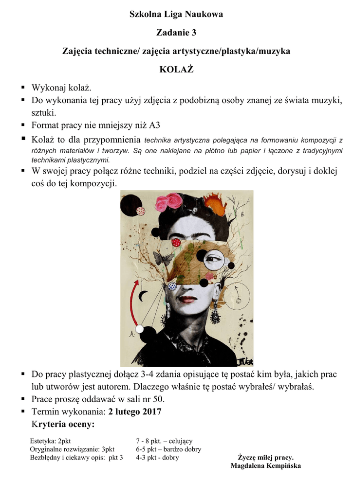 Szkolna Liga Naukowa Zadanie 3 Zajęcia techniczne/ zajęcia artystyczne/plastyka/muzyka KOLAŻ Wykonaj kolaż. Do wykonania tej pracy użyj zdjęcia z podobizną osoby znanej ze świata muzyki, sztuki. Format pracy nie mniejszy niż A3 Kolaż to dla przypomnienia technika artystyczna polegająca na formowaniu kompozycji z różnych materiałów i tworzyw. Są one naklejane na płótno lub papier i łączone z tradycyjnymi technikami plastycznymi. W swojej pracy połącz różne techniki, podziel na części zdjęcie, dorysuj i doklej coś do tej kompozycji. Do pracy plastycznej dołącz 3-4 zdania opisujące tę postać kim była, jakich prac lub utworów jest autorem. Dlaczego właśnie tę postać wybrałeś/ wybrałaś. Prace proszę oddawać w sali nr 50. Termin wykonania: 2 lutego 2017 Kryteria oceny: Estetyka: 2pkt Oryginalne rozwiązanie: 3pkt Bezbłędny i ciekawy opis: pkt 3 7 - 8 pkt. – celujący 6-5 pkt – bardzo dobry 4-3 pkt - dobry Życzę miłej pracy. Magdalena Kempińska