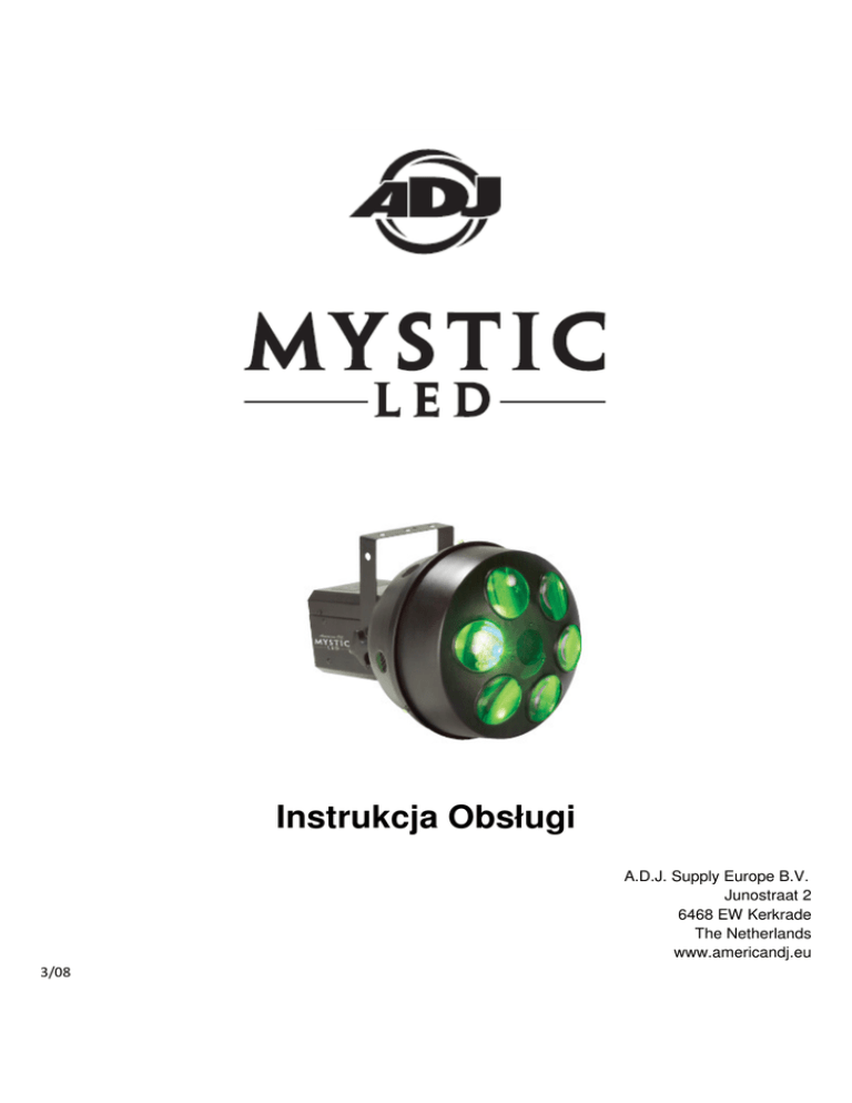 Instrukcja Obsługi A.D.J. Supply Europe B.V. Junostraat 2 6468 EW Kerkrade The Netherlands www.americandj.eu 3/08 Spis treści WSTĘP ..................................................................................................................................................................................... 3 WSKAZÓWKI OGÓLNE ............................................................................................................................................................ 3 CHARAKTERYSTYKA ................................................................................................................................................................. 3 ŚRODKI BEZPIECZEŃSTWA ...................................................................................................................................................... 4 USTAWIENIA ........................................................................................................................................................................... 5 MENU SYSTEMU ..................................................................................................................................................................... 7 OBSŁUGA URZĄDZENIA........................................................................................................................................................... 8 WYMIANA BEZPIECZNIKA ....................................................................................................................................................... 9 CECHY DMX ........................................................................................................................................................................... 10 CZYSZCZENIE ......................................................................................................................................................................... 11 USUWANIE USTEREK............................................................................................................................................................. 11 SPECYFIKACJA ....................................................................................................................................................................... 12 ROHS – ważny wkład w ochronę środowiska ....................................................................................................................... 13 WEEE – Utylizacja odpadów elektrycznych i elektronicznych .............................................................................................. 14 NOTATKI ................................................................................................................................................................................ 15 A.D.J. Supply Europe B.V. – www.americandj.eu – Mystic LED Instrukcja Obsługi Str. 2 WSTĘP Wypakowanie: Dziękujemy za zakup urządzenia świetlnego Mystic LED™ firmy American DJ®. KaŜdy egzemplarz urządzenia Mystic LED™ został gruntownie przetestowany, co jest gwarancją jego prawidłowego funkcjonowanie. Przed rozpakowaniem naleŜy sprawdzić czy opakowanie nie uległo uszkodzeniu w czasie transportu. W razie stwierdzenia uszkodzenia opakowania, naleŜy dokładnie sprawdzić, czy nie nastąpiło uszkodzenie sprzętu oraz upewnić się, Ŝe wszystkie części konieczne do obsługi urządzenia przybyły w stanie nienaruszonym. W razie stwierdzenia usterek lub braku części, naleŜy skontaktować się z bezpłatnym biurem obsługi klienta w celu uzyskania dalszych instrukcji. Prosimy o taki kontakt przed podjęciem decyzji o zwrocie urządzenia do sprzedawcy. Wstęp: Urządzenie Mystic LED™ powstało dzięki nieustannym wysiłkom firmy American DJ mającym na celu stworzenie niedrogich inteligentnych urządzeń świetlnych. Mystic LED™ firmy American DJ® jest inteligentnym urządzeniem diodowym kompatybilnym z systemem DMX, słuŜącym do tworzenia efektu Moonflower (drobne wzory świetlne). To lekkie i kompaktowe urządzenie zostało zaprojektowane z myślą nie tylko o klubach, ale równieŜ o DJach organizujących imprezy w kilku róŜnych miejscach. Mystic LED™ moŜe być uŜywane samodzielnie (Stand Alone) w trybie reakcji na dźwięk (Sound Active Mode) lub sterowane z poziomu konsoli DMX. Obsługa klienta: W razie jakichkolwiek problemów, prosimy o kontakt z zaufanym punktem sprzedaŜy American Audio. Istnieje równieŜ moŜliwość bezpośredniego kontaktu z nami. MoŜna to zrobić poprzez naszą stronę internetową www.americandj.eu oraz pisząc na adres: [email protected] OstrzeŜenie! Aby zapobiec lub zmniejszyć ryzyko poraŜenia prądem lub poŜaru, nie włączaj urządzenia w warunkach deszczowych lub przy podwyŜszonej wilgotności powietrza. OstrzeŜenie! Urządzenie moŜe powaŜnie uszkodzić wzrok. Nie naleŜy patrzeć bezpośrednio na źródło światła. PROSIMY o recykling opakowania, jeśli to moŜliwe. WSKAZÓWKI OGÓLNE Aby w pełni wykorzystać moŜliwości urządzenia, prosimy o przeczytanie instrukcji obsługi i zapoznanie się z podstawowymi funkcjami urządzenia. Instrukcja zawiera waŜne informacje dotyczące bezpieczeństwa obsługi oraz sposobu konserwacji urządzenia. Prosimy o zachowanie instrukcji obsługi w celu ponownego uŜycia. CHARAKTERYSTYKA • • • • • • Tryb Reakcji na Dźwięk oraz Programy Fabryczne Strobowanie Kolorem Światło Emitowane zbliŜone do światła z 250W Lampy Halogenowej Wbudowany Mikrofon Protokół DMX-512 (4 Kanały DMX) Sterownik UC3 (sprzedawany osobno) * Światło wyjściowe wzorowane i wizualnie porównywalne ze światłem emitowanym przez urządzenia z lampami halogenowymi. A.D.J. Supply Europe B.V. – www.americandj.eu – Mystic LED Instrukcja Obsługi Str. 3 ŚRODKI BEZPIECZEŃSTWA • • • • • • • • • • • • • • • • • Aby zmniejszyć ryzyko poraŜenia prądem lub poŜaru, nie włączaj urz