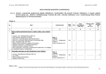 Nr sprawy: RZP-II-WI/42/DZP-1/2012 Zał cznik Nr 4 do SIWZ ZESTAWIENIE KOSZTÓW ZAMÓWIENIA dotyczy: dostawy wyposa enia pomieszcze jadalni oddziałowej i brudowników dla potrzeb Centrum Alzheimera w ramach zadania inwestycyjnego pn.: „Budowa wielofunkcyjnego Centrum dla osób z chorob Alzheimera wraz z modernizacj Domu Pomocy Społecznej przy ul. Nowoursynowskiej“. Tabela A. Cena jednostkowa netto PLN Warto netto PLN kol. 5 x 6 Stawka podatku VAT % Lp. Opis * pomieszczenie jedn. miary 1 2 3 4 5 6 7 8 Bud. A 1-Parter Pom.17/1 - Wydawanie posiłków w proj. oznaczono nr 6 kpl. 1 …………. ………….… ……. % Bud. A 1-Parter Pom.17/1 - Wydawanie posiłków w proj. oznaczono nr 7 kpl. 1 …………. ………….… ……. % 1. Stół ze zlewem jednokomorowym z szafk i półk , wraz z bateri /kpl/, • wymiary: szer.1200xgł.600xwys.850 mm • drzwi suwane zamykane na zamek • wykonany z wysokiej jako ci stali nierdzewnej A. • Komora o wymiarach 400×400×250 mm po rodku blatu. • Max. obci enie półki 750 N/m2. • Baterie zlewozmywakowe stoj ce chromowane, • regulator ceramiczny z nastaw temperatury, • obrotowa wylewka o długo ci 20-cm. • Syfon wykonany z tworzywa o podwy szonej odporno ci, ze wzgl du na zawarto tłuszczu i temperatur . 2. ilo Umywalka wykonana ze stali nierdzewnej, wraz z bateri . • wymiary: dług.400xszer.400xwys.200 mm. • c+z. woda. • Bateria staj ca chromowana, • regulator ceramiczny, Miejsce i data _______________________________________________________________________________________________________________________ (podpis/y osoby lub osób uprawnionych do reprezentowania Wykonawcy na podstawie odpisu z wła ciwego rejestru albo pełnomocnictwa) 1/8 Nr sprawy: RZP-II-WI/42/DZP-1/2012 Zał cznik Nr 4 do SIWZ • obrotowa wylewka o długo ci ok. 15cm. • Syfon wykonany z tworzywa o podwy szonej odporno ci, ze wzgl du na zawarto tłuszczu i temperatur . 3. Szafa przelotowa ze stali nierdzewnej, drzwi suwane z obydwu stron z czterema półkami. • wymiary: szer.800xgł.500xwys.2000 mm • Max. obci enie ka dej półki - 700 N/m2. 4. szt. 1 …………. ………….… ……. % Bud. A 1-Parter Pom.18/1 - Zmywalnia w proj. oznaczono nr 9 kpl. 1 …………. ………….… ……. % Bud. A 1-Parter Pom.18/1 - Zmywalnia w proj. oznaczono nr 10 szt. 1 …………. ………….… ……. % Stół ze zlewozmywakiem jednokomorowym z półk i miejscem na zmywark , wraz z bateri /kpl/, • wymiary: szer.1700xgł.600xwys.850 mm • wykonany ze stali nierdzewnej • c+z woda; • Max. obci enie półki 750 N/m2. • Bateria zlewozmywakowa stoj ca chromowana, • regulator ceramiczny z nastaw temperatury, • obrotowa wylewka o długo ci 20-cm. • Syfon wykonany z tworzywa o podwy szonej odporno ci, ze wzgl du na zawarto tłuszczu i temperatur . 5. Bud. A 1-Parter Pom.17/1 - Wydawanie posiłków w proj. oznaczono nr 8 Zmywarka (pod blatem) • wymiary: szer.600xgł.600xwys.820 mm • wyposa enie standardowe: kosz na talerze, kosz uniwersalny • przystosowana do pracy z koszami 50 x 50 cm. • dane inst. moc-6,0kW, nap. 400V; c+z. woda; • odprowadzenie do kanalizacji; • Jednopłaszczowa konstrukcja ze stali nierdzewnej; • funkcja wyparzania; • automatyczny przebieg cyklu zmywania programatorem synchronicznym, dolne i górne ramiona myj co-płucz ce; • odpływ grawitacyjny; • cykl mycia: 60-180 sekund; Miejsce i data ________________________________________________________________________________________________________________________ (podpis/y osoby lub osób uprawnionych do reprezentowania Wykonawcy na podstawie odpisu z wła ciwego rejestru albo pełnomocnictwa) 2/8 Nr sprawy: RZP-II-WI/42/DZP-1/2012 Zał cznik Nr 4 do SIWZ • dozownik płynu nabłyszczaj cego; • kosz do kubków i fili anek PB 100, wkład do mycia sztu ców PC 162; • kosz uniwersalny PU; • kubek do sztu ców PK 2 (8 szt.). 6. Stół przy cienny z szafk drzwi suwane zamykane na zamek • wymiary: szer.1200×gł.600×wys850 mm • wykonany z wysokiej jako ci stali nierdzewnej • Przestawna półka w szafce. • maksymalne obci enie półki 750 N/m2; 7. szt. 1 …………. ………….… ……. % Bud. A 1-Parter Pom.17/1 - Wydawanie posiłków w proj. oznaczono nr 3 szt. 1 …………. ………….… ……. % Bud. A 1-Parter Pom.17/1 - Wydawanie posiłków w proj. oznaczono nr 4 szt. 2 …………. ………….… ……. % Lodówka jednodrzwiowa • wymiary wys.1800xszer.600xgł.600mm • kolor stal nierdzewna • bez zamra alnika • liczba agregatów – 1 • klasa energetyczna A+ • automatyczny sposób rozmra ania chłodziarki • sterowanie elektroniczne • elektroniczna regulacja temperatury • mo liwo otwierania drzwi na prawo • nogi regulowane • o wietlenie wewn trzne 8. Bud. A 1-Parter Pom.17/1 - Wydawanie posiłków w proj. oznaczono nr 1 Stół przy cienny z szafk • wymiary: szer.1200×gł.600×wys.850 mm • drzwi suwane zamykane na zamek • wykonany z wysokiej jako ci stali nierdzewnej • Półka w szafce + dwie pionowe przegrody • maksymalne obci enie półki 700 N/m2. Miejsce i data ________________________________________________________________________________________________________________________ (podpis/y osoby lub osób uprawnionych do reprezentowania Wykonawcy na podstawie odpisu z wła ciwego rejestru albo pełnomocnictwa) 3/8 Nr sprawy: RZP-II-WI/42/DZP-1/2012 9. Szafka wisz ca zamykana na zamek • drzwi suwane • wymiary: szer1200×gł.300×wys.600 mm • wykonana z wysokiej jako ci stali nierdzewnej • Przestawna półka. • maksymalne obci enie półki 700N/m2 10. Bud. A 1-Parter Pom.17/1 - Wydawanie posiłków w proj. oznaczono nr 5 szt. 2 …………. ………….… ……. % Bud. A 1-Parter Pom.18/1 - Zmywalnia w proj. oznaczono nr 11 szt. 1 …………. ………….… ……. % Bud. A 1-parter Pom.40/1 - brudownik1szt. 2-pi tro Pom.46/2 - brudownik1szt. w proj. oznaczone nr 1 kpl. 