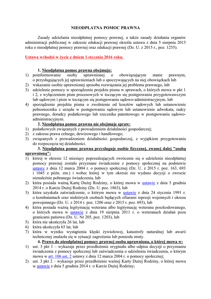NIEODPŁATNA POMOC PRAWNA Zasady udzielania nieodpłatnej pomocy prawnej, a także zasady działania organów administracji publicznej w zakresie edukacji prawnej określa ustawa z dnia 5 sierpnia 2015 roku o nieodpłatnej pomocy prawnej oraz edukacji prawnej (Dz. U. z 2015 r., poz. 1255). Ustawa wchodzi w życie z dniem 1 stycznia 2016 roku. 1. Nieodpłatna pomoc prawna obejmuje: 1) poinformowanie osoby uprawnionej o obowiązującym stanie prawnym, o przysługujących jej uprawnieniach lub o spoczywających na niej obowiązkach lub 2) wskazanie osobie uprawnionej sposobu rozwiązania jej problemu prawnego, lub 3) udzielenie pomocy w sporządzeniu projektu pisma w sprawach, o których mowa w pkt 1 i 2, z wyłączeniem pism procesowych w toczącym się postępowaniu przygotowawczym lub sądowym i pism w toczącym się postępowaniu sądowo-administracyjnym, lub 4) sporządzenie projektu pisma o zwolnienie od kosztów sądowych lub ustanowienie pełnomocnika z urzędu w postępowaniu sądowym lub ustanowienie adwokata, radcy prawnego, doradcy podatkowego lub rzecznika patentowego w postępowaniu sądowoadministracyjnym. 2. Nieodpłatna pomoc prawna nie obejmuje spraw: 1) podatkowych związanych z prowadzeniem działalności gospodarczej; 2) z zakresu prawa celnego, dewizowego i handlowego; 3) związanych z prowadzeniem działalności gospodarczej, z wyjątkiem przygotowania do rozpoczęcia tej działalności. 3. Nieodpłatna pomoc prawna przysługuje osobie fizycznej, zwanej dalej "osobą uprawnioną": 1) której w okresie 12 miesięcy poprzedzających zwrócenie się o udzielenie nieodpłatnej pomocy prawnej zostało przyznane świadczenie z pomocy społecznej na podstawie ustawy z dnia 12 marca 2004 r. o pomocy społecznej (Dz. U. z 2015 r. poz. 163, 693 i 1045 z późn. zm.) i wobec której w tym okresie nie wydano decyzji o zwrocie nienależnie pobranego świadczenia, lub 2) która posiada ważną Kartę Dużej Rodziny, o której mowa w ustawie z dnia 5 grudnia 2014 r. o Karcie Dużej Rodziny (Dz. U. poz. 1863), lub 3) która uzyskała zaświadczenie, o którym mowa w ustawie z dnia 24 stycznia 1991 r. o kombatantach oraz niektórych osobach będących ofiarami represji wojennych i okresu powojennego (Dz. U. z 2014 r. poz. 1206 oraz z 2015 r. poz. 693), lub 4) która posiada ważną legitymację weterana albo legitymację weterana poszkodowanego, o których mowa w ustawie z dnia 19 sierpnia 2011 r. o weteranach działań poza granicami państwa (Dz. U. Nr 205, poz. 1203), lub 5) która nie ukończyła 26 lat, lub 6) która ukończyła 65 lat, lub 7) która w wyniku wystąpienia klęski żywiołowej, katastrofy naturalnej lub awarii technicznej znalazła się w sytuacji zagrożenia lub poniosła straty. 4. Prawo do nieodpłatnej pomocy prawnej osoba uprawniona, o której mowa w: 1) ust. 3 pkt 1 – wykazuje przez przedłożenie oryginału albo odpisu decyzji o przyznaniu świadczenia z pomocy społecznej lub zaświadczenia o udzieleniu świadczenia, o którym mowa w art. 106 ust. 2 ustawy z dnia 12 marca 2004 r. o pomocy społecznej; 2) ust. 3 pkt 2 – wykazuje przez przedłożenie ważnej Karty Dużej Rodziny, o której mowa w ustawie z dnia 5 grudnia 2014 r. o Karcie Dużej Rodziny; 3) ust. 3 pkt 3 – wykazuje przez przedłożenie zaświadczenia, o którym mowa w ustawie z dnia 24 stycznia 1991 r. o kombatantach oraz niektórych osobach będących ofiarami represji wojennych i okresu powojennego; 4) ust. 3 pkt 4 – wykazuje przez przedłożenie ważnej legitymacji weterana albo legitymacji weterana poszkodowanego, o których mowa w ustawie z dnia 19 sierpnia 2011 r. o weteranach działań poza granicami państwa; 5) ust. 3 pkt 5 i 6 – wykazuje przez przedłożenie dokumentu stwierdzającego tożsamość; 6) ust. 3 pkt 7 – wykazuje przez złożenie oświadczenia, że zachodzi co najmniej jedna z okoliczności wymienionych w tym przepisie. 5. Informacja o lokalizacji punktów nieodpłatnej pomocy prawnej wraz z harmonogramem wskazującym dni i godziny, w których jest udzielana nieodpłatna pomoc prawna: GMINA BARCZEWO PUNKT NIEODPŁATNEJ POMOCY PRAWNEJ W BARCZEWIE Urząd Miejski w Barczewie, Plac Ratuszowy 1, pokój Nr 24 Nieodpłatna pomoc prawna jest udzielana przez organizację pozarządową: Fundacja „Inicjatywa Kobiet Aktywnych”, z siedzibą: 10-687 Olsztyn, ul. Hanowskiego 9/42. Pomoc jest świadczona przez adwokata i radcę prawnego. Poniedziałek Wtorek Środa Czwartek Piątek godz. 9.00–13.00 godz. 11.00–15.00 godz. 9.00–13.00 godz. 11.00–15.00 godz. 9.00–13.00 GMINA OLSZTYNEK PUNKT NIEODPŁATNEJ POMOCY PRAWNEJ W OLSZTYNKU Urząd Miejski w Olsztynku, ul. Ratusz 1, pokój Nr 7a Nieodpłatna pomoc prawna jest udzielana przez organizację pozarządową: Stowarzyszenie Inicjatyw Obywatelskich „Wizja Lokalna”, z siedzibą: 10-089 Olsztyn, ul. Rymkiewicza 4. Pomoc jest świadczona przez adwokata oraz osobę, o której mowa w art. 11 ust. 3 pkt 2 ustawy o nieodpłatnej pomocy prawnej oraz edukacji prawnej Poniedziałek Wtorek Środa godz. 8.30–12.30 godz. 12.30–16.30 godz. 12.30–16.30 Czwartek Piątek godz. 12.30–16.30 godz. 12.30–16.30 GMINA STAWIGUDA PUNKT NIEODPŁATNEJ POMOCY PRAWNEJ W STAWIGUDZIE Gminny Ośrodek Pomocy Społecznej, ul. Olsztyńska 10, pokój Nr 1 Nieodpłatna pomoc prawna jest udzielana przez organizację pozarządową: Stowarzyszenie Inicjatyw Obywatelskich „Wizja Lokalna”, z siedzibą: 10-089 Olsztyn, ul. Rymkiewicza 4. Pomoc jest świadczona przez adwokata oraz osobę, o której mowa w art. 11 ust. 3 pkt 2 ustawy o nieodpłatnej pomocy prawnej oraz edukacji prawnej Poniedziałek Wtorek Środa Czwartek Piątek godz. 13.00–17.00 godz. 8.00–12.00 godz. 8.00–12.00 godz. 8.00–12.00 godz. 8.00–12.00 GMINA BISKUPIEC PUNKT NIEODPŁATNEJ POMOCY PRAWNEJ W BISKUPCU SORBOMA Dom Pracy Twórczej, ul. Wawelska 2, pokój Nr 1 Nieodpłatna pomoc prawna jest udzielana przez adwokatów oraz radców prawnych. Poniedziałek Wtorek 