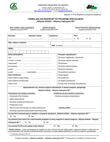 POWIATOWY URZĄD PRACY W LEŻAJSKU 37-300 Leżajsk, ul. Mickiewicza 56 tel.: 17 242 73 73, 240 67 20; fax: 240 67 29 http://www.praca.lezajsk.pl e-mail: [email protected] Załącznik nr 1B do Regulaminu programów specjalnych FORMULARZ ZGŁOSZENIOWY DO PROGRAMU SPECJALNEGO „Aktywna kobieta – Aktywny mężczyzna 50+” ………………………………………… Data i podpis osoby przyjmującej (wypełnia pracownik PUP) Nazwisko …………………….. godzina przyjęcia (wypełnia pracownik PUP) Nazwisko rodowe: ………..………………………………………………….. ………………………………………… Numer formularza zgłoszeniowego (wypełnia pracownik PUP) Imię/Imiona: Płeć*: …………………..…………………. K M Data i miejsce urodzenia: ……………………………………………………………… Wiek (w latach)……..…………………………………………… PESEL: Adres zamieszkania: Posiadam wykształcenie*: ulica .............................................................................................. wyższe magisterskie / inżynierskie nr domu / nr lokalu ……………………........................…………… wyższe niepełne (licencjat) miejscowość………………………………………............................. policealne kod pocztowy …………………………………….. ............................... …... średnie ogólnokształcące poczta ………………………………………….…. ............................... …... średnie zawodowe powiat ……………………… województwo…………………………. zasadnicze zawodowe Dane kontaktowe: gimnazjalne Numer telefonu stacjonarnego …………………………………… podstawowe Numer telefonu komórkowego …………………………………… niepełne podstawowe Adres e-mail: ………………………………………………………. brak (brak formalnego wykształcenia) Zapoznałem/am się z formami wsparcia oferowanymi w ramach programu specjalnego „Aktywna kobieta – Aktywny mężczyzna 50+”: Obowiązkowe (dla każdego uczestnika): Dodatkowe (nie dla wszystkich uczestników): − Indywidualny Plan Działania − Szkolenia zawodowe (indywidualne) − Zajęcia aktywizacyjne − Warsztaty kompetencji społecznych − Pośrednictwo pracy − Staż lub prace interwencyjne lub roboty publiczne lub Czytelny podpis: …………………………………………. refundacja wyposażenia/doposażenia stanowiska pracy Czy jest Pan/i zainteresowany/a udziałem w programie specjalnym „Aktywna kobieta – Aktywny mężczyzna 50+”*: Tak Nie Czy zamierza Pan/i starać się o zwrot kosztów przejazdu na formy wsparcia w ramach programu „Aktywna kobieta – Aktywny mężczyzna 50+”*: Tak Nie Czy posiada Pan/Pani pod opieką osobę zależną?: Tak Nie *Osoba zależna - osoba wymagającą ze względu na stan zdrowia lub wiek stałej opieki, połączona więzami rodzinnymi lub powinowactwem lub wspólnym gospodarstwem domowym z osobą objętą działaniami w ramach programu specjalnego. (*) właściwe zaznaczyć (, ) Program specjalny „Aktywna kobieta – Aktywny mężczyzna 50+” finansowany ze środków Funduszu Pracy POWIATOWY URZĄD PRACY W LEŻAJSKU 37-300 Leżajsk, ul. Mickiewicza 56 tel.: 17 242 73 73, 240 67 20; fax: 240 67 29 http://www.praca.lezajsk.pl e-mail: [email protected] OŚWIADCZENIA: Uprzedzony/a o odpowiedzialności karnej z art. 233 Kodeksu Karnego §1 za złożenie nieprawdziwego oświadczenia lub zatajenie prawdy oświadczam, że w/w dane osobowe są zgodne z prawdą. Ponadto po zapoznaniu się z art. 27 ust.2 pkt 1) oraz w związku z art. 7 pkt 5 ustawy z dnia 29 sierpnia 1997r. o ochronie danych osobowych tekst jednolity Dz.U. z 2002r. Nr 101, poz.926 ze zm., wyrażam zgodę na przetwarzanie moich danych osobowych, w tym danych wrażliwych, przez Powiatowy Urząd Pracy w Leżajsku niezbędne do realizacji programu „Aktywna kobieta – Aktywny mężczyzna 50+” finansowanego ze środków Funduszu Pracy. Leżajsk: Data Czytelny podpis Art. 233. Kodeksu Karnego § 1. Kto, składając zeznanie mające służyć za dowód w postępowaniu sądowym lub w innym postępowaniu prowadzonym na podstawie ustawy, zeznaje nieprawdę lub zataja prawdę, podlega karze pozbawienia wolności do lat 3. Oświadczam, że moje miejsce zamieszkania znajduje się na terenie powiatu leżajskiego oraz oświadczam, że mieszkam*: w mieście na wsi Leżajsk: data Czytelny podpis Oświadczam, że:* jestem zarejestrowany/a w Powiatowym Urzędzie Pracy w Leżajsku i posiadam status osoby bezrobotnej w momencie przystąpienia do programu specjalnego mam ukończony 50 rok życia. Leżajsk: Data Czytelny podpis Oświadczam, że zapoznałem/am się z Regulaminem realizacji programów specjalnych „Mama idzie do pracy” i „Aktywna kobieta – Aktywny mężczyzna 50+” w Powiatowym Urzędzie Pracy w Leżajsku i akceptuję jego zapisy. Leżajsk: data Czytelny podpis UWAGA: ZŁOŻENIE FORMULARZA NIE OZNACZA ZAKWALIFIKOWANIA SIĘ DO PROGRAMU SPECJALNEGO! Informacja: 1) Złożony formularz zgłoszeniowy podlega weryfikacji przez pracowników Powiatowego Urzędu Pracy w Leżajsku pod kątem oddalenia danego kandydata od rynku pracy i gotowości wejścia lub powrotu na rynek pracy. 2) Warunkiem koniecznym do udziału w programie specjalnym jest posiadanie III profilu pomocy w myśl art. 33 ust. 2c, pkt 3 Ustawy o promocji zatrudnienia i instytucjach rynku pracy (Dz. U. 2015 poz. 149). (*) właściwe zaznaczyć (, ) Program specjalny „Aktywna kobieta – Aktywny mężczyzna 50+” finansowany ze środków Funduszu Pracy