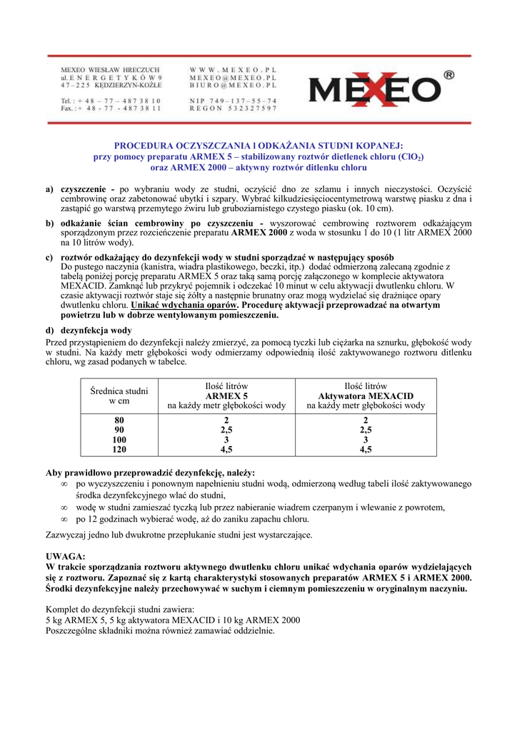 PROCEDURA OCZYSZCZANIA l ODKAŻANIA STUDNI KOPANEJ: przy pomocy preparatu ARMEX 5 – stabilizowany roztwór dietlenek chloru (ClO2) oraz ARMEX 2000 – aktywny roztwór ditlenku chloru a) czyszczenie - po wybraniu wody ze studni, oczyścić dno ze szlamu i innych nieczystości. Oczyścić cembrowinę oraz zabetonować ubytki i szpary. Wybrać kilkudziesięciocentymetrową warstwę piasku z dna i zastąpić go warstwą przemytego żwiru lub gruboziarnistego czystego piasku (ok. 10 cm). b) odkażanie ścian cembrowiny po czyszczeniu - wyszorować cembrowinę roztworem odkażającym sporządzonym przez rozcieńczenie preparatu ARMEX 2000 z woda w stosunku 1 do 10 (1 litr ARMEX 2000 na 10 litrów wody). c) roztwór odkażający do dezynfekcji wody w studni sporządzać w następujący sposób Do pustego naczynia (kanistra, wiadra plastikowego, beczki, itp.) dodać odmierzoną zalecaną zgodnie z tabelą poniżej porcję preparatu ARMEX 5 oraz taką samą porcję załączonego w komplecie aktywatora MEXACID. Zamknąć lub przykryć pojemnik i odczekać 10 minut w celu aktywacji dwutlenku chloru. W czasie aktywacji roztwór staje się żółty a następnie brunatny oraz mogą wydzielać się drażniące opary dwutlenku chloru. Unikać wdychania oparów. Procedurę aktywacji przeprowadzać na otwartym powietrzu lub w dobrze wentylowanym pomieszczeniu. d) dezynfekcja wody Przed przystąpieniem do dezynfekcji należy zmierzyć, za pomocą tyczki lub ciężarka na sznurku, głębokość wody w studni. Na każdy metr głębokości wody odmierzamy odpowiednią ilość zaktywowanego roztworu ditlenku chloru, wg zasad podanych w tabelce. Średnica studni w cm Ilość litrów ARMEX 5 na każdy metr głębokości wody Ilość litrów Aktywatora MEXACID na każdy metr głębokości wody 80 90 100 120 2 2,5 3 4,5 2 2,5 3 4,5 Aby prawidłowo przeprowadzić dezynfekcję, należy: • po wyczyszczeniu i ponownym napełnieniu studni wodą, odmierzoną według tabeli ilość zaktywowanego środka dezynfekcyjnego wlać do studni, • wodę w studni zamieszać tyczką lub przez nabieranie wiadrem czerpanym i wlewanie z powrotem, • po 12 godzinach wybierać wodę, aż do zaniku zapachu chloru. Zazwyczaj jedno lub dwukrotne przepłukanie studni jest wystarczające. UWAGA: W trakcie sporządzania roztworu aktywnego dwutlenku chloru unikać wdychania oparów wydzielających się z roztworu. Zapoznać się z kartą charakterystyki stosowanych preparatów ARMEX 5 i ARMEX 2000. Środki dezynfekcyjne należy przechowywać w suchym i ciemnym pomieszczeniu w oryginalnym naczyniu. Komplet do dezynfekcji studni zawiera: 5 kg ARMEX 5, 5 kg aktywatora MEXACID i 10 kg ARMEX 2000 Poszczególne składniki można również zamawiać oddzielnie.