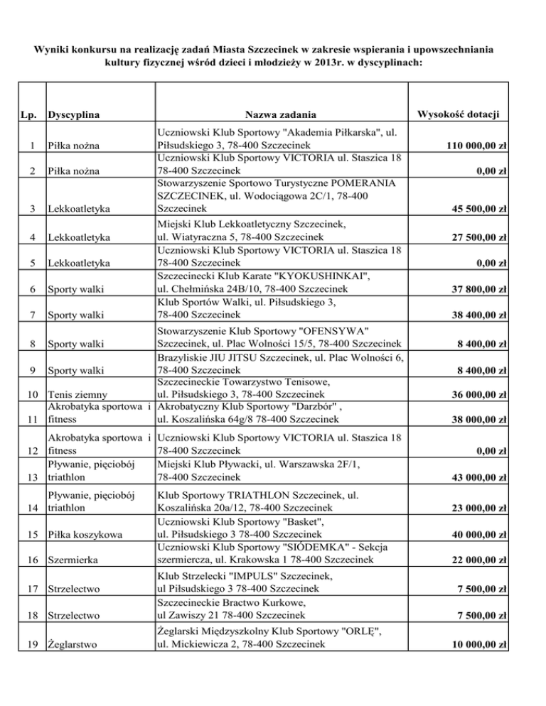 Wyniki konkursu na realizację zadań Miasta Szczecinek w zakresie wspierania i upowszechniania kultury fizycznej wśród dzieci i młodzieŜy w 2013r. w dyscyplinach: Lp. Dyscyplina 1 Piłka noŜna 2 Piłka noŜna 3 Lekkoatletyka 4 Lekkoatletyka 5 Lekkoatletyka 6 Sporty walki 7 Sporty walki Nazwa zadania Uczniowski Klub Sportowy "Akademia Piłkarska", ul. Piłsudskiego 3, 78-400 Szczecinek Uczniowski Klub Sportowy VICTORIA ul. Staszica 18 78-400 Szczecinek Stowarzyszenie Sportowo Turystyczne POMERANIA SZCZECINEK, ul. Wodociągowa 2C/1, 78-400 Szczecinek Miejski Klub Lekkoatletyczny Szczecinek, ul. Wiatyraczna 5, 78-400 Szczecinek Uczniowski Klub Sportowy VICTORIA ul. Staszica 18 78-400 Szczecinek Szczecinecki Klub Karate "KYOKUSHINKAI", ul. Chełmińska 24B/10, 78-400 Szczecinek Klub Sportów Walki, ul. Piłsudskiego 3, 78-400 Szczecinek Stowarzyszenie Klub Sportowy "OFENSYWA" Szczecinek, ul. Plac Wolności 15/5, 78-400 Szczecinek 8 Sporty walki Brazyliskie JIU JITSU Szczecinek, ul. Plac Wolności 6, 78-400 Szczecinek 9 Sporty walki Szczecineckie Towarzystwo Tenisowe, ul. Piłsudskiego 3, 78-400 Szczecinek 10 Tenis ziemny Akrobatyka sportowa i Akrobatyczny Klub Sportowy "Darzbór" , ul. Koszalińska 64g/8 78-400 Szczecinek 11 fitness Wysokość dotacji 110 000,00 zł 0,00 zł 45 500,00 zł 27 500,00 zł 0,00 zł 37 800,00 zł 38 400,00 zł 8 400,00 zł 8 400,00 zł 36 000,00 zł 38 000,00 zł Akrobatyka sportowa i Uczniowski Klub Sportowy VICTORIA ul. Staszica 18 78-400 Szczecinek 12 fitness Pływanie, pięciobój Miejski Klub Pływacki, ul. Warszawska 2F/1, 78-400 Szczecinek 13 triathlon 43 000,00 zł Pływanie, pięciobój 14 triathlon 23 000,00 zł 15 Piłka koszykowa 16 Szermierka Klub Sportowy TRIATHLON Szczecinek, ul. Koszalińska 20a/12, 78-400 Szczecinek Uczniowski Klub Sportowy "Basket", ul. Piłsudskiego 3 78-400 Szczecinek Uczniowski Klub Sportowy "SIÓDEMKA" - Sekcja szermiercza, ul. Krakowska 1 78-400 Szczecinek 18 Strzelectwo Klub Strzelecki "IMPULS" Szczecinek, ul Piłsudskiego 3 78-400 Szczecinek Szczecineckie Bractwo Kurkowe, ul Zawiszy 21 78-400 Szczecinek 19 śeglarstwo śeglarski Międzyszkolny Klub Sportowy "ORLĘ", ul. Mickiewicza 2, 78-400 Szczecinek 17 Strzelectwo 0,00 zł 40 000,00 zł 22 000,00 zł 7 500,00 zł 7 500,00 zł 10 000,00 zł 20 Szachy Towarzystwo Szachowe "TAKTYK", ul. 9-go Maja 12, 78-400 Szczecinek 21 Badminton Stowarzyszenie Sportowe "BADMINTON", ul. Wodociągowa 22A/6 78-400 Szczecinek 10 000,00 zł 22 Piłka siatkowa Miejski Klub Sportowy "GRYF", ul Piłsudskiego 3 78-400 Szczecinek 37 700,00 zł 23 Piłka siatkowa Międzyszkolny Klub Sportowy "VOLLEY", ul. 1-go Maja 22, 78-400 Szczecinek Narty wodne i 24 Wakeboarding Szczecinecki Klub Wakeboardingu i Narciarstwa Wodnego, ul. Mickiewicza 2, 78-400 Szczecinek 12 000,00 zł Narty wodne i 25 Wakeboarding Szczecinecki Klub Wakeboardingu "KABEL", ul. Piłsudskiego 3, 78-400 Szczecinek 12 000,00 zł 26 Rezerwa Razem Zatwierdzone dnia 15 stycznia 2013 roku Burmistrz Miasta Jerzy Hardie - Douglas Sporządziła: Jóskowska Ewa 6 300,00 zł 19 000,00 zł 600 000,00 zł