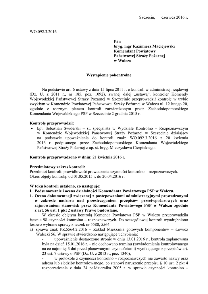 Szczecin, czerwca 2016 r. WO.092.3.2016 Pan bryg. mgr Kazimierz Maciejewski Komendant Powiatowy Państwowej Straży Pożarnej w Wałczu Wystąpienie pokontrolne Na podstawie art. 6 ustawy z dnia 15 lipca 2011 r. o kontroli w administracji rządowej (Dz. U. z 2011 r., nr 185, poz. 1092), zwanej dalej „ustawą”, kontroler Komendy Wojewódzkiej Państwowej Straży Pożarnej w Szczecinie przeprowadził kontrolę w trybie zwykłym w Komendzie Powiatowej Państwowej Straży Pożarnej w Wałczu ul. 12 lutego 20, zgodnie z rocznym planem kontroli zatwierdzonym przez Zachodniopomorskiego Komendanta Wojewódzkiego PSP w Szczecinie 2 grudnia 2015 r. Kontrolę przeprowadził: kpt. Sebastian Świderski – st. specjalista w Wydziale Kontrolno – Rozpoznawczym w Komendzie Wojewódzkiej Państwowej Straży Pożarnej w Szczecinie działający na podstawie upoważnienia do kontroli znak: WO.092.3.2016 z 20 kwietnia 2016 r. podpisanego przez Zachodniopomorskiego Komendanta Wojewódzkiego Państwowej Straży Pożarnej z up. st. bryg. Mieczysława Cierpickiego. Kontrolę przeprowadzono w dniu: 21 kwietnia 2016 r. Przedmiotowy zakres kontroli: Przedmiot kontroli: prawidłowość prowadzenia czynności kontrolno – rozpoznawczych. Okres objęty kontrolą: od 01.05.2015 r. do 20.04.2016 r. W toku kontroli ustalono, co następuje: I. Podsumowanie i ocena działalności Komendanta Powiatowego PSP w Wałczu. 1. Ocena dokumentacji związanej z postępowaniami administracyjnymi prowadzonymi w zakresie nadzoru nad przestrzeganiem przepisów przeciwpożarowych oraz zajmowaniem stanowisk przez Komendanta Powiatowego PSP w Wałczu zgodnie z art. 56 ust. 1 pkt 2 ustawy Prawo budowlane. W okresie objętym kontrolą Komenda Powiatowa PSP w Wałczu przeprowadziła łącznie 98 czynności kontrolno – rozpoznawczych. Do szczegółowej kontroli wyodrębniono losowo wybrane sprawy z teczek nr 5580, 5564: a) sprawa znak PZ.5564.2.2016 – Zakład Mieszania gotowych komponentów – Łowicz Wałecki 56. W sprawie stwierdzono następujące uchybienia: upoważnienie dostarczono stronie w dniu 13.01.2016 r., kontrola zaplanowana była na dzień 15.01.2016 r. – nie dochowano terminu (zawiadomienia kontrolowanego na co najmniej 3 dni przed planowanymi czynnościami) wynikającego z przepisów art. 23 ust. 7 ustawy o PSP (Dz. U. z 2013 r., poz. 1340), w protokole z czynności kontrolno – rozpoznawczych nie zawarto nazwy oraz adresu lub siedziby kontrolowanego, co stanowi naruszenie przepisu § 10 ust. 2 pkt 4 rozporządzenia z dnia 24 października 2005 r. w sprawie czynności kontrolno – rozpoznawczych przeprowadzanych przez Państwową Straż Pożarną (Dz. U. Nr 225, poz. 1934) – dalej rozporządzenia. Powyższe zagadnienie ocenia się pozytywnie z uchybieniami. b) sprawa znak PZ.5564.15.2015 – Lidl, ul Budowlanych 1A. W niniejszej sprawie stwierdzono następujące uchybienia: upoważnienie dostarczono stronie w dniu 13.04.2016 r., kontrola zaplanowana była na dzień 14.04.2016 r. – nie dochowano terminu wynikającego z przepisów art. 23 ust. 7 ustawy o PSP, w protokole z czynności kontrolno – rozpoznawczych nie zawarto nazwy oraz adresu lub siedziby kontrolowanego, co stanowi naruszenie przepisu § 10 ust. 2 pkt 4 rozporządzenia. w protokole z czynności kontrolno – rozpoznawczych oraz upoważnieniu powołano się na nieaktualną podstawę prawną (ustawa Prawo budowlane), zamiast prawidłowego numeru dziennika ustaw – Ustawa z dnia 7 lipca 1994 r. Prawo budowlane (Dz. U. z 2016, poz. 690). Powyższe zagadnienie ocenia się pozytywnie z uchybieniami. c) sprawa znak PZ.5580.24.2015 – Ośrodek Caritas w Ostrowcu. W niniejszej sprawie stwierdzono następujące uchybienia: w protokole z czynności kontrolno – rozpoznawczych podano nieprawidłową podstawę prawną przeprowadzenia czynności (art. 23 ust. 2 pkt 1 ustawy o PSP – czynności wg rocznego planu). Przedmiotowa kontrola była przeprowadzona w związku z koniecznością wydania opinii przez KP PSP w Wałczu w związku z planowanym wypoczynkiem dzieci i młodzieży, wobec powyższego należało wskazać art. 23 ust. 2 pkt 5 ustawy o PSP, w decyzji administracyjnej rozstrzygnięcie nie jest jednoznaczne i precyzyjne. Możliwość alternatywnego wykonania obowiązku w postaci uzyskania odstępstwa w trybie określonym w rozporządzeniu z 12 kwietnia 2002 r. w sprawie warunków technicznych jakim powinny odpowiadać budynki i ich usytuowanie (Dz. U. z 2015 r. poz. 1422) powinna być wskazana w uzasadnieniu decyzji, opinia z 17 lipca 2015 r. Komendanta Powiatowego PSP w Wałczu, której sentencja brzmi, cyt.: „stan zabezpieczenia przeciwpożarowego warunkowo opiniuję pozytywnie z zastrzeżeniami” powoduje, iż jest ona niejednoznaczna i nieprecyzyjna. Brak jest informacji, pod jakimi warunkami opinia jest pozytywna. Celem opinii jest ocena stanu bezpieczeństwa pożarowego w kontrolowanym obiekcie i musi z niej jednoznacznie wynikać jaki jest ten stan. Zwracam uwagę, iż wskazana opinia jest wykorzystywana przez inne organy. Powyższe zagadnienie ocenia się pozytywnie z uchybieniami. d) sprawa znak PZ.5580.29.2015 – Żłobek al. Zdobywców Wału Pomorskiego 55: upoważnienie dostarczono stronie w dniu 1.09.2015 r., kontrola zaplanowana była na 2 września 2015 r. – nie dochowano terminu (zawiadomienia kontrolowanego na co najmniej 3 dni przed planowanymi czynnościami) wynikającego z przepisów art. 23 ust. 7 ustawy o PSP, w opinii wskazano błędną podstawę prawną jej wydania. Wskazano mianowicie na § 1 ust. 1 rozporządzenia Ministra Pracy i Polityki Społecznej z dnia 10 lipca 2014 r. w sprawie wymagań lokalowych i sanitarnych jakie musi spełniać lokal, w którym ma być prowadzony żłobek lub klub dziecięcy (Dz. U. poz. 925) – zawarte są tu wymagania dla żłobków i klubów dziecięcych, w sytuacji gdy obowiązek wydania 2 opinii przez Komendanta Powiatowego (miejskiego) PSP reguluje przepis art. 25 ust. 2 ustawy z 