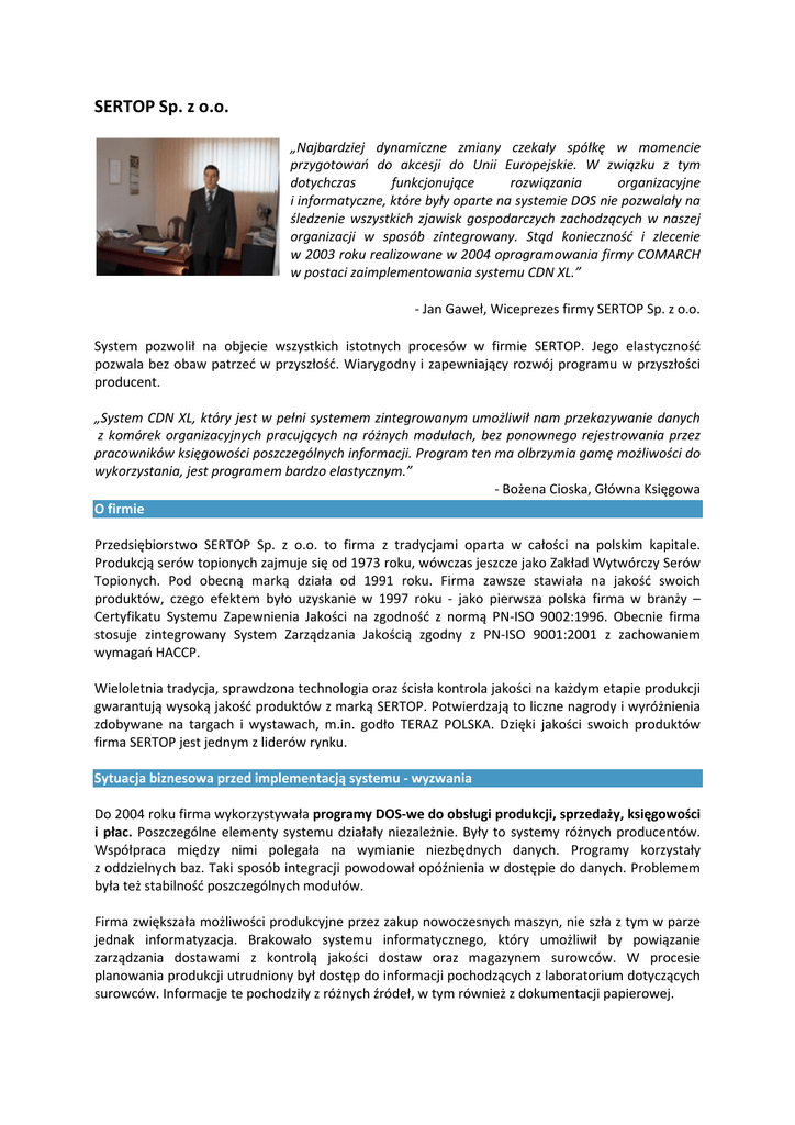 SERTOP Sp. z o.o. „Najbardziej dynamiczne zmiany czekały spółkę w momencie przygotowań do akcesji do Unii Europejskie. W związku z tym dotychczas funkcjonujące rozwiązania organizacyjne i informatyczne, które były oparte na systemie DOS nie pozwalały na śledzenie wszystkich zjawisk gospodarczych zachodzących w naszej organizacji w sposób zintegrowany. Stąd konieczność i zlecenie w 2003 roku realizowane w 2004 oprogramowania firmy COMARCH w postaci zaimplementowania systemu CDN XL.” - Jan Gaweł, Wiceprezes firmy SERTOP Sp. z o.o. System pozwolił na objecie wszystkich istotnych procesów w firmie SERTOP. Jego elastyczność pozwala bez obaw patrzeć w przyszłość. Wiarygodny i zapewniający rozwój programu w przyszłości producent. „System CDN XL, który jest w pełni systemem zintegrowanym umożliwił nam przekazywanie danych z komórek organizacyjnych pracujących na różnych modułach, bez ponownego rejestrowania przez pracowników księgowości poszczególnych informacji. Program ten ma olbrzymia gamę możliwości do wykorzystania, jest programem bardzo elastycznym.” - Bożena Cioska, Główna Księgowa O firmie Przedsiębiorstwo SERTOP Sp. z o.o. to firma z tradycjami oparta w całości na polskim kapitale. Produkcją serów topionych zajmuje się od 1973 roku, wówczas jeszcze jako Zakład Wytwórczy Serów Topionych. Pod obecną marką działa od 1991 roku. Firma zawsze stawiała na jakość swoich produktów, czego efektem było uzyskanie w 1997 roku - jako pierwsza polska firma w branży – Certyfikatu Systemu Zapewnienia Jakości na zgodność z normą PN-ISO 9002:1996. Obecnie firma stosuje zintegrowany System Zarządzania Jakością zgodny z PN-ISO 9001:2001 z zachowaniem wymagań HACCP. Wieloletnia tradycja, sprawdzona technologia oraz ścisła kontrola jakości na każdym etapie produkcji gwarantują wysoką jakość produktów z marką SERTOP. Potwierdzają to liczne nagrody i wyróżnienia zdobywane na targach i wystawach, m.in. godło TERAZ POLSKA. Dzięki jakości swoich produktów firma SERTOP jest jednym z liderów rynku. Sytuacja biznesowa przed implementacją systemu - wyzwania Do 2004 roku firma wykorzystywała programy DOS-we do obsługi produkcji, sprzedaży, księgowości i płac. Poszczególne elementy systemu działały niezależnie. Były to systemy różnych producentów. Współpraca między nimi polegała na wymianie niezbędnych danych. Programy korzystały z oddzielnych baz. Taki sposób integracji powodował opóźnienia w dostępie do danych. Problemem była też stabilność poszczególnych modułów. Firma zwiększała możliwości produkcyjne przez zakup nowoczesnych maszyn, nie szła z tym w parze jednak informatyzacja. Brakowało systemu informatycznego, który umożliwił by powiązanie zarządzania dostawami z kontrolą jakości dostaw oraz magazynem surowców. W procesie planowania produkcji utrudniony był dostęp do informacji pochodzących z laboratorium dotyczących surowców. Informacje te pochodziły z różnych źródeł, w tym również z dokumentacji papierowej. Koszty materiałowe były rejestrowane i rozliczane dopiero po zakończeniu miesiąca. System nie dawał wystarczającego wsparcia w procesie bieżącego planowania zapotrzebowania na materiały i planowania zleceń produkcyjnych. Ze względu na brak możliwości rozbudowy wykorzystywanych systemów, coraz trudniejsze było spełnianie wymagań formalnych stawianych przez powstające sieci handlowe, do których firma SERTOP dostarczała swoje produkty. Ponadto firma prowadziła i planowała dalszy rozwój eksportu swoich produktów nie tylko na terenie Europy ale również do Stanów Zjednoczonych. Używany system nie pozwalał na generowanie dokumentów wielojęzycznych. Problematyczne było księgowanie i rozliczanie operacji gospodarczych w różnych walutach. Dodatkowo SERTOP nie miał możliwości rejestrowania zamówień od odbiorców i kontrolowania stopnia ich realizacji, co szczególnie w przypadku współpracy z sieciami handlowymi było bardzo uciążliwe. Z powodu rejestrowania operacji w kilku systemach uzyskanie wielowymiarowych analiz produkcji, sprzedaży, kosztów było bardzo czasochłonne i praktycznie niemożliwe w czasie rzeczywistym. Ponieważ firma stawiała sobie za cel sprostanie wymogom najwyższych norm jakościowych spełniających jednocześnie wymagania HACCP konieczne było zastosowanie rozwiązania informatycznego wspierającego realizowane w firmie procesy. W związku z powyższym Spółka postawiła sobie za cel unowocześnienie firmy poprzez integrację systemu informatycznego na poziomie danych oraz aplikacji. Celem było aby wszystkie procesy zachodzące w firmie były obsługiwane przez jedną aplikację. Została podjęta decyzja o wdrożeniu zintegrowanego systemu zarządzania, stawiając jako główne kryteria wyboru: • System musi obejmować wszystkie istotne procesy w firmie • Możliwość dostosowania do specyficznych potrzeb firmy SERTOP, głównie w zakresie produkcji i laboratorium • Niezawodna, znana baza danych • System musi być sprawdzony na rynku • Producent oprogramowania musi być wiarygodny i zapewniający rozwój programu w przyszłości Rozwiązanie Firma SERTOP sp. z o.o. zdecydowała się na wybór systemu klasy ERP – Comarch CDN XL, ponieważ jego funkcjonalność obejmuje wszystkie obszary działalności firmy oraz jest systemem otwartym, pozwalającym na jego dostosowanie do potrzeb firmy. Specyfika produkcji wymagała zastosowania, oprócz standardowej funkcjonalności Comarch CDN XL, rozwiązań dedykowanych. Została przygotowana aplikacja do układania receptur, bazująca na danych o surowcach znajdujących się w magazynie. Do wprowadzania szczegółowych parametrów surowców został przygotowany moduł Laboratorium. Moduł umożliwił ewidencję wyników badania surowców, dodatków, badań międzyoperacyjnych, wyrobów gotowych oraz reklamacji. Umożliwiono automaty