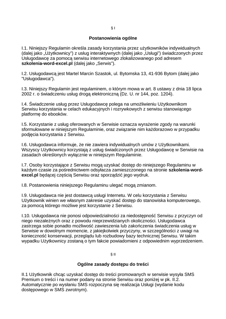 §I Postanowienia ogólne I.1. Niniejszy Regulamin określa zasady korzystania przez użytkowników indywidualnych (dalej jako „Użytkownicy”) z usług interaktywnych (dalej jako „Usługi”) świadczonych przez Usługodawcę za pomocą serwisu internetowego zlokalizowanego pod adresem szkolenia-word-excel.pl (dalej jako „Serwis”). I.2. Usługodawcą jest Martel Marcin Szastok, ul. Bytomska 13, 41-936 Bytom (dalej jako "Usługodawca"). I.3. Niniejszy Regulamin jest regulaminem, o którym mowa w art. 8 ustawy z dnia 18 lipca 2002 r. o świadczeniu usług drogą elektroniczną (Dz. U. nr 144, poz. 1204). I.4. Świadczenie usług przez Usługodawcę polega na umożliwieniu Użytkownikom Serwisu korzystania w celach edukacyjnych i rozrywkowych z serwisu stanowiącego platformę do ebooków. I.5. Korzystanie z usług oferowanych w Serwisie oznacza wyrażenie zgody na warunki sformułowane w niniejszym Regulaminie, oraz związanie nim każdorazowo w przypadku podjęcia korzystania z Serwisu. I.6. Usługodawca informuje, że nie zawiera indywidualnych umów z Użytkownikami. Wszyscy Użytkownicy korzystają z usług świadczonych przez Usługodawcę w Serwisie na zasadach określonych wyłącznie w niniejszym Regulaminie. I.7. Osoby korzystające z Serwisu mogą uzyskać dostęp do niniejszego Regulaminu w każdym czasie za pośrednictwem odsyłacza zamieszczonego na stronie szkolenia-wordexcel.pl będącej częścią Serwisu oraz sporządzić jego wydruk. I.8. Postanowienia niniejszego Regulaminu ulegać mogą zmianom. I.9. Usługodawca nie jest dostawcą usługi Internetu. W celu korzystania z Serwisu Użytkownik winien we własnym zakresie uzyskać dostęp do stanowiska komputerowego, za pomocą którego możliwe jest korzystanie z Serwisu. I.10. Usługodawca nie ponosi odpowiedzialności za niedostępność Serwisu z przyczyn od niego niezależnych oraz z powodu nieprzewidzianych okoliczności. Usługodawca zastrzega sobie ponadto możliwość zawieszenia lub zakończenia świadczenia usług w Serwisie w dowolnym momencie, z jakiejkolwiek przyczyny, w szczególności z uwagi na konieczność konserwacji, przeglądu lub rozbudowy bazy technicznej Serwisu. W takim wypadku Użytkownicy zostaną o tym fakcie powiadomieni z odpowiednim wyprzedzeniem. § II Ogólne zasady dostępu do treści II.1 Użytkownik chcąc uzyskać dostęp do treści promowanych w serwisie wysyła SMS Premium o treści i na numer podany na stronie Serwisu oraz poniżej w pk. II.2. Automatycznie po wysłaniu SMS rozpoczyna się realizacja Usługi (wydanie kodu dostępowego w SMS zwrotnym). II.2. Koszt Usługi wynosi odpowiednio: – 0.62 PLN brutto za SMS o treści AP.EXNASTART wysłany na numer 70068 – 1.23 PLN brutto za SMS o treści AP.EXPLUS wysłany na numer 71068 – 2.46 PLN brutto za SMS o treści AP.EXBASIC wysłany na numer 72068 – 3.69 PLN brutto za SMS o treści AP.EXPREMIUM wysłany na numer 73068 – 4.92 PLN brutto za SMS o treści AP.EXPRO wysłany na numer 74068 – 11.07 PLN brutto za SMS o treści AP.EXTULTRA wysłany na numer 79068 II.3. Użytkownik może zareklamować proces realizacji usługi bezpośrednio u operatora serwisu (należy wypełnić formularz pod adresem http://www.dotpay.pl/reklamacje) lub u usługodawcy (należy wysłać e-mail na adres [email protected]). II.4. Usługa jest dostępna na terenie Polski we wszystkich sieciach komórkowych (Tmobile, Plus GSM, Orange, Play oraz operatorów wirtualnych). II.5. Usługę Premium SMS obsługuje Eurokoncept, grupa Dotpay. Regulamin: www.dotpay.eu/regulaminsms/ § III Polityka prywatności III.1. Dokonując wysłania wiadomości SMS, Użytkownik przekazuje dane go dotyczące Usługodawcy, który jest uprawniony do dysponowania nimi na zasadach określonych w niniejszym Regulaminie. III.2. Przetwarzanie informacji dotyczących Użytkowników, w tym mających charakter danych osobowych informacji dotyczących Użytkowników, następuje zgodnie z ustawą o ochronie danych osobowych i ustawą o świadczeniu usług drogą elektroniczną. III.3. Dla celów świadczenia usług w Serwisie Usługodawca przetwarza dane Użytkowników takie jak numer telefonu jak również numer IP Użytkownika oraz unikalny numer identyfikacyjny generowany na podstawie konfiguracji sprzętowej i programowej komputera. III.4. Użytkownik może w każdym czasie żądać uzupełnienia, zmiany lub usunięcia przez Usługodawcę swoich danych przetwarzanych w Serwisie, o których mowa w punkcie III.3. Żądanie Użytkownika zmiany lub usunięcia tych danych, jest jednoznaczne z żądaniem usunięcia Konta Użytkownika. III.5. Usługodawca nie posługuje się plikami typu cookie w celu gromadzenia informacji związanych korzystaniem z Serwisu przez Użytkownika. III.6. Usługodawca zastrzega sobie prawo do przetwarzania danych o anonimowym charakterze, które nie pozwalają na jednoznaczną identyfikację osób, w szczególności o płci, wieku, profesji i zainteresowaniach Użytkowników oraz innych podobnych informacji, jak również danych dotyczących rozkładu tygodniowego miesięcznego i rocznego korzystania z Serwisu. Dane te nie będą łączone z innymi danymi o indywidualnych Użytkownikach, też szczególności nie będą zestawiane z danymi mogącymi pozwolić na identyfikację Użytkowników. Dane te wykorzystywane będą przez Usługodawcę wyłącznie w celu polepszenia jakości usług świadczonych w Serwisie. § IV Odpowiedzialność Usługodawcy IV.1. Usługodawca nie ponosi odpowiedzialności w stosunku do osób korzystających z Serwisu za żadne, pośrednie lub bezpośrednie, straty lub szkody, utratę jakichkolwiek danych, zysków, przychodów, przedsięwzięć jakkolwiek byłaby ona spowodowana za wyjątkiem szkody wynikającej z winy umyślnej lub rażącego niedbalstwa Usługodawcy lub jego pracowników. Usługodawca nie odpowiada również za jakiekolwiek uchybienia w wykonywaniu jego obowiązków wynikających z niniejszego Regulaminu s