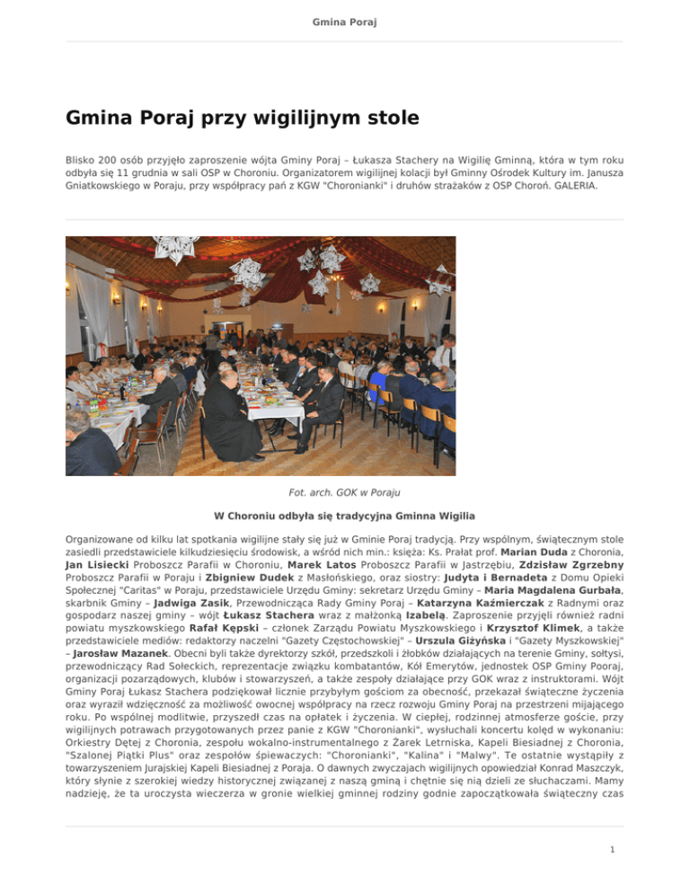 Gmina Poraj Gmina Poraj przy wigilijnym stole Blisko 200 osób przyjęło zaproszenie wójta Gminy Poraj – Łukasza Stachery na Wigilię Gminną, która w tym roku odbyła się 11 grudnia w sali OSP w Choroniu. Organizatorem wigilijnej kolacji był Gminny Ośrodek Kultury im. Janusza Gniatkowskiego w Poraju, przy współpracy pań z KGW "Choronianki" i druhów strażaków z OSP Choroń. GALERIA. Fot. arch. GOK w Poraju W Choroniu odbyła się tradycyjna Gminna Wigilia Organizowane od kilku lat spotkania wigilijne stały się już w Gminie Poraj tradycją. Przy wspólnym, świątecznym stole zasiedli przedstawiciele kilkudziesięciu środowisk, a wśród nich min.: księża: Ks. Prałat prof. Marian Duda z Choronia, Jan Lisiecki Proboszcz Parafii w Choroniu, Marek Latos Proboszcz Parafii w Jastrzębiu, Zdzisław Zgrzebny Proboszcz Parafii w Poraju i Zbigniew Dudek z Masłońskiego, oraz siostry: Judyta i Bernadeta z Domu Opieki Społecznej "Caritas" w Poraju, przedstawiciele Urzędu Gminy: sekretarz Urzędu Gminy – Maria Magdalena Gurbała, skarbnik Gminy – Jadwiga Zasik, Przewodnicząca Rady Gminy Poraj – Katarzyna Kaźmierczak z Radnymi oraz gospodarz naszej gminy – wójt Łukasz Stachera wraz z małżonką Izabelą. Zaproszenie przyjęli również radni powiatu myszkowskiego Rafał Kępski – członek Zarządu Powiatu Myszkowskiego i Krzysztof Klimek, a także przedstawiciele mediów: redaktorzy naczelni "Gazety Częstochowskiej" – Urszula Giżyńska i "Gazety Myszkowskiej" – Jarosław Mazanek. Obecni byli także dyrektorzy szkół, przedszkoli i żłobków działających na terenie Gminy, sołtysi, przewodniczący Rad Sołeckich, reprezentacje związku kombatantów, Kół Emerytów, jednostek OSP Gminy Pooraj, organizacji pozarządowych, klubów i stowarzyszeń, a także zespoły działające przy GOK wraz z instruktorami. Wójt Gminy Poraj Łukasz Stachera podziękował licznie przybyłym gościom za obecność, przekazał świąteczne życzenia oraz wyraził wdzięczność za możliwość owocnej współpracy na rzecz rozwoju Gminy Poraj na przestrzeni mijającego roku. Po wspólnej modlitwie, przyszedł czas na opłatek i życzenia. W ciepłej, rodzinnej atmosferze goście, przy wigilijnych potrawach przygotowanych przez panie z KGW "Choronianki", wysłuchali koncertu kolęd w wykonaniu: Orkiestry Dętej z Choronia, zespołu wokalno-instrumentalnego z Żarek Letrniska, Kapeli Biesiadnej z Choronia, "Szalonej Piątki Plus" oraz zespołów śpiewaczych: "Choronianki", "Kalina" i "Malwy". Te ostatnie wystąpiły z towarzyszeniem Jurajskiej Kapeli Biesiadnej z Poraja. O dawnych zwyczajach wigilijnych opowiedział Konrad Maszczyk, który słynie z szerokiej wiedzy historycznej związanej z naszą gminą i chętnie się nią dzieli ze słuchaczami. Mamy nadzieję, że ta uroczysta wieczerza w gronie wielkiej gminnej rodziny godnie zapoczątkowała świąteczny czas 1 Gmina Poraj wielkiego oczekiwania na Święta Bożego Narodzenia w naszych domach. Wesołych świąt! Zdjęcia z Gminnej Wigilii 2015: Foto: arch. GOK w Poraju 2