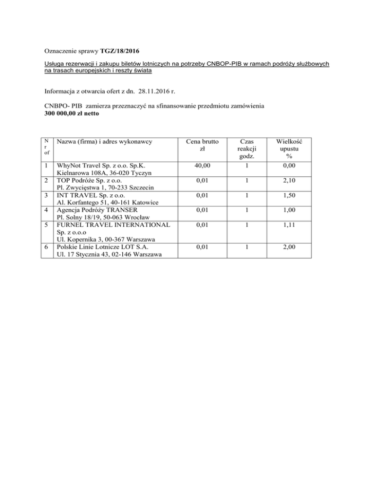 Oznaczenie sprawy TGZ/18/2016 Usługa rezerwacji i zakupu biletów lotniczych na potrzeby CNBOP-PIB w ramach podróży służbowych na trasach europejskich i reszty świata Informacja z otwarcia ofert z dn. 28.11.2016 r. CNBPO- PIB zamierza przeznaczyć na sfinansowanie przedmiotu zamówienia 300 000,00 zł netto N r of Nazwa (firma) i adres wykonawcy 1 WhyNot Travel Sp. z o.o. Sp.K. Kielnarowa 108A, 36-020 Tyczyn TOP Podróże Sp. z o.o. Pl. Zwycięstwa 1, 70-233 Szczecin INT TRAVEL Sp. z o.o. Al. Korfantego 51, 40-161 Katowice Agencja Podróży TRANSER Pl. Solny 18/19, 50-063 Wrocław FURNEL TRAVEL INTERNATIONAL Sp. z o.o.o Ul. Kopernika 3, 00-367 Warszawa Polskie Linie Lotnicze LOT S.A. Ul. 17 Stycznia 43, 02-146 Warszawa 2 3 4 5 6 40,00 Czas reakcji godz. 1 Wielkość upustu % 0,00 0,01 1 2,10 0,01 1 1,50 0,01 1 1,00 0,01 1 1,11 0,01 1 2,00 Cena brutto zł