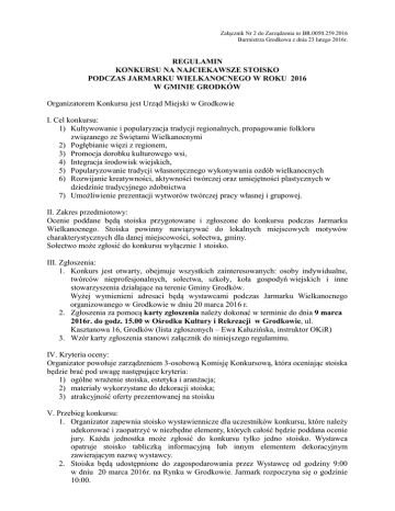 Załącznik Nr 2 do Zarządzenia nr BR.0050.259.2016 Burmistrza Grodkowa z dnia 23 lutego 2016r. REGULAMIN KONKURSU NA NAJCIEKAWSZE STOISKO PODCZAS JARMARKU WIELKANOCNEGO W ROKU 2016 W GMINIE GRODKÓW Organizatorem Konkursu jest Urząd Miejski w Grodkowie I. Cel konkursu: 1) Kultywowanie i popularyzacja tradycji regionalnych, propagowanie folkloru związanego ze Świętami Wielkanocnymi 2) Pogłębianie więzi z regionem, 3) Promocja dorobku kulturowego wsi, 4) Integracja środowisk wiejskich, 5) Popularyzowanie tradycji własnoręcznego wykonywania ozdób wielkanocnych 6) Rozwijanie kreatywności, aktywności twórczej oraz umiejętności plastycznych w dziedzinie tradycyjnego zdobnictwa 7) Umożliwienie prezentacji wytworów twórczej pracy własnej i grupowej. II. Zakres przedmiotowy: Ocenie poddane będą stoiska przygotowane i zgłoszone do konkursu podczas Jarmarku Wielkanocnego. Stoiska powinny nawiązywać do lokalnych miejscowych motywów charakterystycznych dla danej miejscowości, sołectwa, gminy. Sołectwo może zgłosić do konkursu wyłącznie 1 stoisko. III. Zgłoszenia: 1. Konkurs jest otwarty, obejmuje wszystkich zainteresowanych: osoby indywidualne, twórców nieprofesjonalnych, sołectwa, szkoły, koła gospodyń wiejskich i inne stowarzyszenia działające na terenie Gminy Grodków. Wyżej wymienieni adresaci będą wystawcami podczas Jarmarku Wielkanocnego organizowanego w Grodkowie w dniu 20 marca 2016 r. 2. Zgłoszenia za pomocą karty zgłoszenia należy dokonać w terminie do dnia 9 marca 2016r. do godz. 15.00 w Ośrodku Kultury i Rekreacji w Grodkowie, ul. Kasztanowa 16, Grodków (lista zgłoszonych – Ewa Kałuzińska, instruktor OKiR) 3. Wzór karty zgłoszenia stanowi załącznik do niniejszego regulaminu. IV. Kryteria oceny: Organizator powołuje zarządzeniem 3-osobową Komisję Konkursową, która oceniając stoiska będzie brać pod uwagę następujące kryteria: 1) ogólne wrażenie stoiska, estetyka i aranżacja; 2) materiały wykorzystane do dekoracji stoiska; 3) atrakcyjność oferty prezentowanej na stoisku V. Przebieg konkursu: 1. Organizator zapewnia stoisko wystawiennicze dla uczestników konkursu, które należy udekorować i zaopatrzyć w niezbędne elementy, których całość będzie poddana ocenie jury. Każda jednostka może zgłosić do konkursu tylko jedno stoisko. Wystawca opatruje stoisko tabliczką informacyjną lub innym elementem dekoracyjnym zawierającym nazwę wystawcy. 2. Stoiska będą udostępnione do zagospodarowania przez Wystawcę od godziny 9:00 w dniu 20 marca 2016r. na Rynku w Grodkowie. Jarmark rozpoczyna się o godzinie 10:00. 3. Ogłoszenie wyników konkursu i wręczenie nagród nastąpi w dniu trwania konkursu do godz. 13:00. 4. Po zakończeniu Jarmarku stoiska konkursowe można zdemontować. VI. Nagrody: Dla 3 najwyżej ocenionych palm organizator przewiduje nagrody. Organizator zastrzega sobie prawo do innego podziału nagród. . VII. Postanowienia końcowe: 1. Komisja konkursu jest niezawisła w swojej ocenie. Jej werdykt jest niepodważalny i ostateczny. Przebieg prac komisji jest udokumentowany w protokole. 2. Udział w konkursie jest jednoznaczny z wyrażeniem zgody przez każdego uczestnika na wykorzystanie i przetwarzanie swoich danych osobowych przez Organizatora w celu wyłonienia zwycięzcy i przyznania nagrody; umieszczenia danych w materiałach publikowanych przez Organizatora i na stronie internetowej Organizatora; promocji konkursu lub idei konkursu. W sprawach organizacyjnych proszę kontaktować się z organizatorami konkursu: Urząd Miejski w Grodkowie Dorota Zawadzka, tel. 77 40 40 345