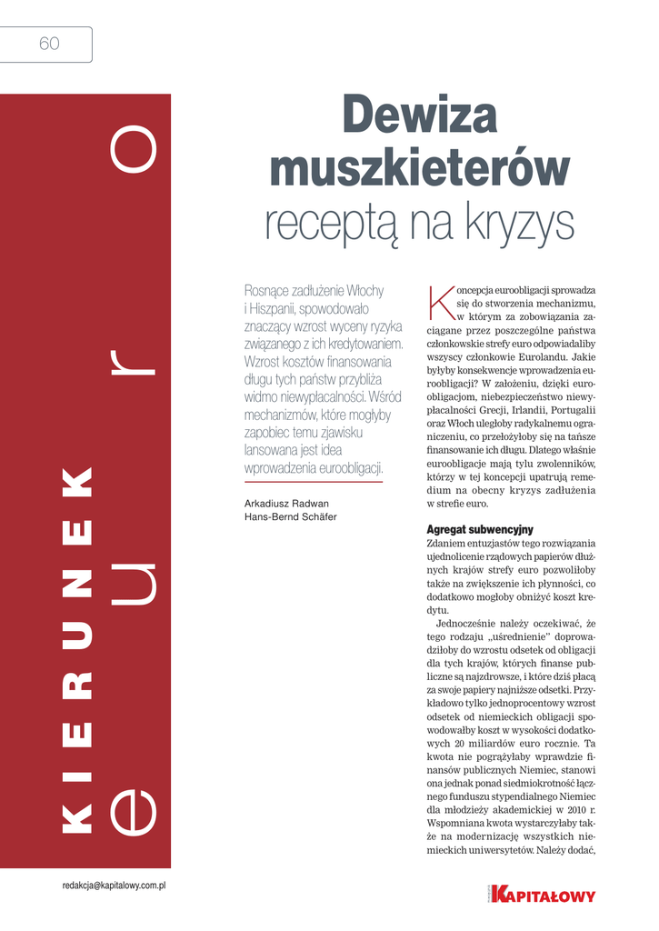 e u K I E R U N E K r o 60 [email protected] Dewiza muszkieterów receptą na kryzys Rosnące zadłużenie Włochy i Hiszpanii, spowodowało znaczący wzrost wyceny ryzyka związanego z ich kredytowaniem. Wzrost kosztów finansowania długu tych państw przybliża widmo niewypłacalności. Wśród mechanizmów, które mogłyby zapobiec temu zjawisku lansowana jest idea wprowadzenia euroobligacji. Arkadiusz Radwan Hans-Bernd Schäfer oncepcja euroobligacji sprowadza się do stworzenia mechanizmu, w którym za zobowiązania zaciągane przez poszczególne państwa członkowskie strefy euro odpowiadaliby wszyscy członkowie Eurolandu. Jakie byłyby konsekwencje wprowadzenia euroobligacji? W założeniu, dzięki euroobligacjom, niebezpieczeństwo niewypłacalności Grecji, Irlandii, Portugalii oraz Włoch uległoby radykalnemu ograniczeniu, co przełożyłoby się na tańsze finansowanie ich długu. Dlatego właśnie euroobligacje mają tylu zwolenników, którzy w tej koncepcji upatrują remedium na obecny kryzys zadłużenia w strefie euro. K Agregat subwencyjny Zdaniem entuzjastów tego rozwiązania ujednolicenie rządowych papierów dłużnych krajów strefy euro pozwoliłoby także na zwiększenie ich płynności, co dodatkowo mogłoby obniżyć koszt kredytu. Jednocześnie należy oczekiwać, że tego rodzaju „uśrednienie” doprowadziłoby do wzrostu odsetek od obligacji dla tych krajów, których finanse publiczne są najzdrowsze, i które dziś płacą za swoje papiery najniższe odsetki. Przykładowo tylko jednoprocentowy wzrost odsetek od niemieckich obligacji spowodowałby koszt w wysokości dodatkowych 20 miliardów euro rocznie. Ta kwota nie pogrążyłaby wprawdzie finansów publicznych Niemiec, stanowi ona jednak ponad siedmiokrotność łącznego funduszu stypendialnego Niemiec dla młodzieży akademickiej w 2010 r. Wspomniana kwota wystarczyłaby także na modernizację wszystkich niemieckich uniwersytetów. Należy dodać, | Kierunek euro że jest to dość powściągliwe oszacowanie – nie można również wykluczyć dwukrotnie bądź trzykrotnie wyższej sumy. Zgodnie z prognozami niemieckiego instytutu badawczego IFO, Niemcy musieliby rocznie wyłożyć dodatkowo od 33 do 45 mld euro na finansowanie własnego długu, gdyby ich rząd gwarantował również zadłużenie innych krajów. Nie można nadto tracić z oczu efektów pośrednich, takich jak wpływ wzrostu odsetek od obligacji rządowych na podrożenie kredytów inwestycyjnych i konsumpcyjnych, oferowanych dla firm i ludności. W przypadku państw o relatywnie zdrowych finansach publicznych, euroobligacje byłyby zatem swoistą karą nałożoną na rządy oraz kredytobiorców prywatnych (a pośrednio także na podatników oraz odbiorców świadczeń socjalnych, zwłaszcza emerytów) za trzymanie własnego długu publicznego w ryzach. Powtórka z subprime? Przy przekształceniu wszystkich długów państwowych strefy euro w euroobligacje, ryzyko państw gwarantujących wypłacalność systemu ulega zwielokrotnieniu, przy czym trudno jest oszacować jej prawdopodobieństwo. Być może dlatego w dyskusji na temat euroobligacji niektóre agencje ratingowe sugerują, że taka hybryda otrzymałaby ocenę wiarygodności bliższą ratingowi najsłabszego ogniwa, a nie średniej ocen partycypujących w systemie państw. Pojawiają się nawet skrajne opinie, jak na przykład wygłoszona przez Moritza Kraemera z Standard & Poor’s, według której, euroobligacja dostałaby rating CC – obecny rating Grecji. Również argument oparty na poprawie płynności bywa kontestowany przez niektórych analityków. Wprawdzie euroobligacje, tworząc jeden rynek dla wszystkich państw uczestniczących, stałyby się aktywami o dużej płynności, jednakże mechanizm przekładania się podwyższonej płynności na obniżony koszt długu nie jest oczywisty. Według danych empirycznych, na które wskazuje Daniel Gros z CEPS, różnice stawek oprocentowania między obligacjami dużych i małych emitentów strefy euro z ratingiem AAA (na przykład pomiędzy Niemcami a Austrią) wynoszą 30-50 punktów bazowych, czyli mniej, niż można by teoretycznie oczekiwać. Politykę sztucznie subsydiowanego kredytowania świat przerabiał już zresztą zupełnie niedawno po drugiej stronie Atlantyku, przy okazji kryzysu subprime. Tam również realizacja szczytnego celu społecznego doprowadziła do zachwiania mechanizmu rynkowego, i w konsekwencji do załamania na rynku nieruchomości, które – za pośrednictwem instrumentów finansowych emitowanych w ramach sekurytyzacji – doprowadziło do zainfekowania międzynarodowych instytucji finansowych. Karta kredytowa bogatego wujka Czy euroobligacje pozwoliłyby na uratowanie euro? To zależy od tego, jaki zakres autonomii miałyby pojedyncze kraje strefy euro przy zaciąganiu kredytów, po ewentualnym wprowadzeniu euroobligacji. Jeżeli wszystko pozostanie jak dawniej, każde państwo będzie mogło się zadłużać w takim stopniu, w jakim chce. Europejskie kryteria stabilności nie będą przestrzegane, ponieważ sankcje za ich łamanie w dalszym ciągu pozostaną bardziej hipotetyczne, niż realne. Dla słabszych krajów będzie zatem istniała pokusa dalszego zadłużania się, ponieważ w razie niewypłacalności, za ich długi odpowiadać będą kraje o większej dyscyplinie finansów publicznych. Sytuacja ta będzie porównywalna do sytuacji, gdy bogaty wujek zakłada wspólnie z bratankiem konto bankowe. Bratanek, co prawda, będzie nieustannie upominany przez wujka, aby nie pobierać pieniędzy, jednakże żadne radykalne środki nie zostaną podjęte dopóki wujek nie zostanie zrujnowany i bank nie zablokuje konta. W krótkim czasie euroobligacje przyniosłyby ulgę krajom pogrążonym w kryzysie, w dłuższej zaś perspektywie spowodowałyby chaos w strefie euro, gdzie kraje strefy euro samodzielnie mogłyby ustalać swój deficyt budżetowy. Możliwości realizacji takiego scenariusza 